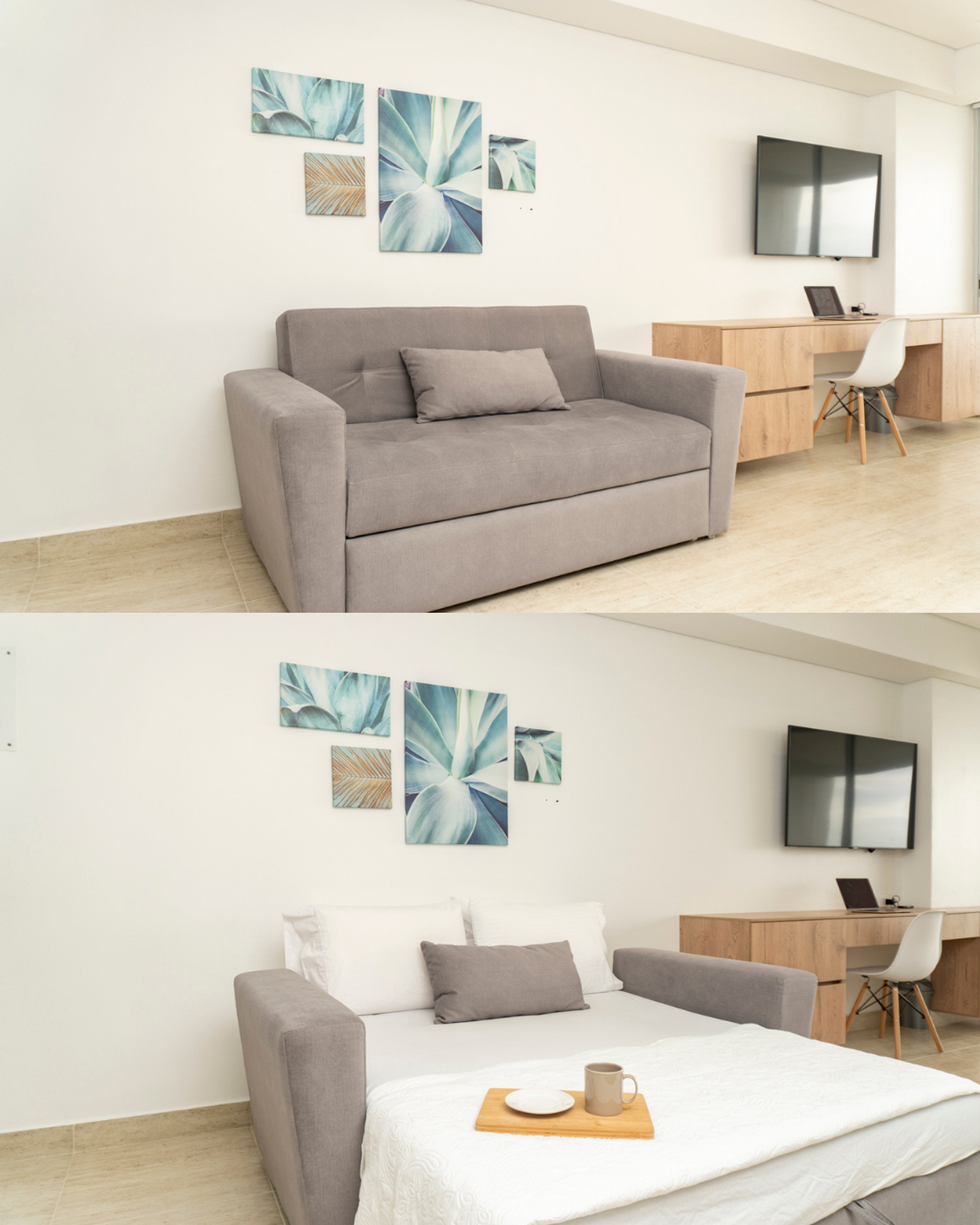 • Sofá cama adicional, práctico para familias o grupos pequeños.