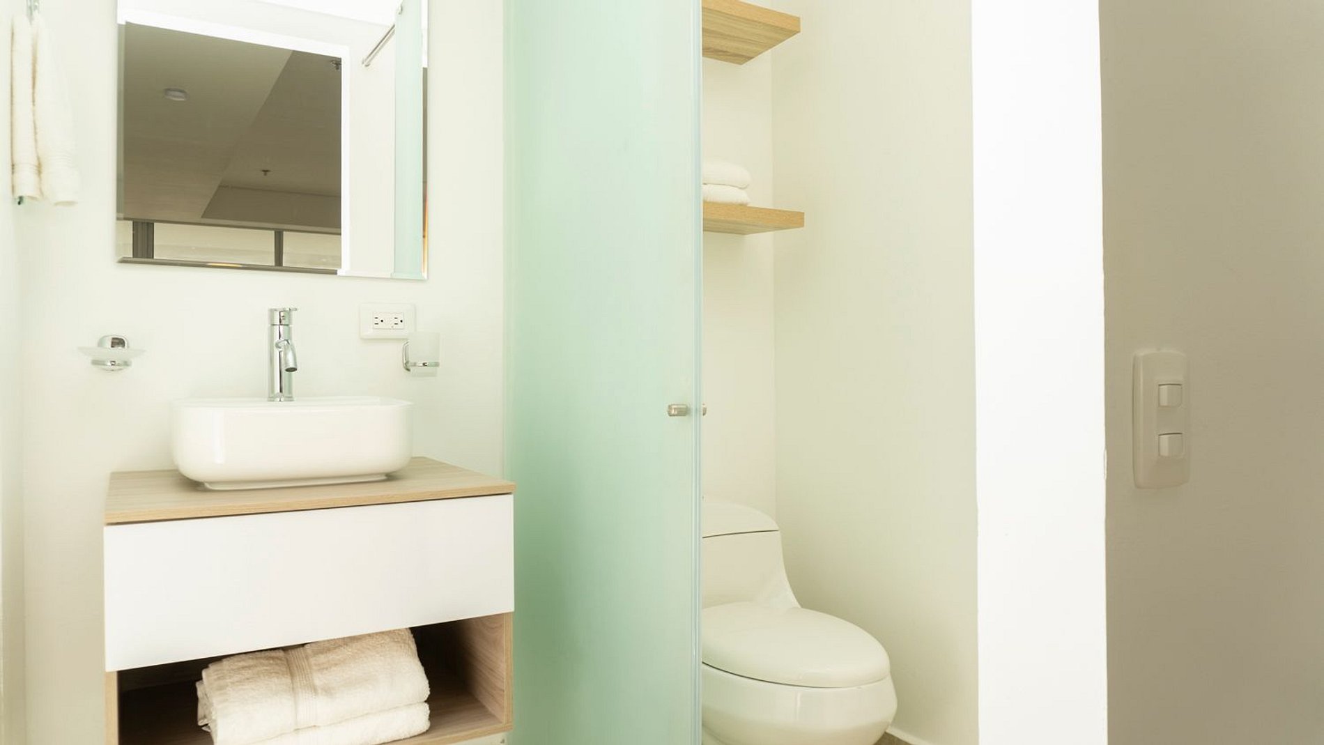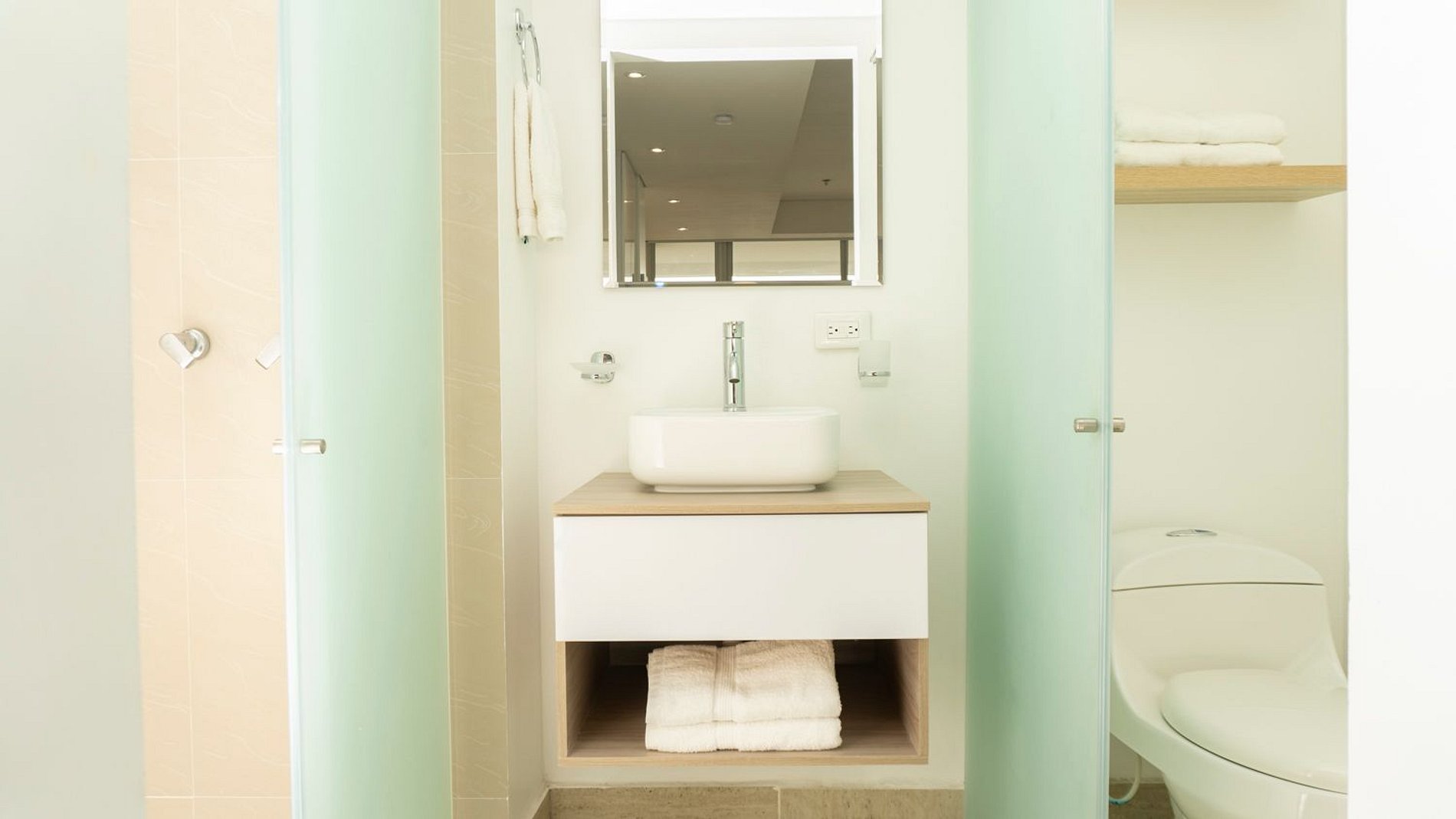 • Baño contemporáneo con: Toallas de alta calidad. Amenities en dispensadores modernos. Lavamanos con espacio de almacenamiento.