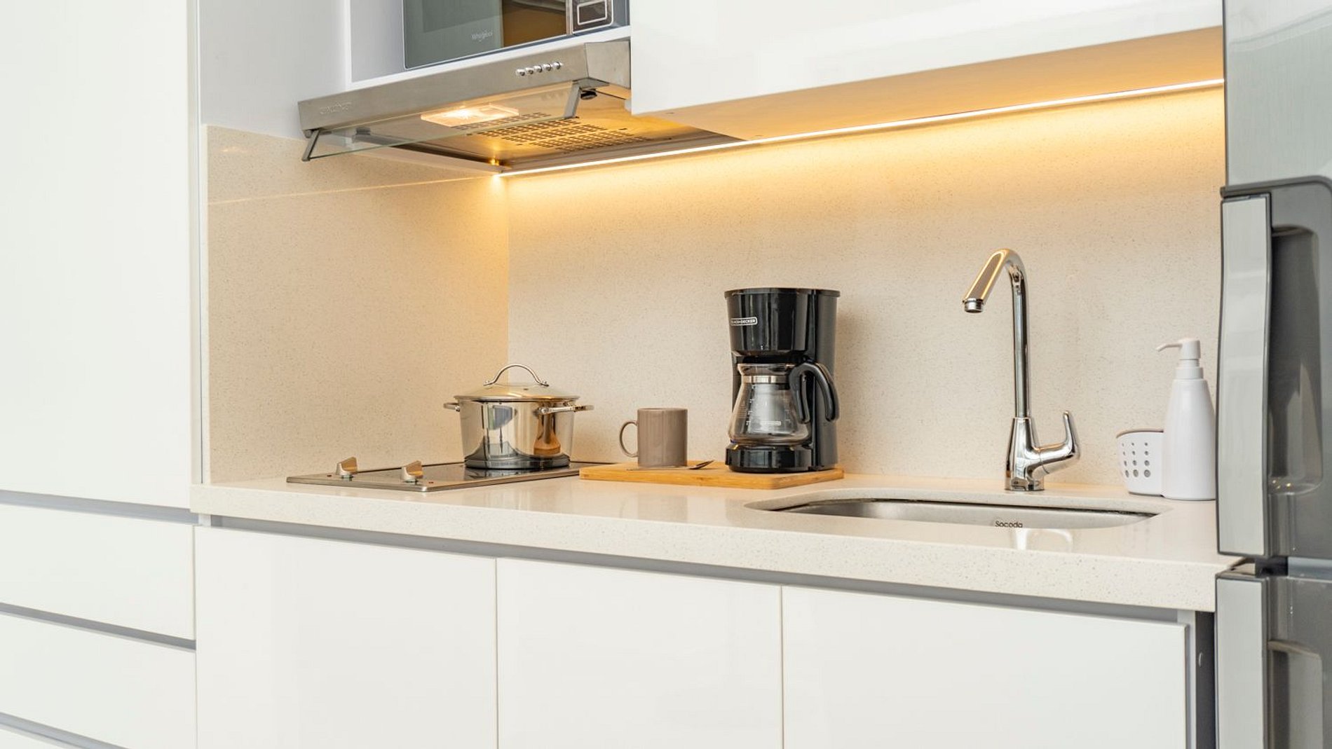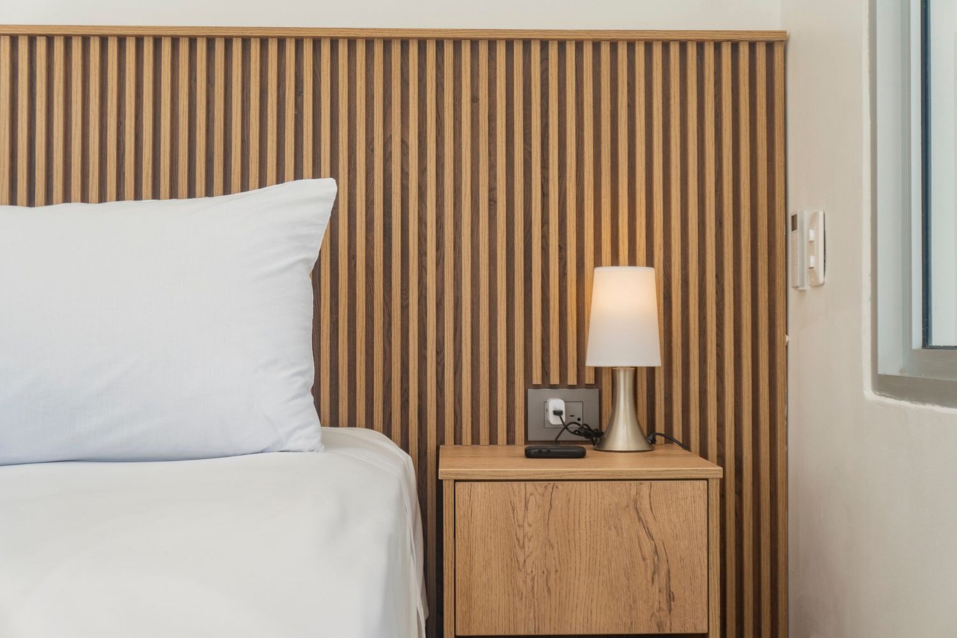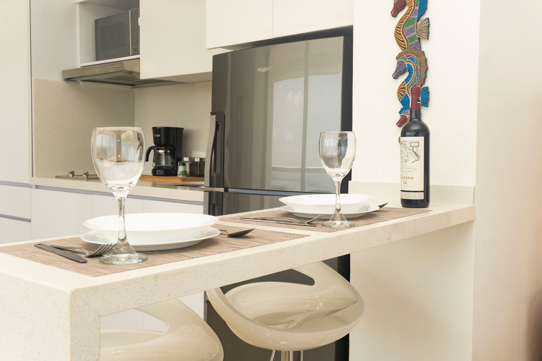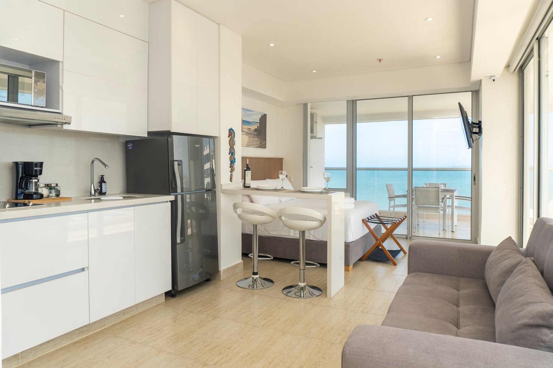 Suite de esquina con balcón al mar, cama doble y sofá cama. Cocina equipada con barra, baño de diseño y Smart TV. Wifi ultra rápido ideal para teletrabajo y comedor exterior para disfrutar la vista.
