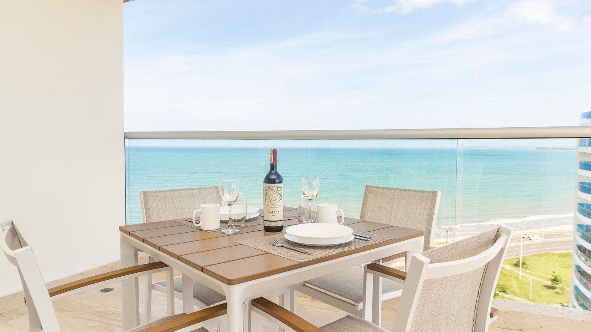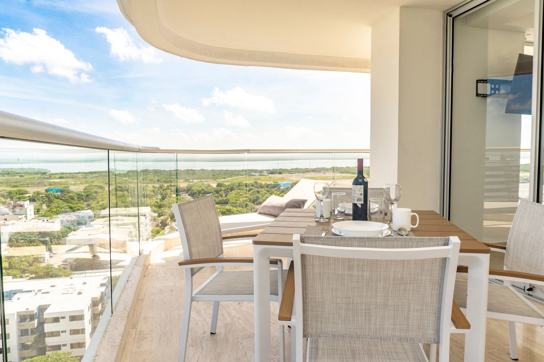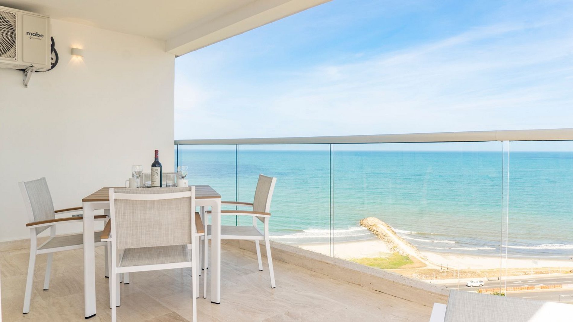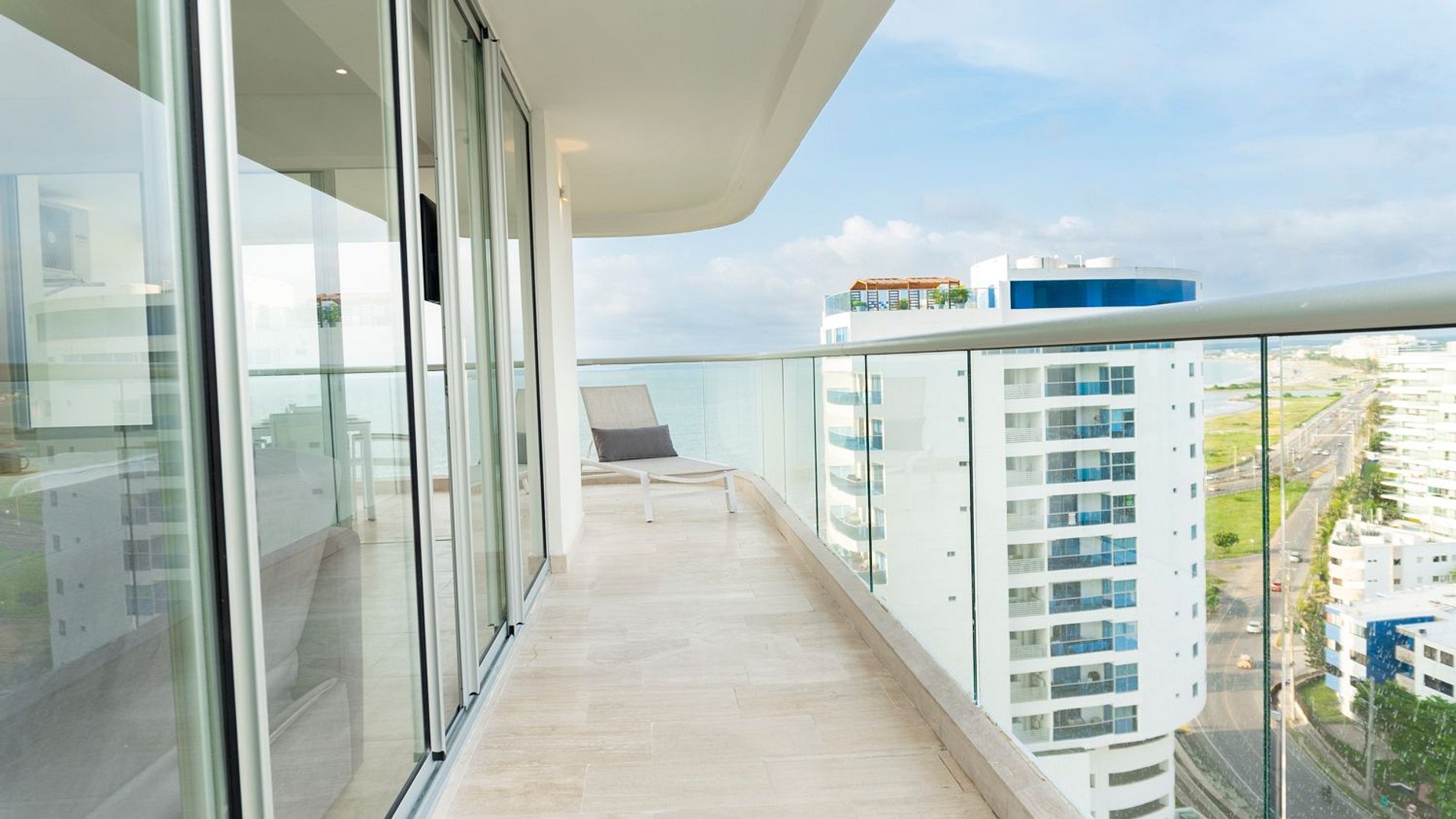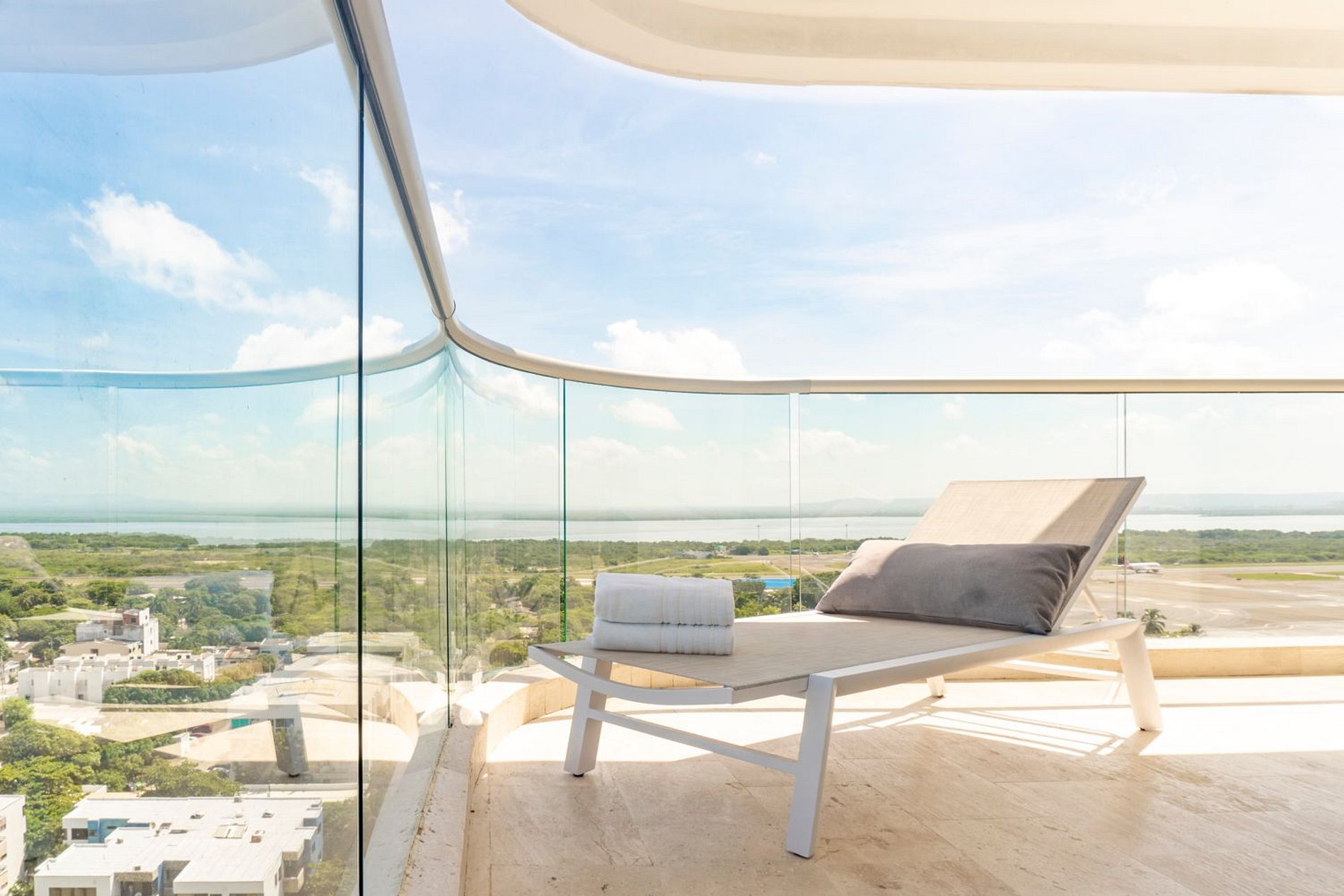 Suite esquinera, piso 14, con balcón envolvente y vista abierta al mar y la ciudad. Interior luminoso con cama King, sofá cama, aire acondicionado y Smart TV. Cocina integral con barra para 2, nevera, estufa, microondas, cafetera y menaje completo. Baño moderno con ducha en vidrio, amenities y secador. Ingreso con chapa digital y wifi ultra rápido. En Cartagena Beach disfruta de piscina semiolímpica, piscina infantil y jacuzzi, seguridad 24/7 y ubicación a minutos del aeropuerto y de Playa Azul