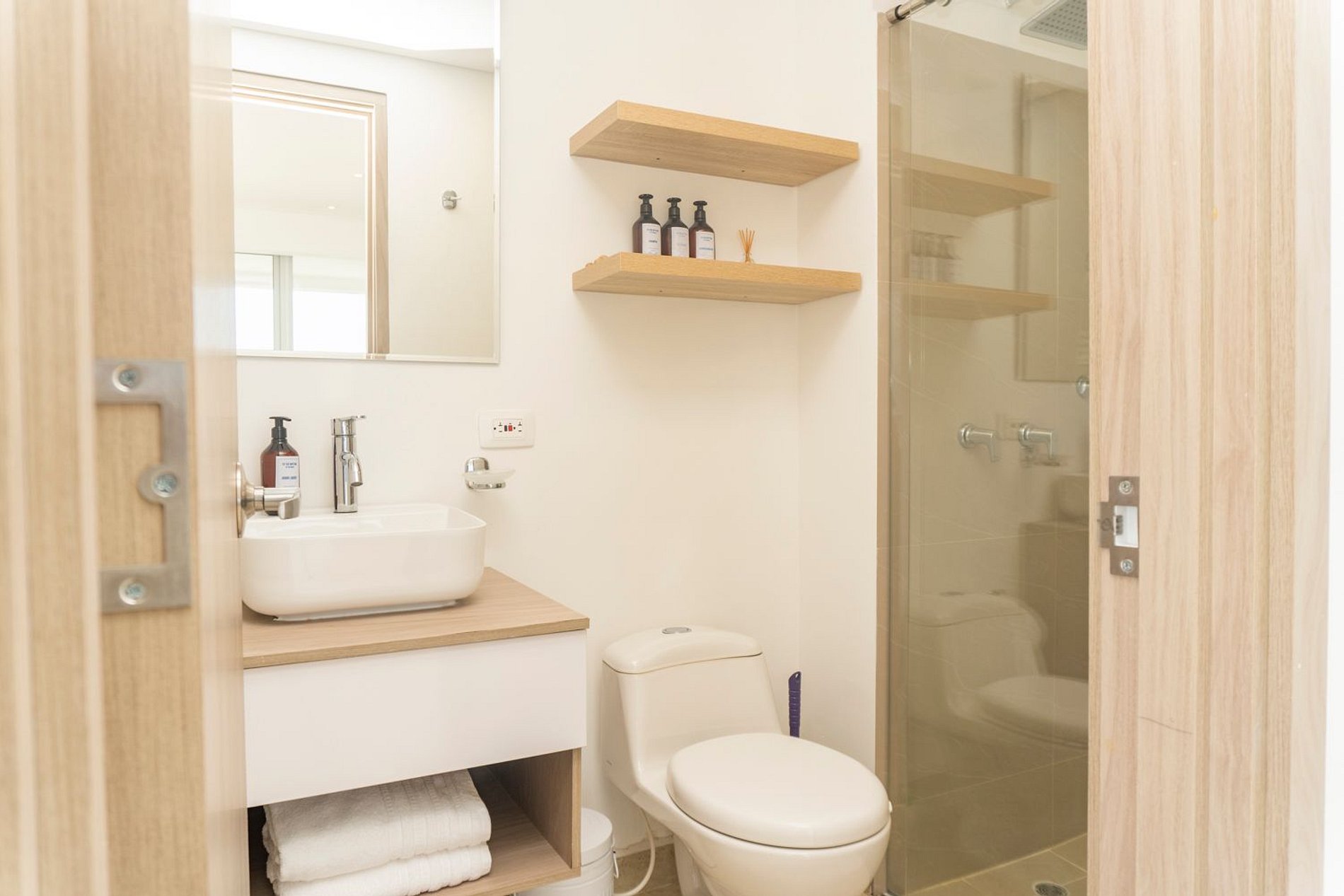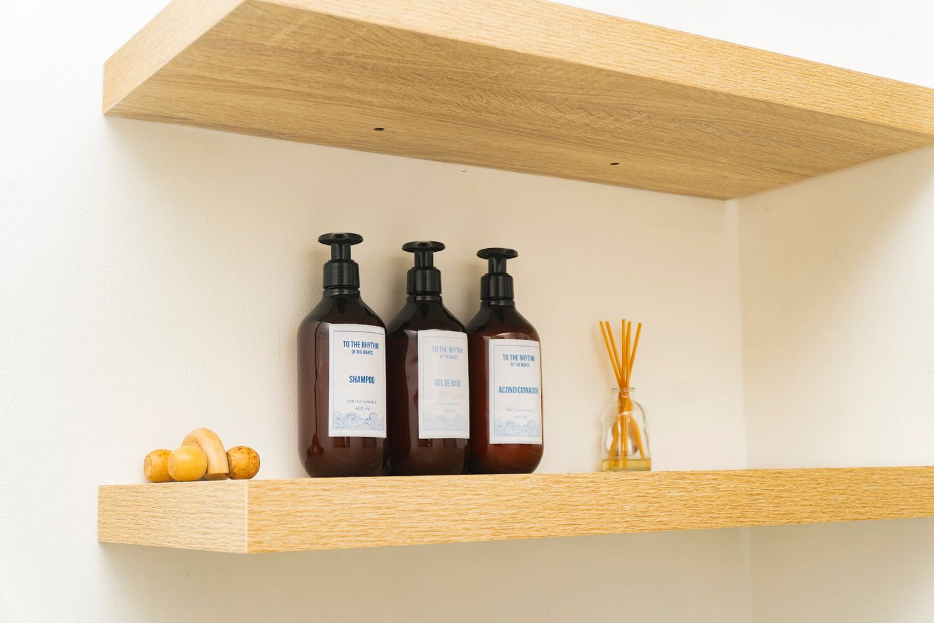 • Baño moderno: ducha en vidrio, amenities rellenables y secador