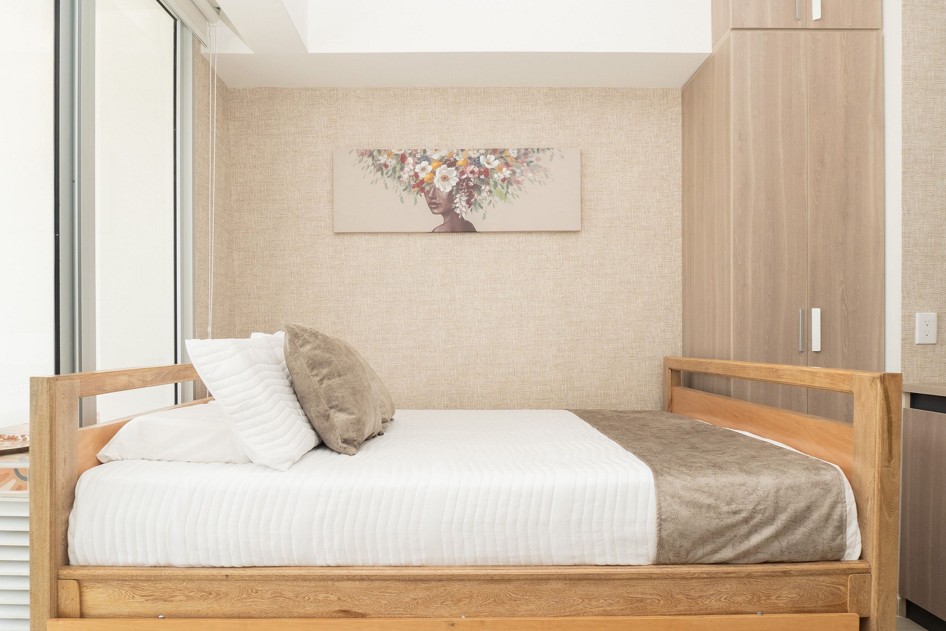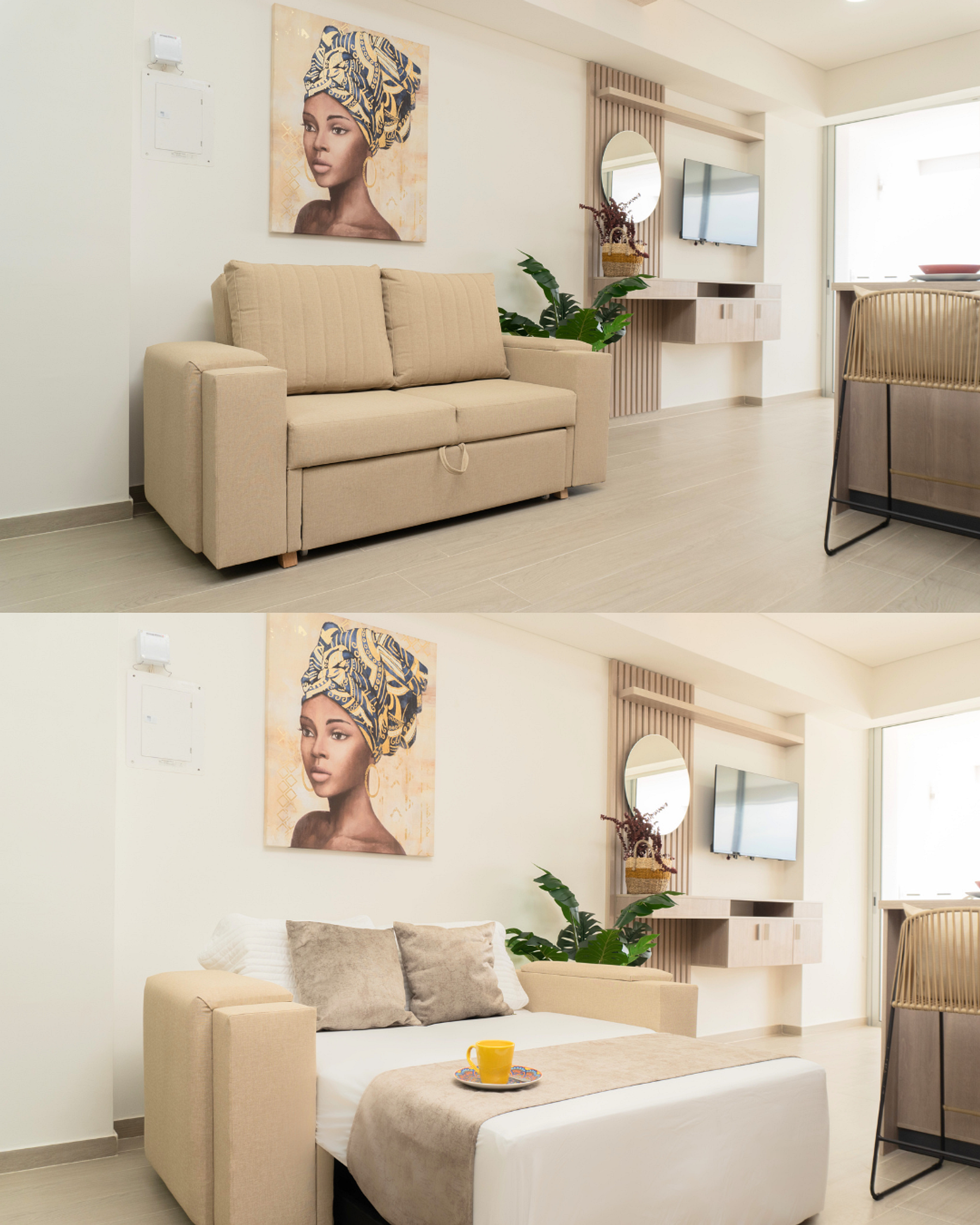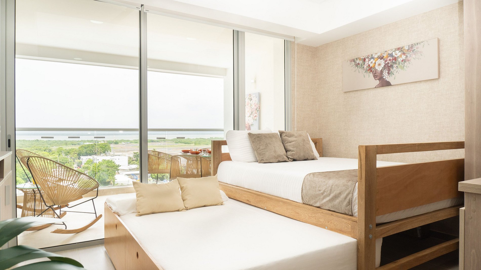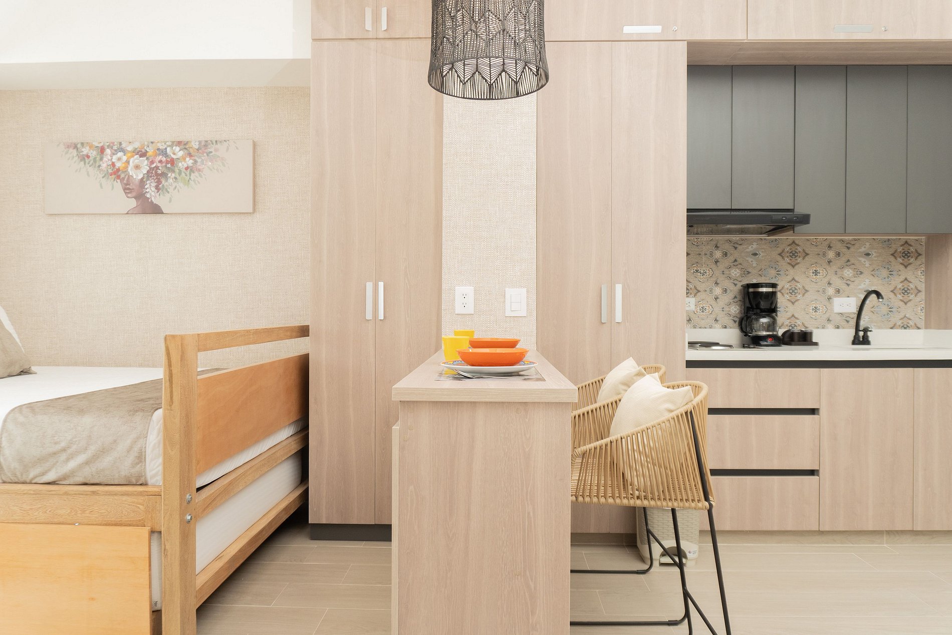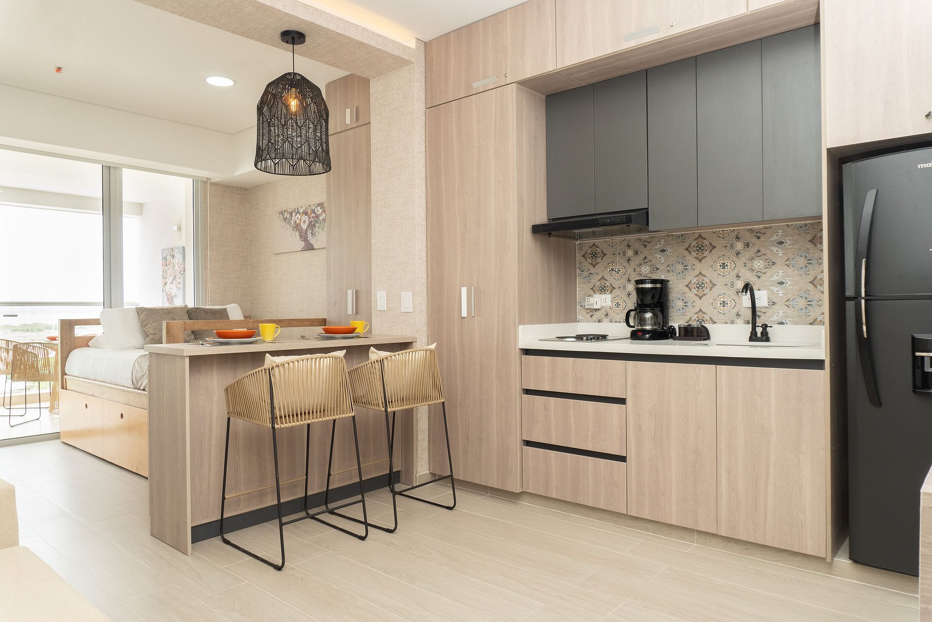Moderna suite en piso 10 con espectacular vista, ideal para familias o viajes de trabajo. A solo 2 min del aeropuerto, cuenta con 2 camas queen (una deslizable), sofá cama, cocina equipada y balcón con comedor al aire libre. Edificio nuevo con hermosa piscina y zonas comunes. Ubicación estratégica cerca de la playa, restaurantes, supermercados y transporte. Tranquilidad, comodidad y atención cálida garantizadas