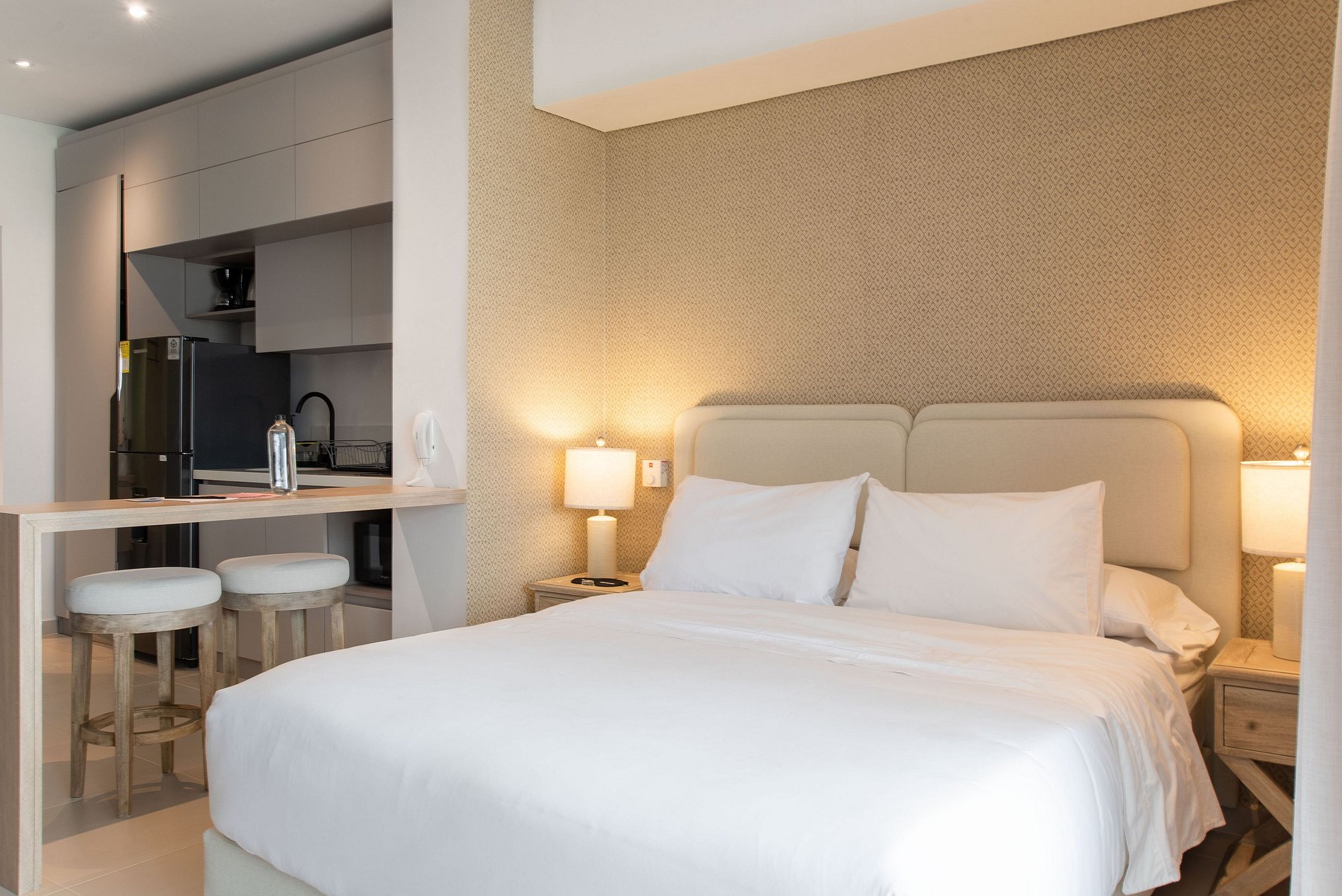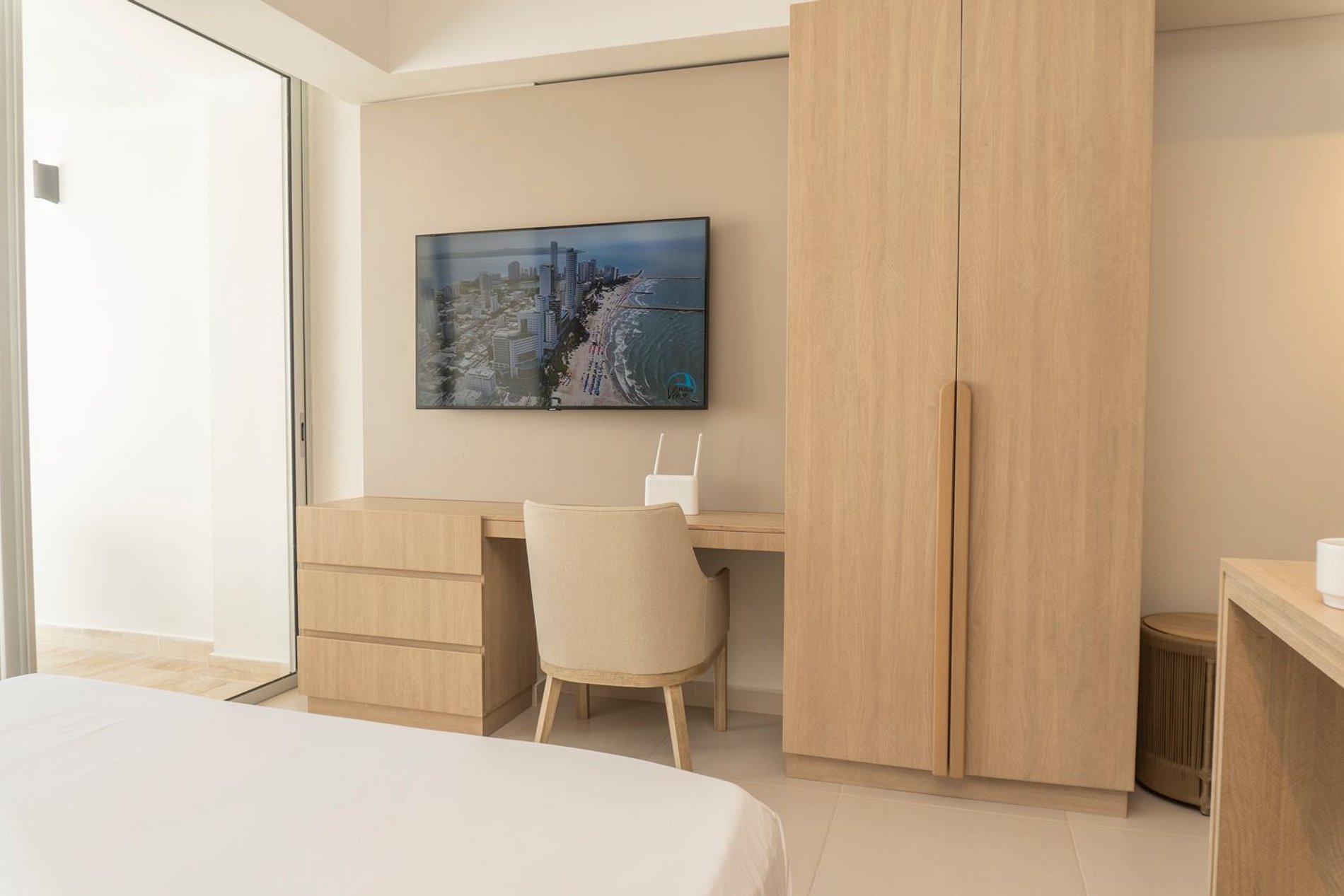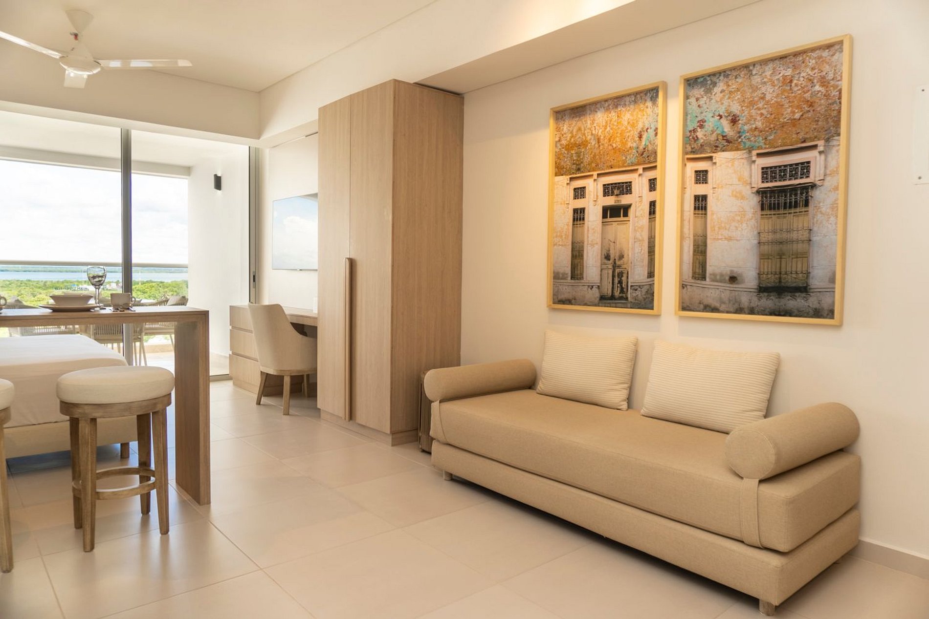 Esta suite cálida y luminosa está ubicada en el piso 9 del edificio Cartagena Beach. Su diseño armónico en tonos suaves y mobiliario contemporáneo crean un ambiente sereno, perfecto para desconectarte y recargar energía.