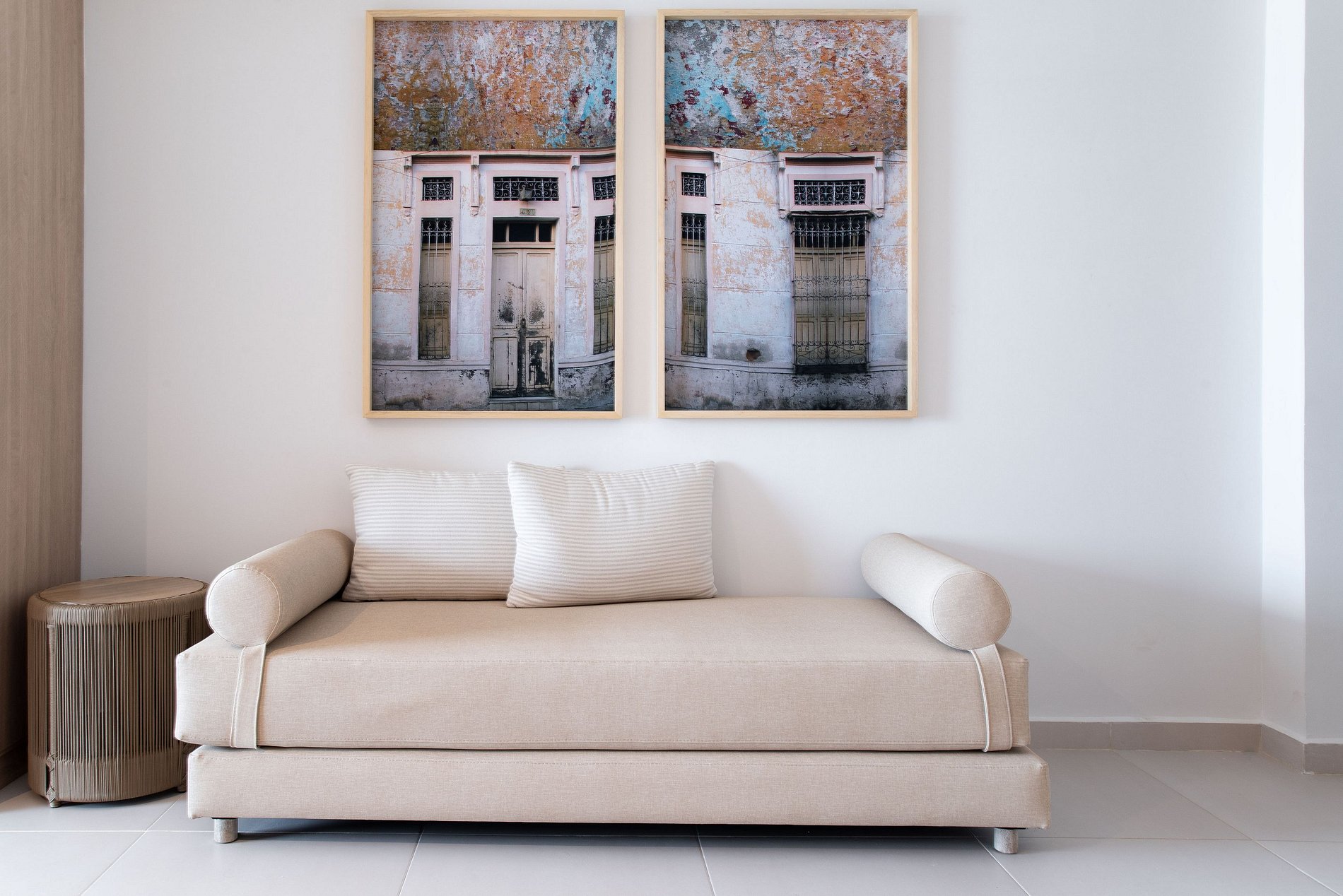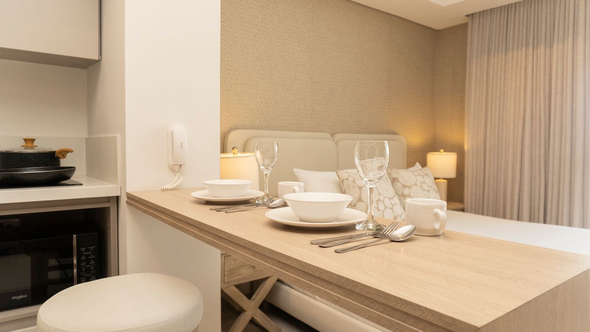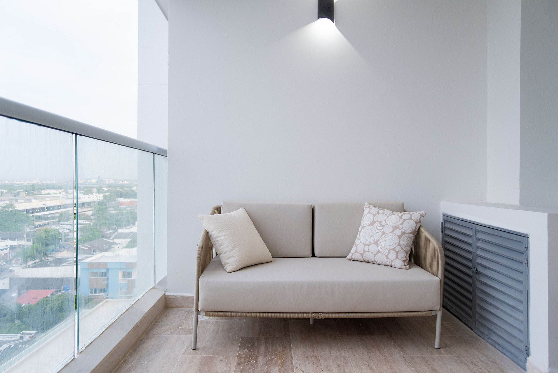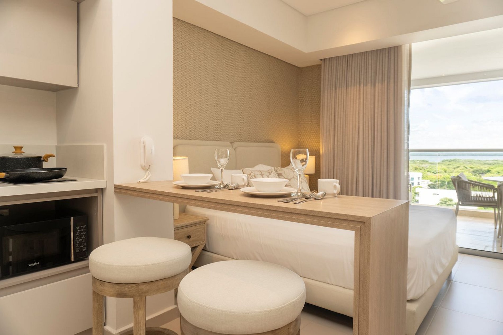 Esta suite cálida y luminosa está ubicada en el piso 9 del edificio Cartagena Beach. Su diseño armónico en tonos suaves y mobiliario contemporáneo crean un ambiente sereno, perfecto para desconectarte y recargar energía.