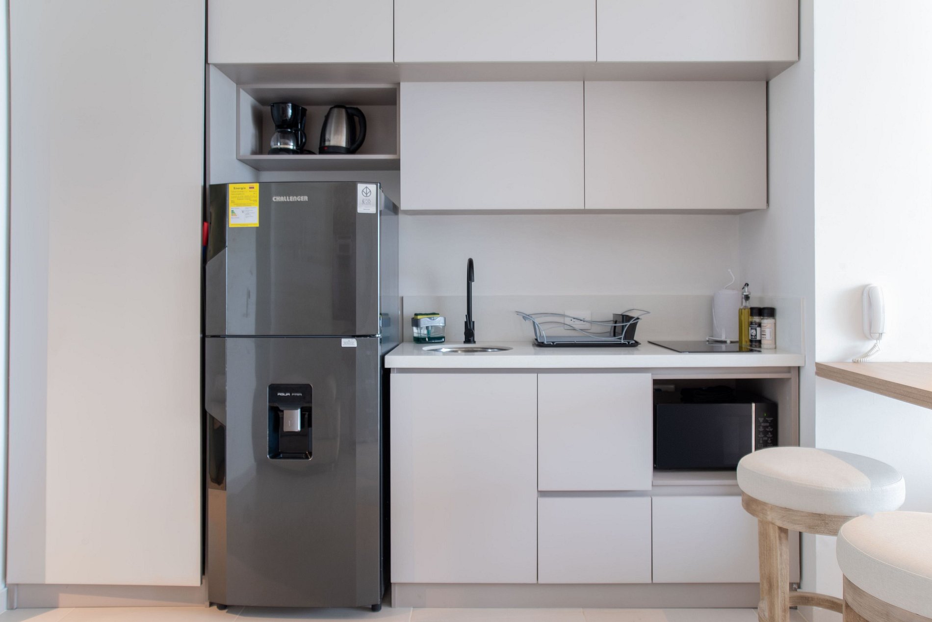 • Cocina equipada: nevera, estufa, horno microondas, licuadora, cafetera, y utensilios de cocina