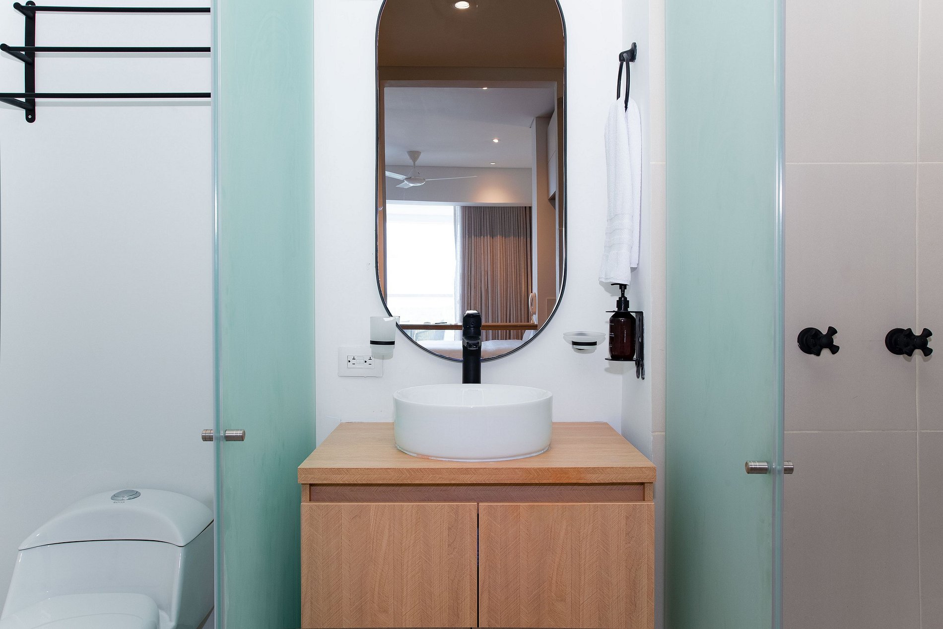 • Baño moderno con agua caliente, ducha en vidrio y grifería negra estilo boutique