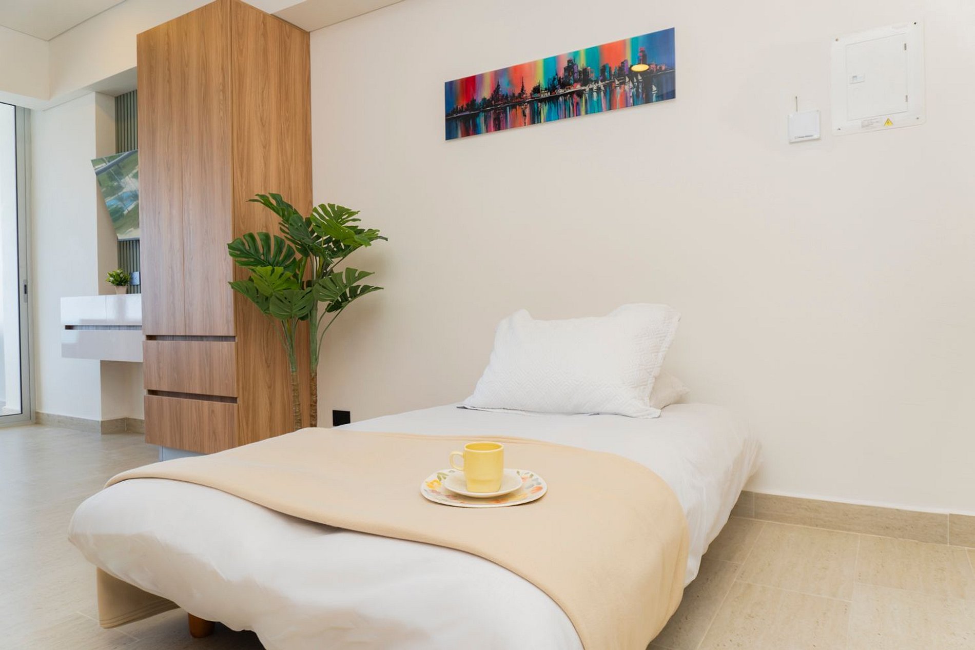 Moderno estudio frente al mar con cama doble, cama nido auxiliar y sofá futón. Cocina totalmente equipada con nevera, estufa, microondas y cafetera. Balcón amoblado con vista al mar, baño contemporáneo y comedor tipo barra. Internet ultra rápido de, TV y aire acondicionado para tu confort.