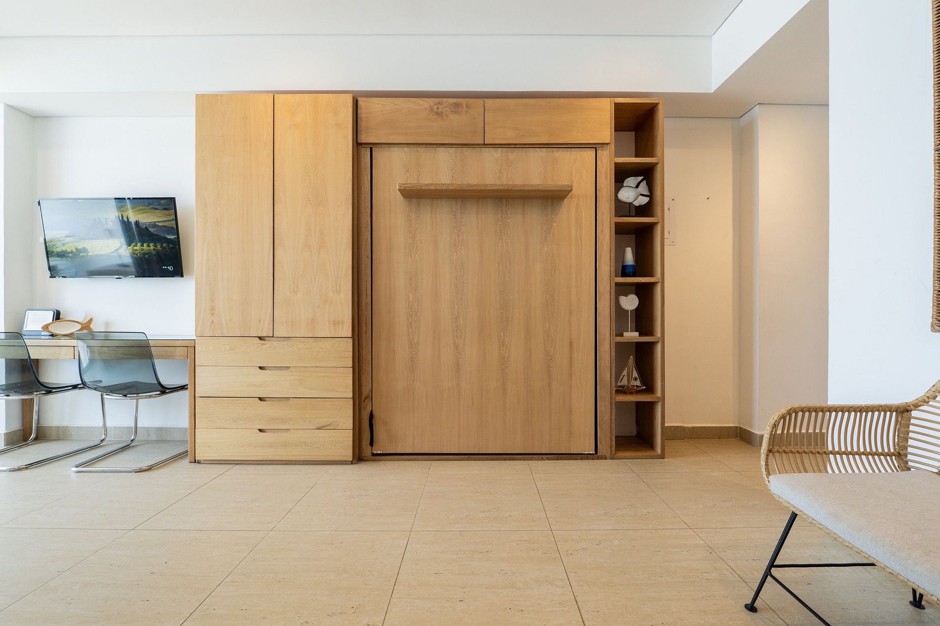 Suite en piso alto con balcón privado, hamaca y vista directa al mar. Con cama Queen y cama abatible, capacidad hasta 4 huéspedes. Moderna, cómoda y cerca de todo, ideal para disfrutar Cartagena desde Crespo.