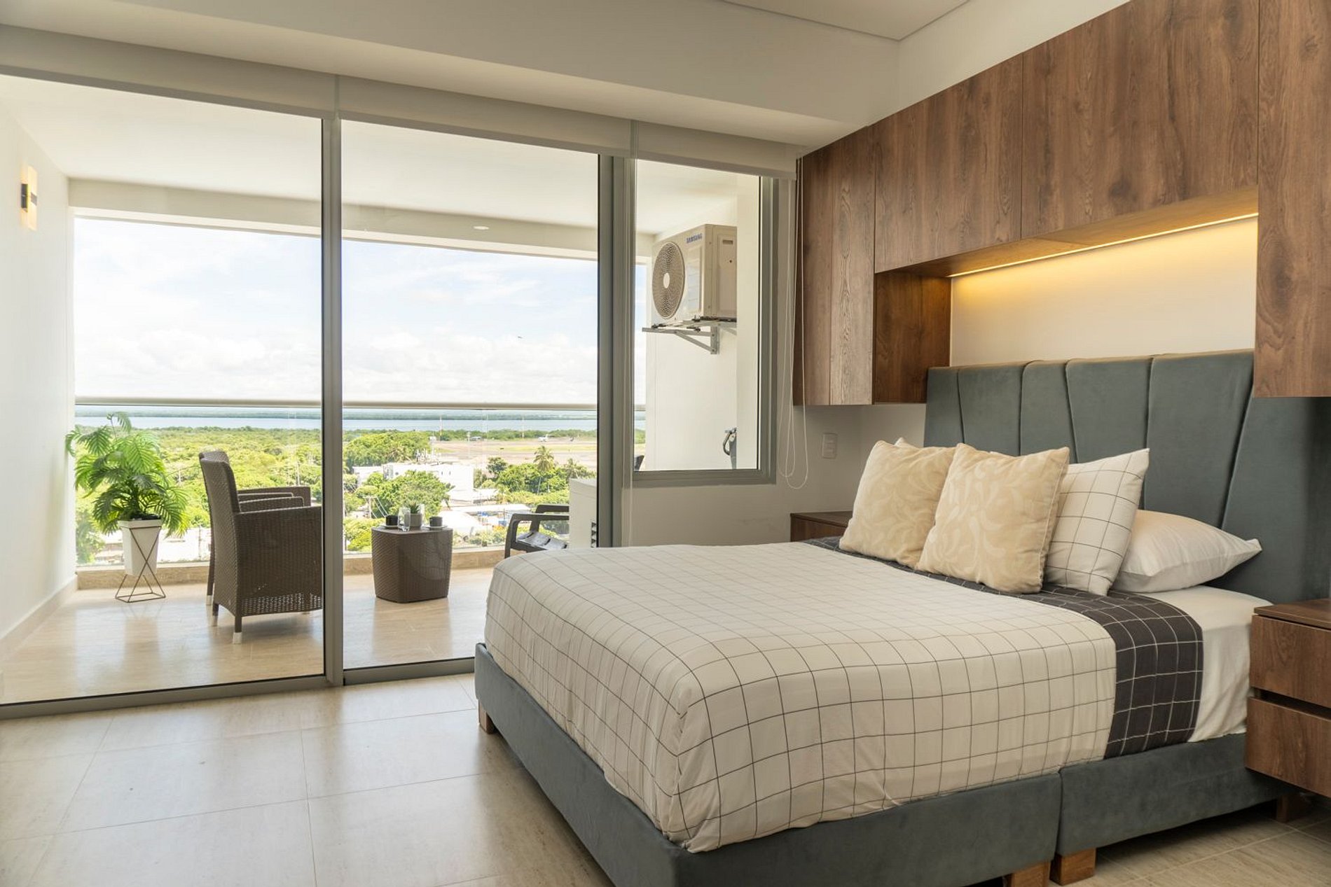 Suite moderna en piso 9 con cama Queen, sofá cama, cocina full equipada, lavadora/secadora y balcón privado con vista a la ciudad y la Ciénaga de la Virgen