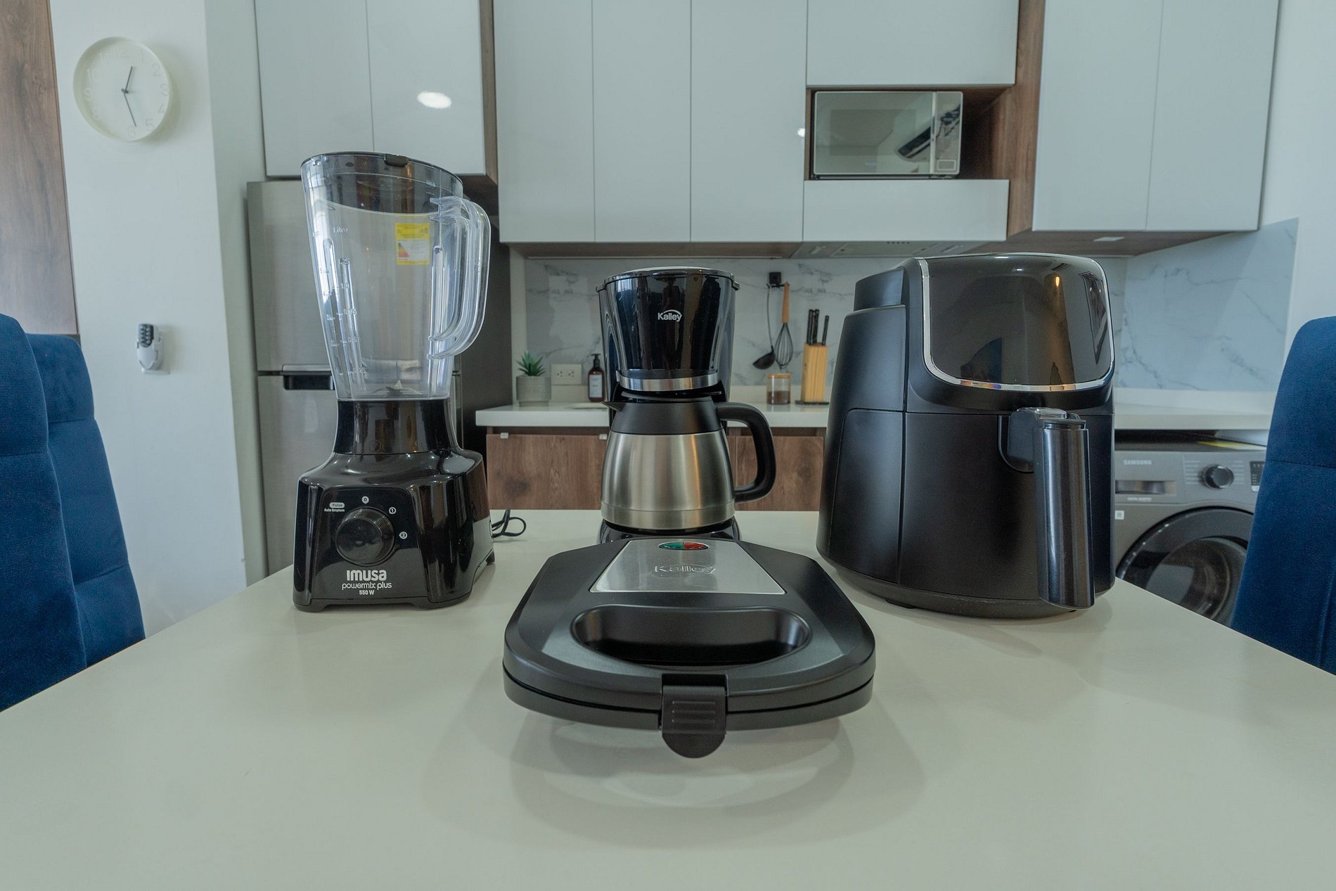 • Cocina integral totalmente equipada: nevera grande, microondas, cafetera, licuadora, hervidor, menaje completo.