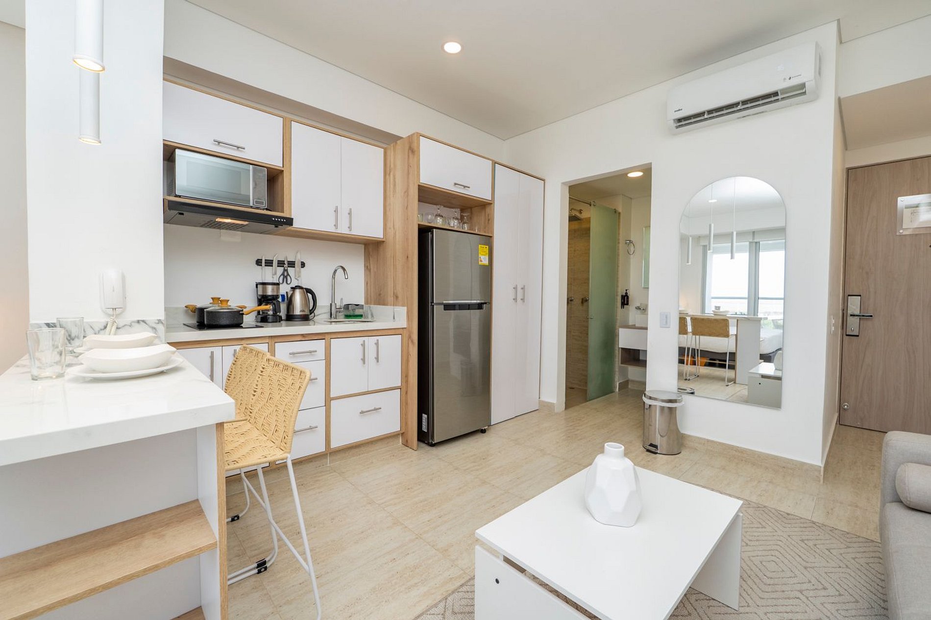Hermoso apartamento en el piso 11 con decoración cálida, fresca y acogedora. Desde el balcón disfruta amaneceres mágicos y vistas a la Ciénaga, la ciudad y el aeropuerto. A pasos de la playa de Crespo. Cama Queen y sofá cama; cocina equipada, lavadora, aire acondicionado y Wi-Fi. Edificio moderno con piscina, recepción 24 h y seguridad. Ideal para descansar, trabajar o disfrutar en pareja, familia o en solitario. Cerca de parque lineal, ciclovía, restaurantes, farmacias, tiendas y aeropuerto.