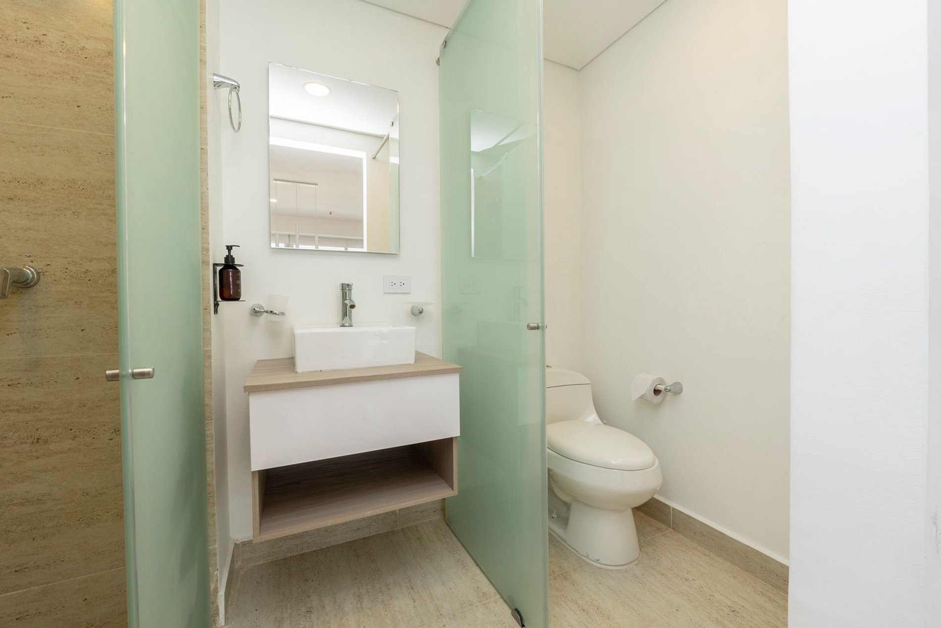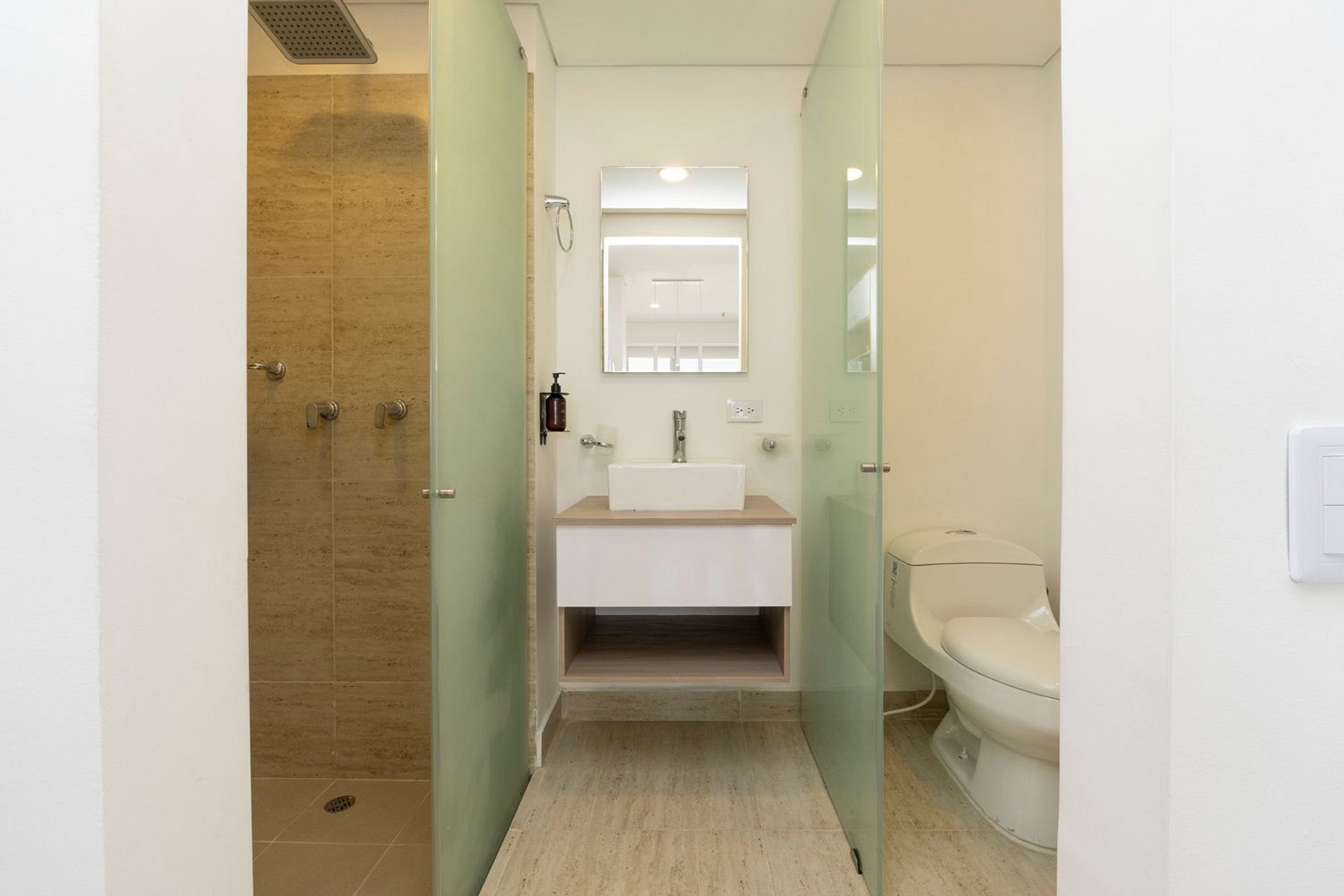 • Baño moderno con ducha tipo lluvia y acabados de estilo hotel
