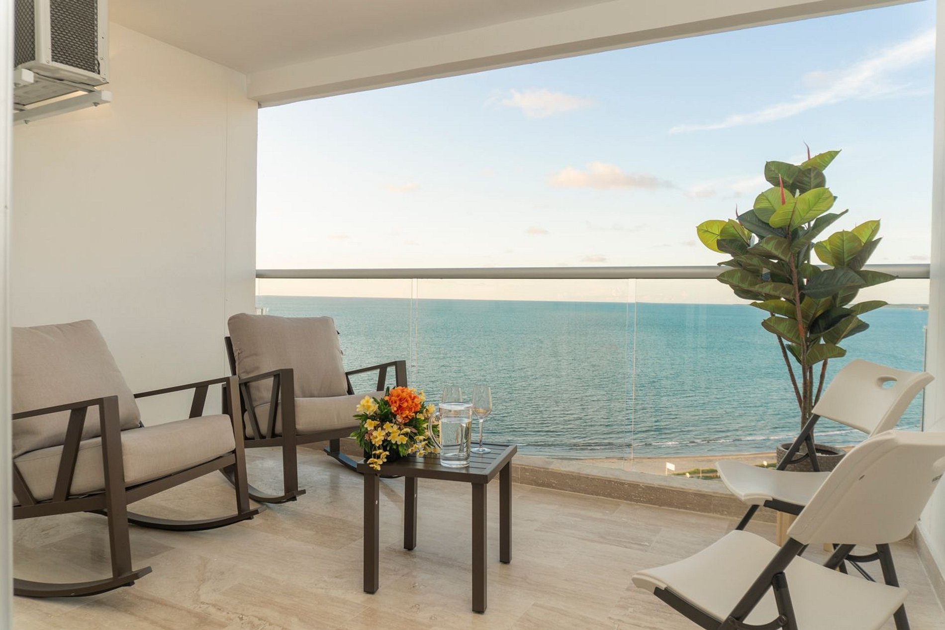 Suite acogedora en piso 14 con balcón frente al mar, cama doble, sofá cama, cocina equipada, wifi rápido y baño moderno. En Cartagena Beach disfruta de piscinas, jacuzzi y seguridad 24/7, a pasos del mar y a pocos minutos del aeropuerto.