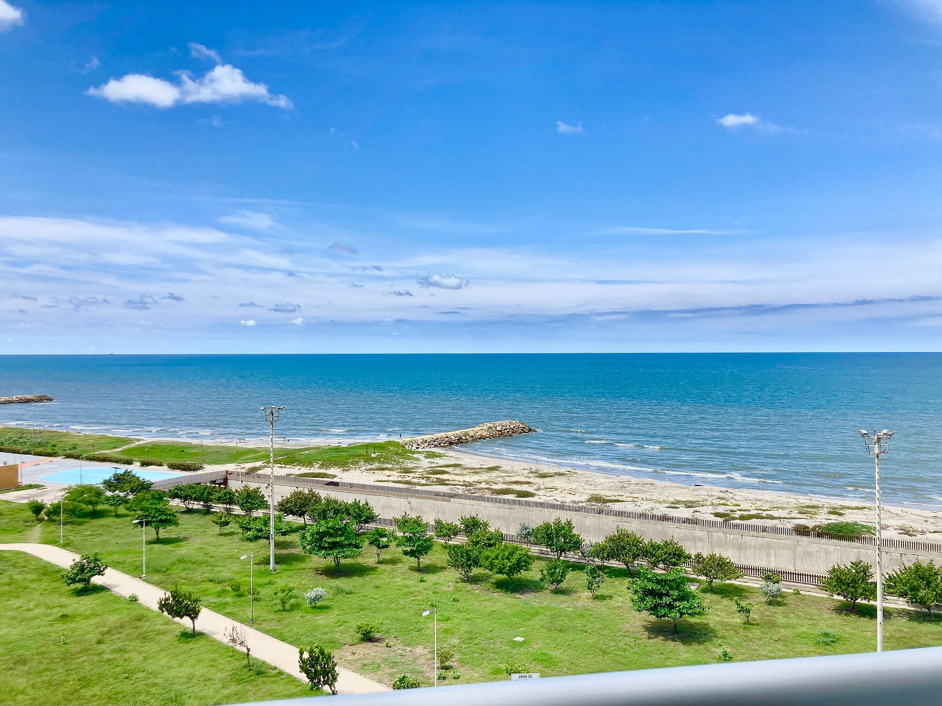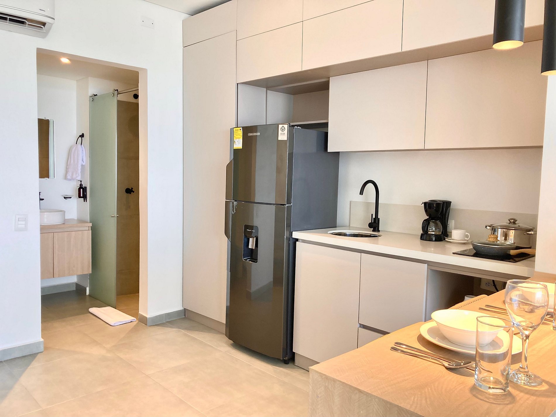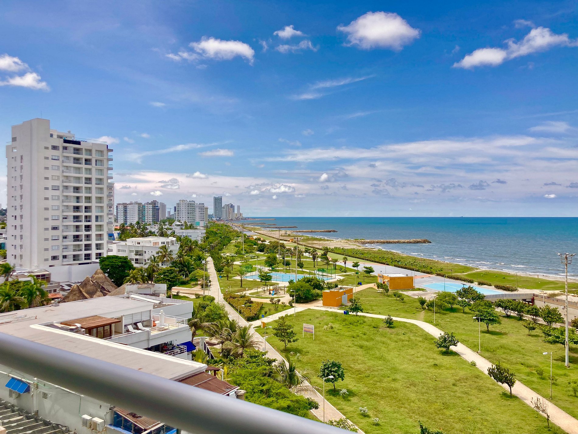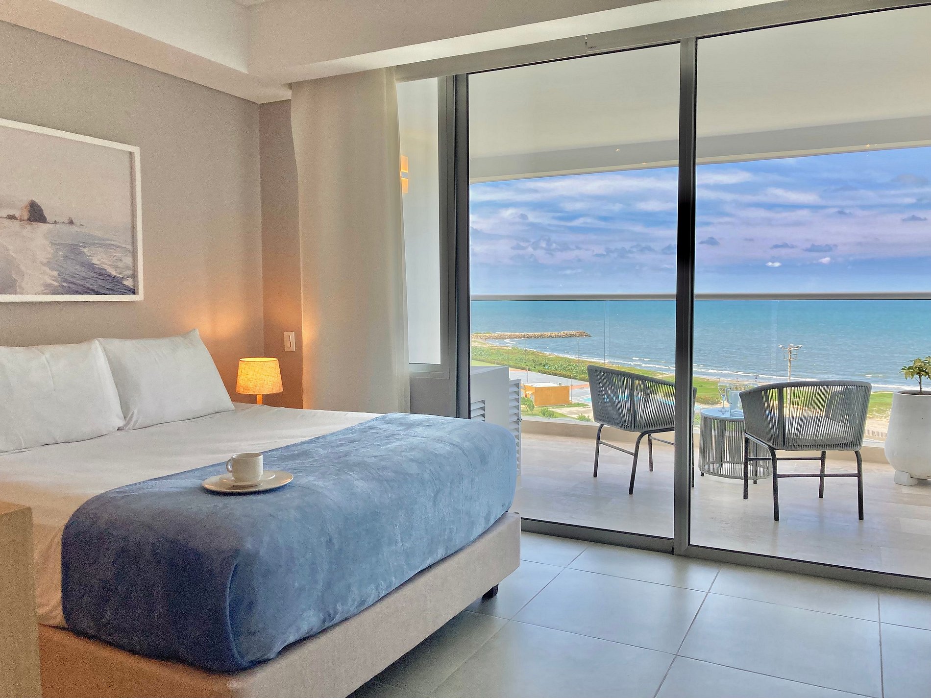 Suite moderna en piso 8 con balcón y vista al mar y al parque lineal de Crespo. Cama Queen, sofá cama, cocina equipada y Wi-Fi veloz. En edificio con piscina, jacuzzi, sauna, gimnasio y seguridad 24h.