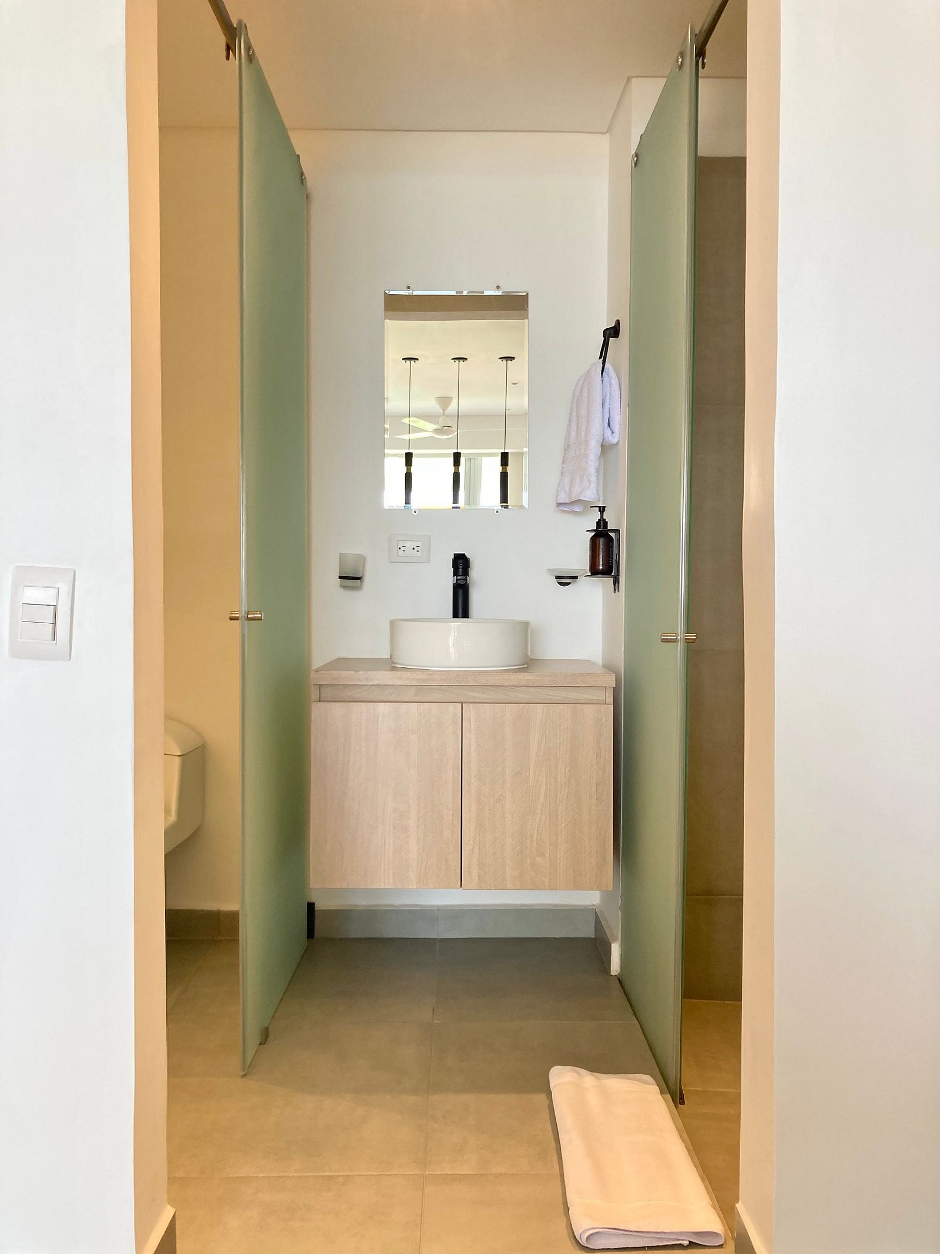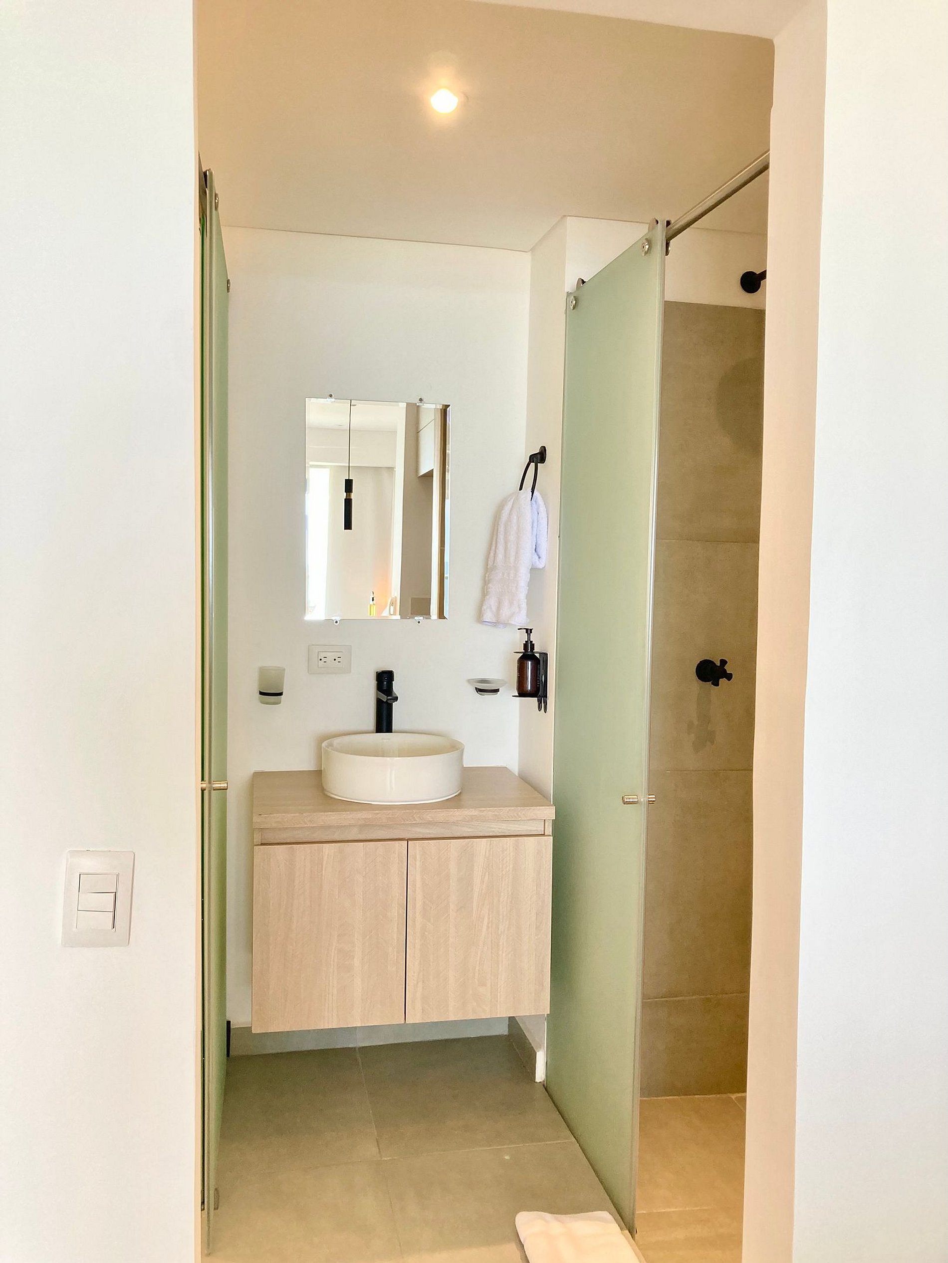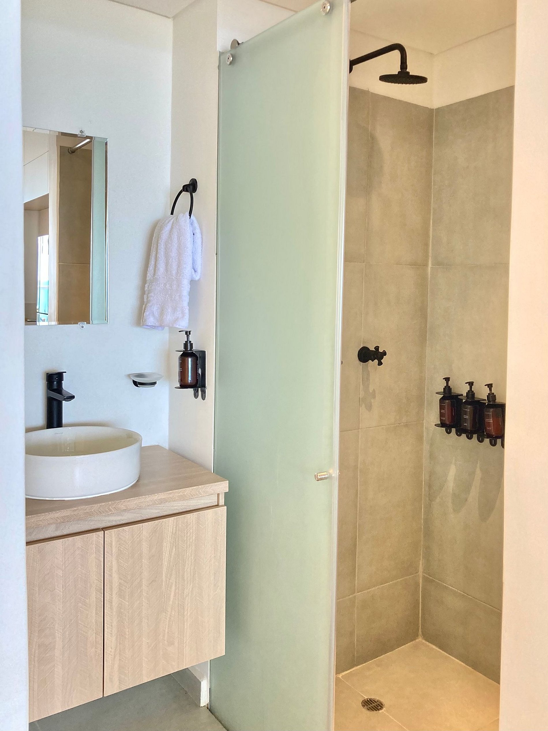 • Baño moderno con ducha tipo lluvia y acabados de estilo hotel