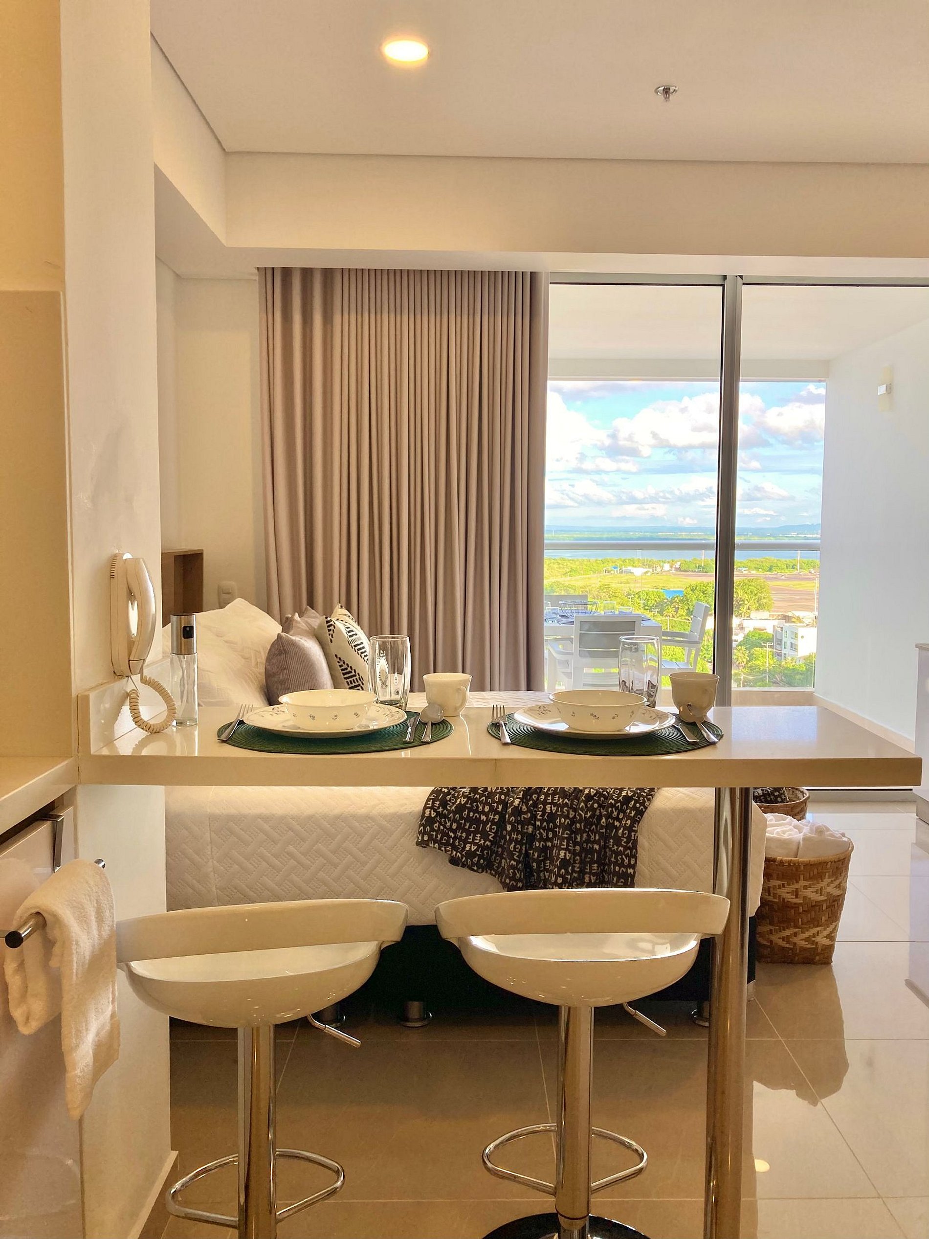 Estudio moderno y acogedor en piso 12, balcón privado y vista a la Ciénaga. Cama Queen, sofá, Smart TV, aire acondicionado y ventilador de techo para tu confort. Su cocina equipada con nevera, estufa, cafetera y barra-comedor lo hacen ideal para estancias cortas o largas. El baño cuenta con diseño contemporáneo y ducha en vidrio esmerilado. El edificio ofrece piscina, lobby moderno y seguridad 24/7, todo en una ubicación privilegiada cerca de la playa y el parque lineal. A 2 min del aeropuerto