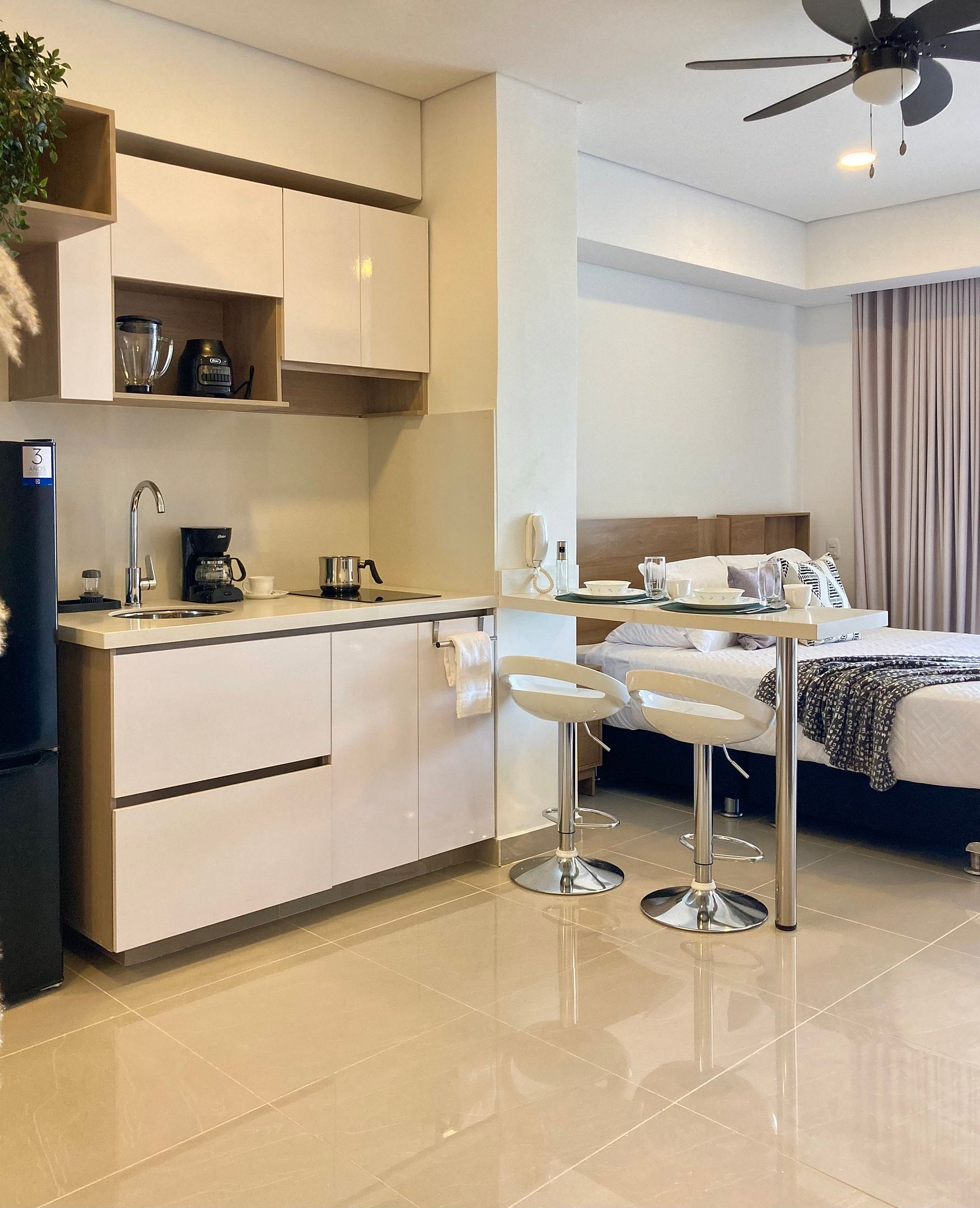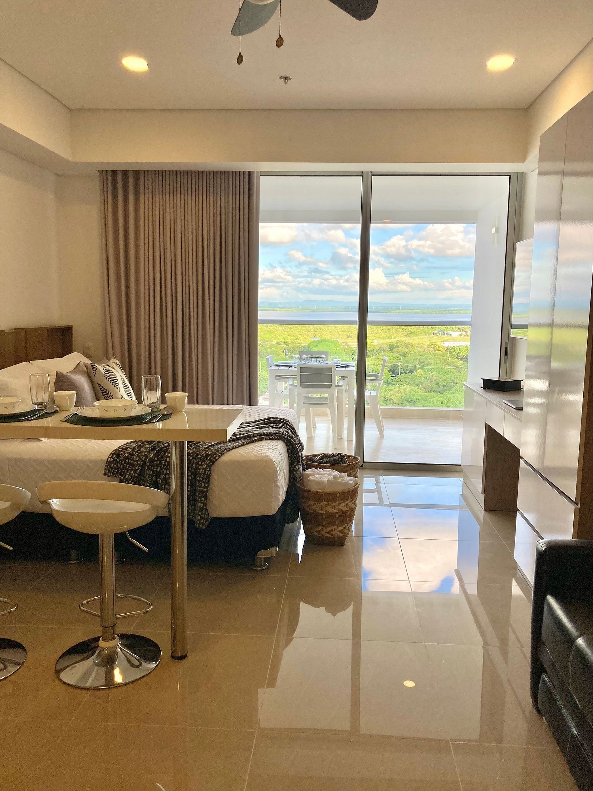 Estudio moderno y acogedor en piso 12, balcón privado y vista a la Ciénaga. Cama Queen, sofá, Smart TV, aire acondicionado y ventilador de techo para tu confort. Su cocina equipada con nevera, estufa, cafetera y barra-comedor lo hacen ideal para estancias cortas o largas. El baño cuenta con diseño contemporáneo y ducha en vidrio esmerilado. El edificio ofrece piscina, lobby moderno y seguridad 24/7, todo en una ubicación privilegiada cerca de la playa y el parque lineal. A 2 min del aeropuerto