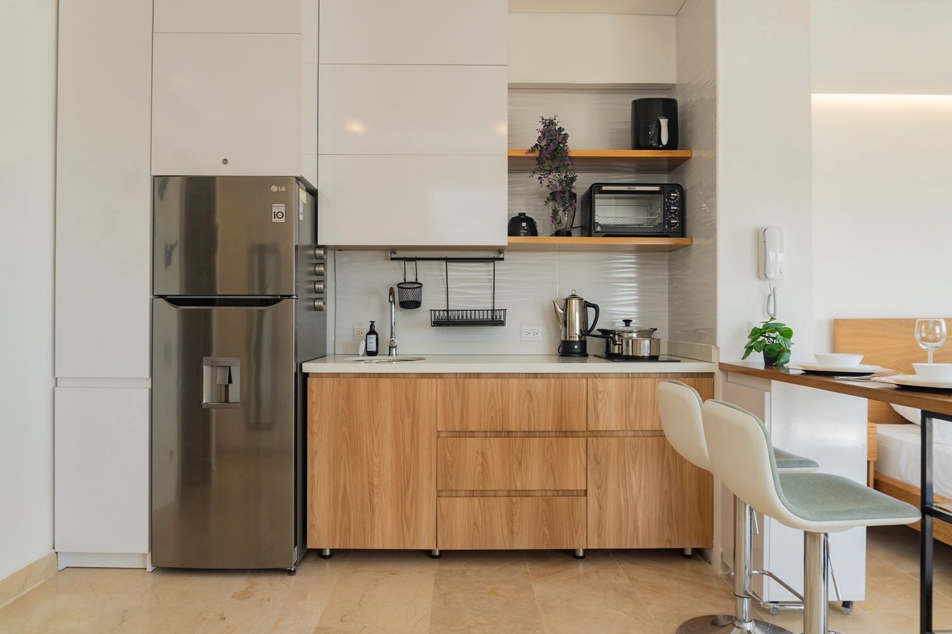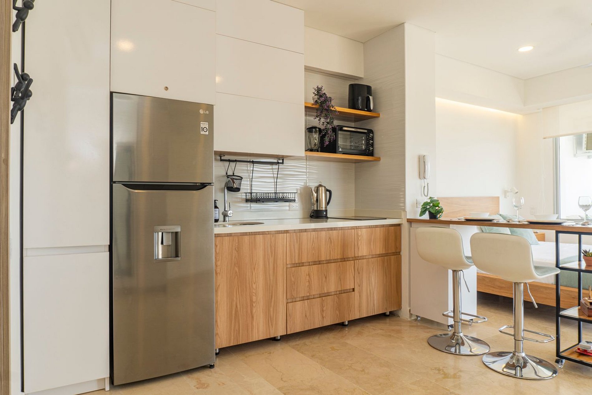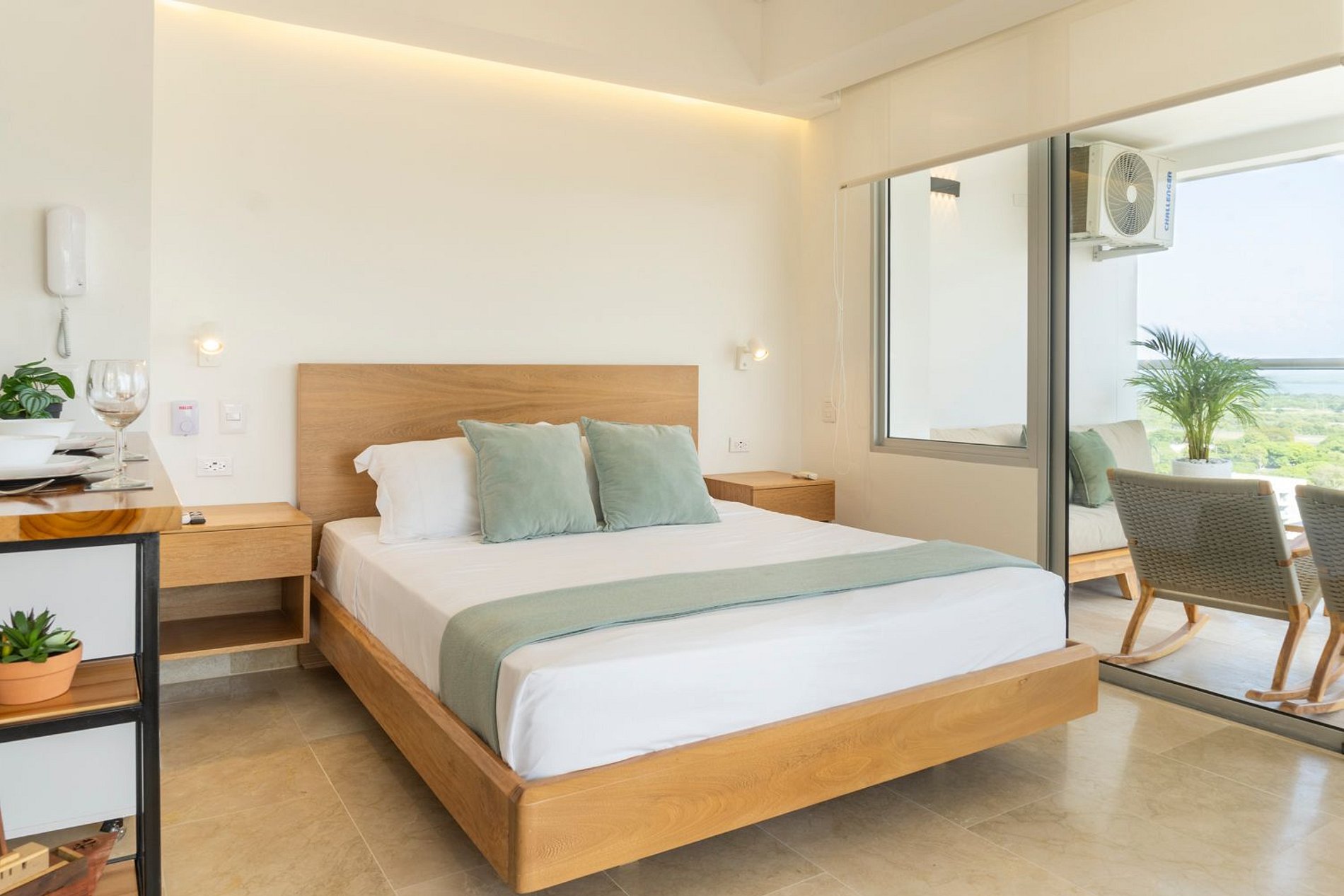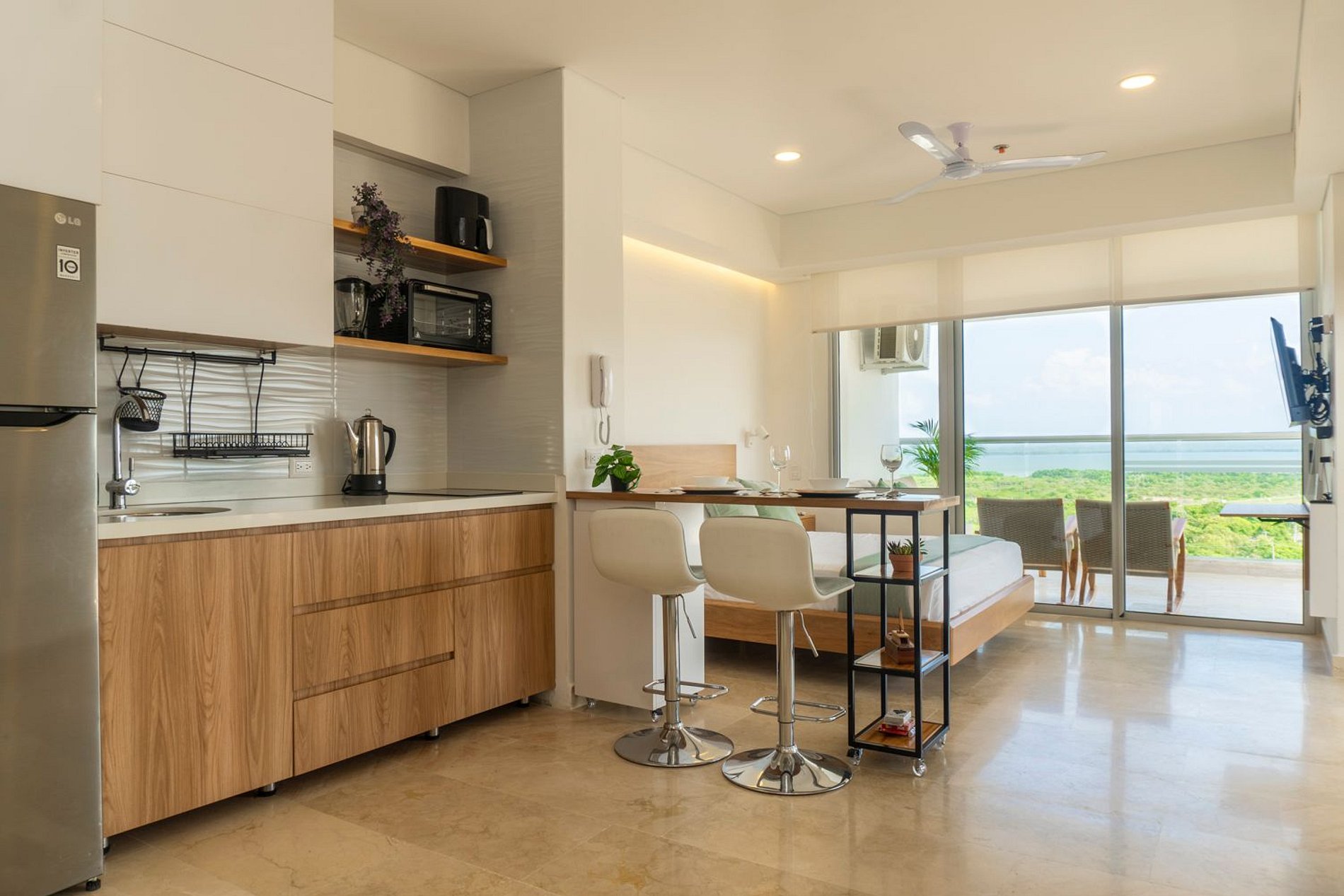Hermosa suite en piso alto con vista 180° al mar, la Ciénaga y la ciudad. Cuenta con cama Queen, Smart TV, aire acondicionado y ventilador de techo. Balcón amoblado con comedor exterior y sillas lounge. Cocina totalmente equipada con nevera, microondas, cafetera y barra-comedor. Baño moderno con ducha en vidrio esmerilado y cerradura digital para mayor seguridad.