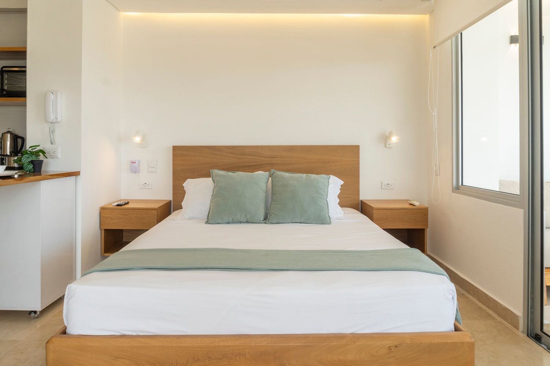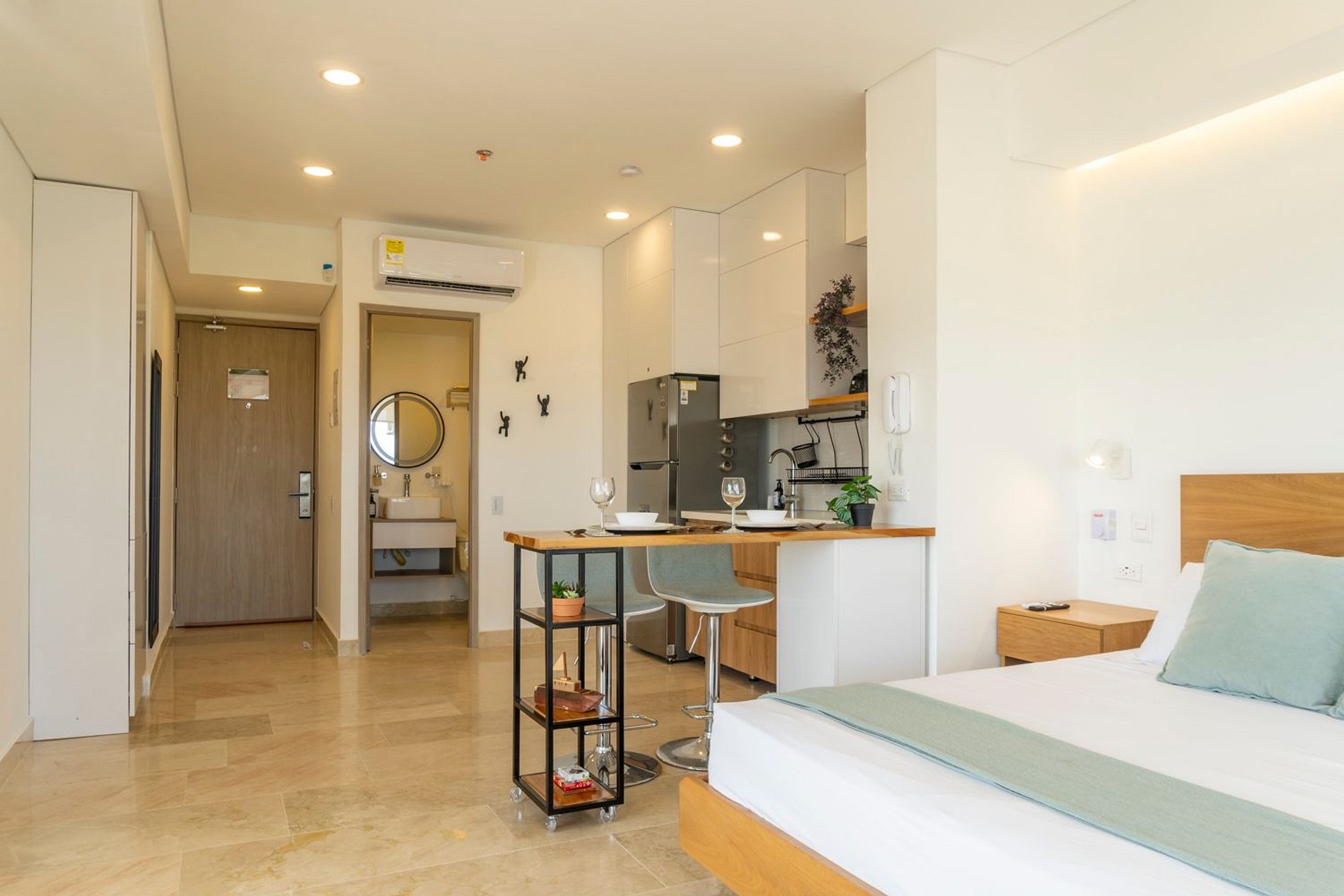 Hermosa suite en piso 13 con vista 180° al mar, la Ciénaga y la ciudad, a solo 7 minutos del centro histórico. Disfruta su balcón amoblado con comedor exterior y sillas lounge. Cuenta con cama queen, Smart TV, aire acondicionado, ventilador de techo y cerradura digital. La cocina está totalmente equipada con nevera, microondas, cafetera y barra-comedor. El baño moderno ofrece ducha en vidrio esmerilado. El edificio incluye piscina semiolímpica, solárium, lobby y seguridad 24/7.