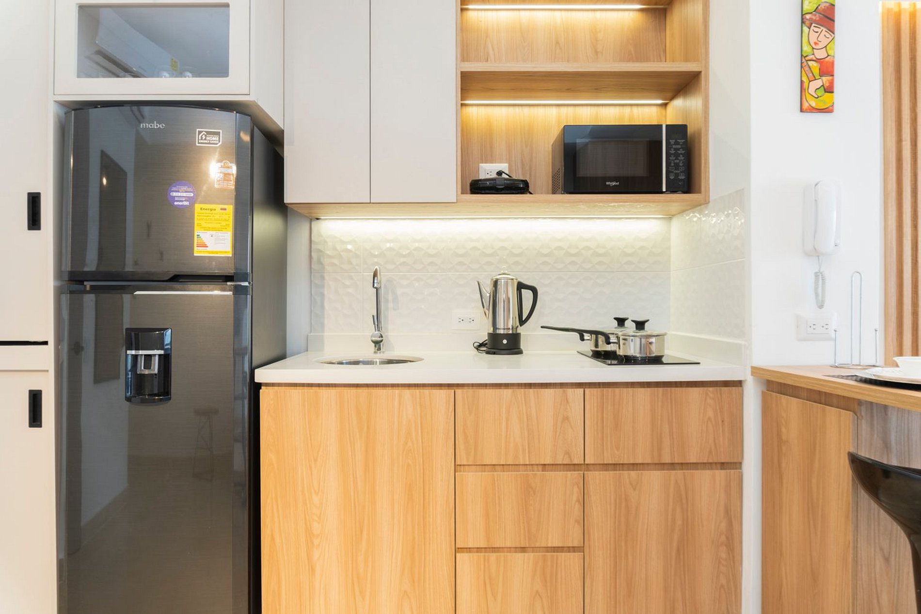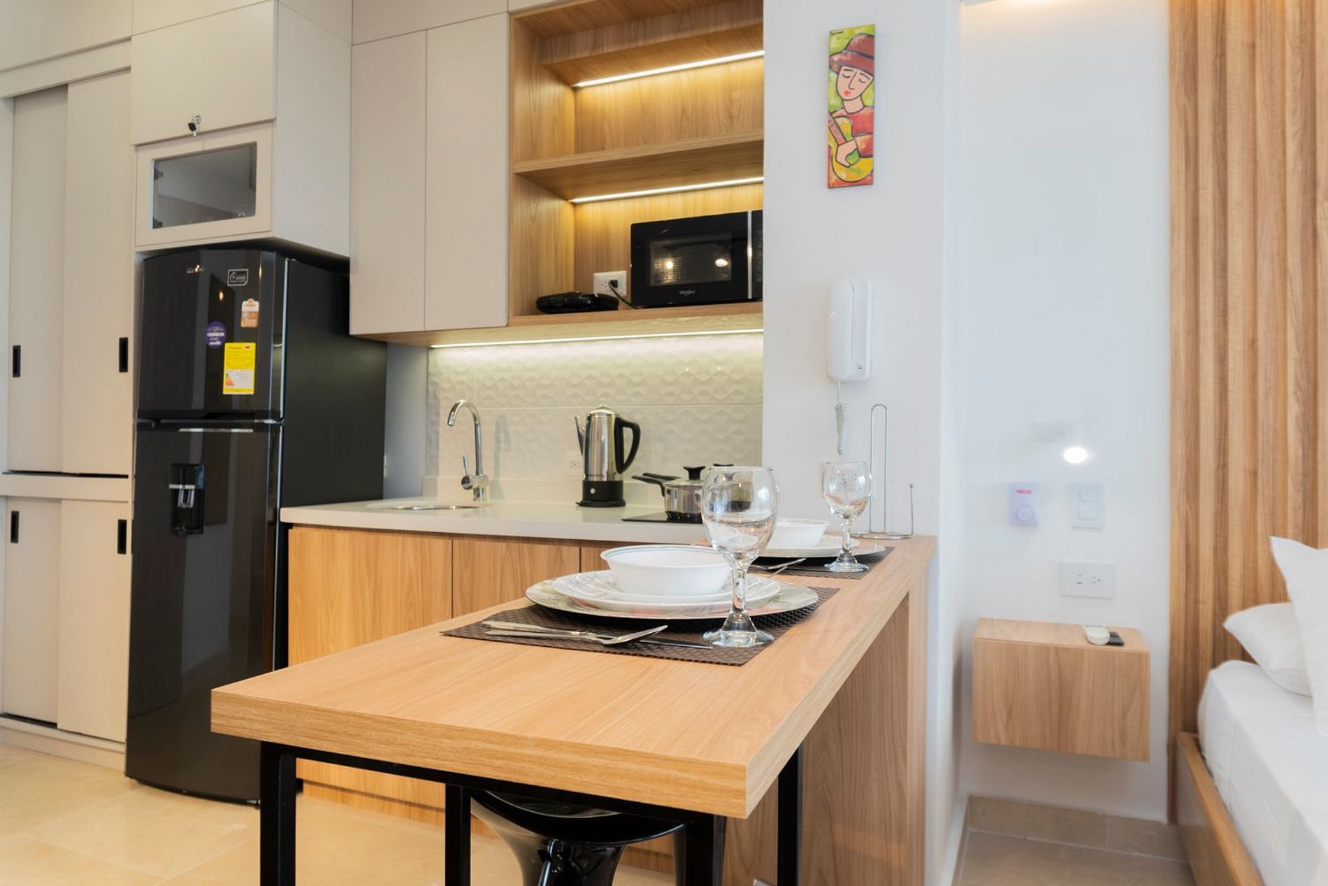 • Cocina equipada: nevera, microondas, cafetera, licuadora, hervidor y menaje completo
