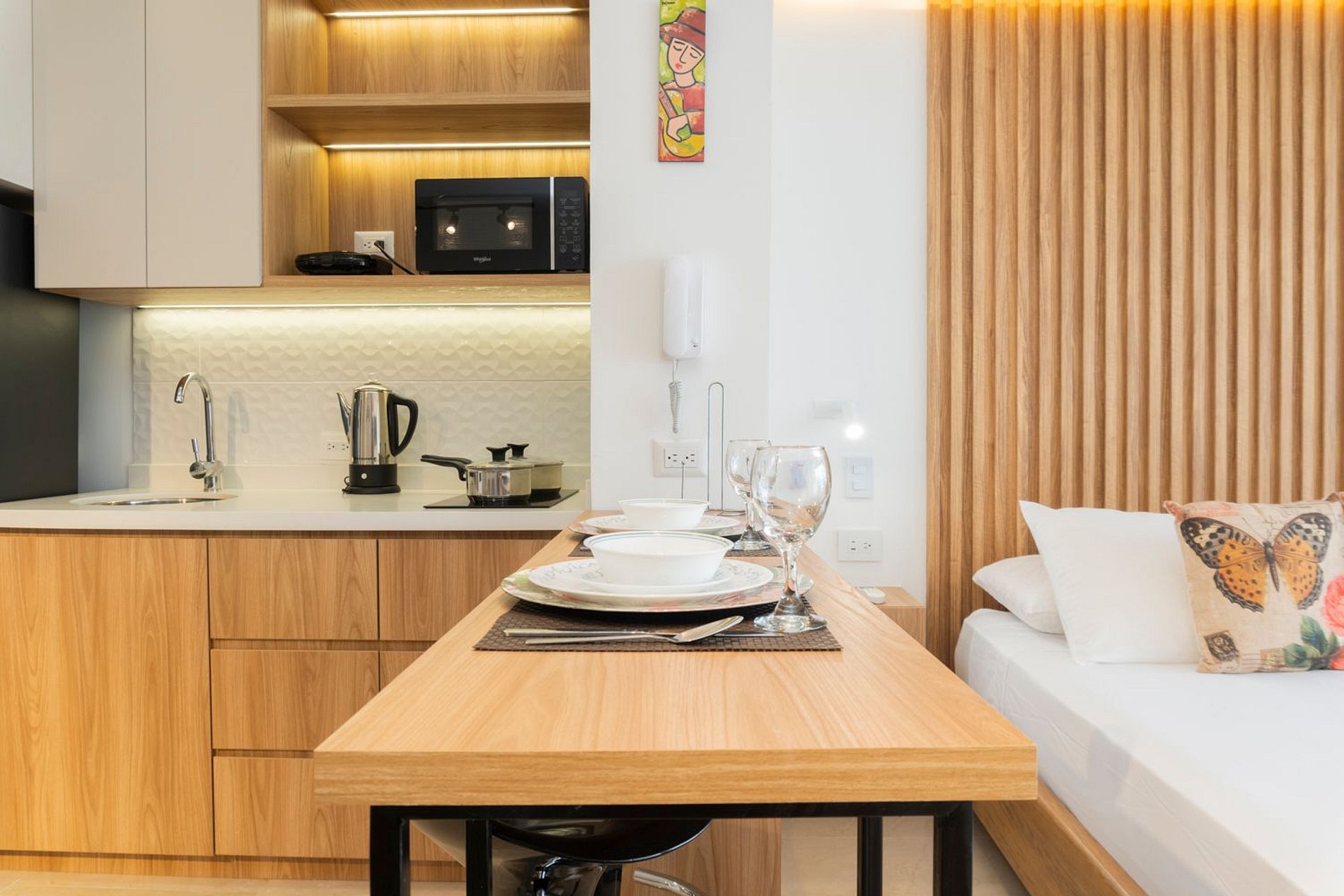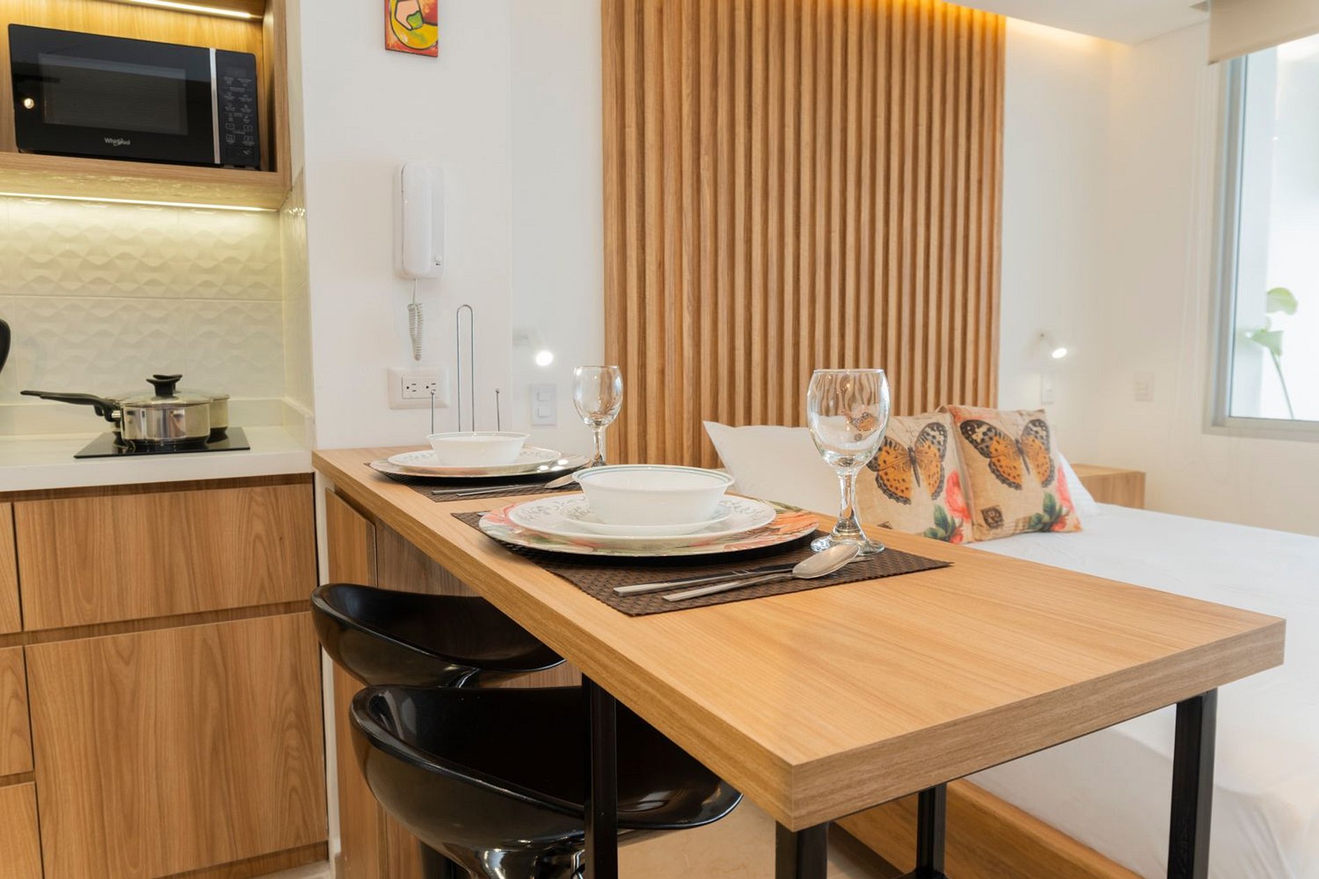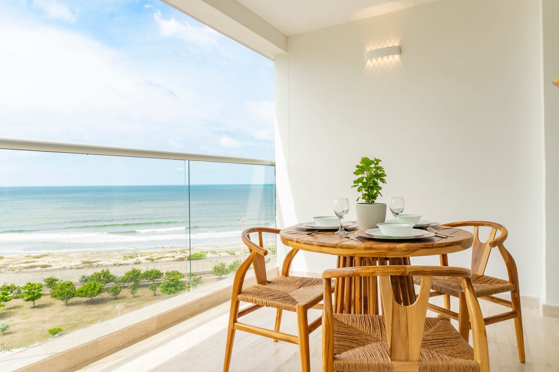 Suite boho luminosa con balcón y vista al mar. Cama Queen, cocina equipada, baño moderno, Wi-Fi veloz y cerradura digital.