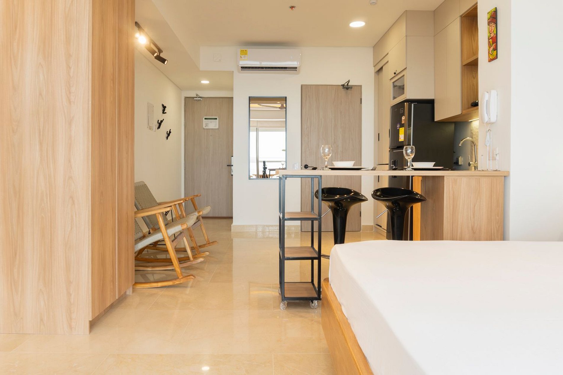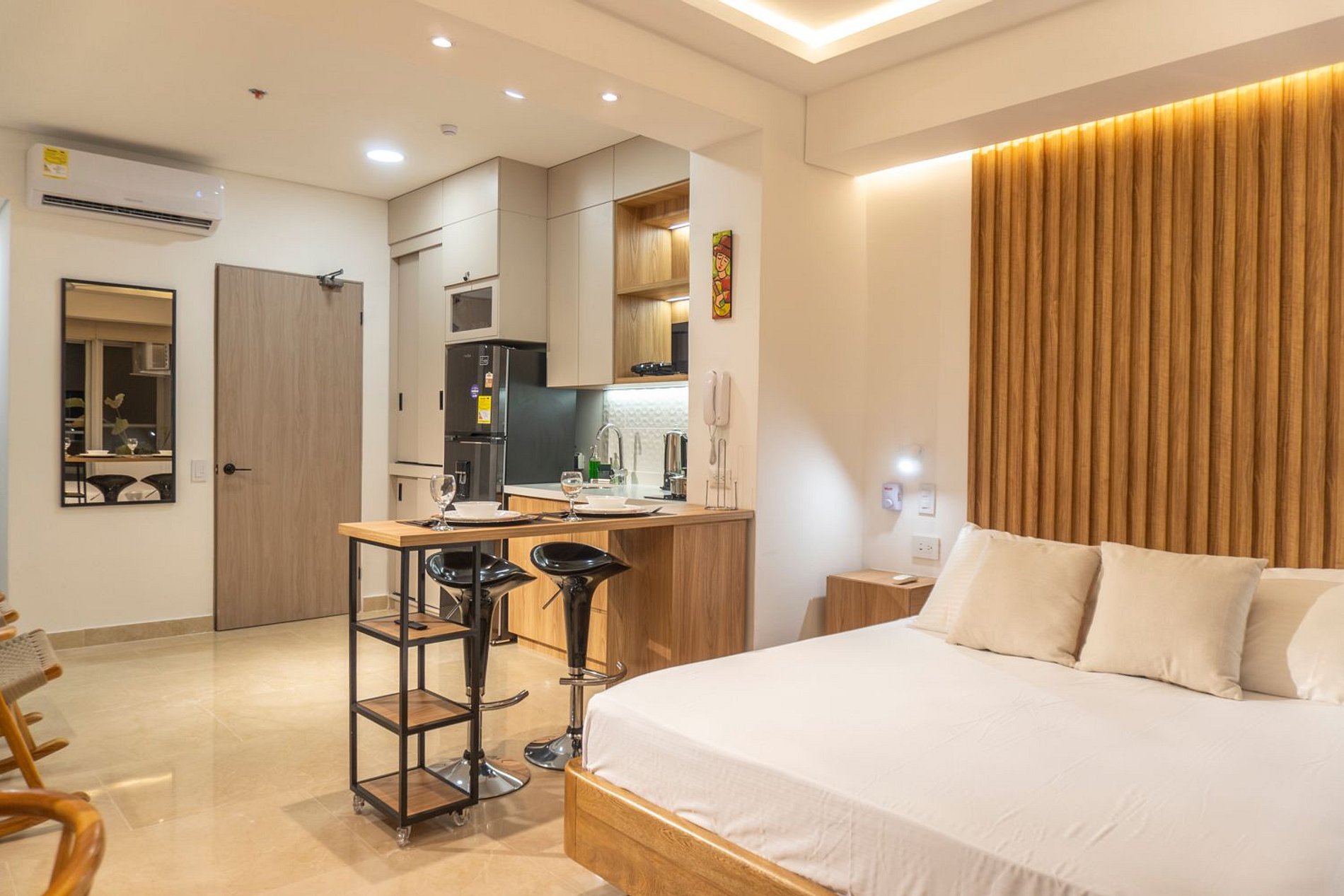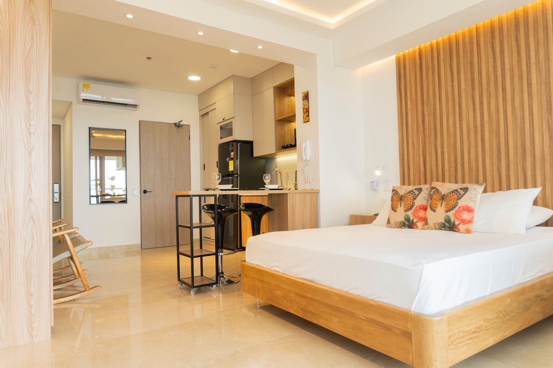 En el piso 9, esta suite boho moderna ofrece un espacio lleno de luz natural, con acabados cálidos en madera y un estilo acogedor. Disfruta de cama Queen con ropa de alta calidad, Smart TV, aire acondicionado y blackout. Cocina equipada con nevera, microondas, cafetera, licuadora, hervidor y menaje completo. Balcón amoblado con mesa y sillas para contemplar el mar. Baño moderno con ducha amplia y amenities. El edificio cuenta con piscina, jacuzzi, sauna, turco y recepción 24/7, frente a la playa