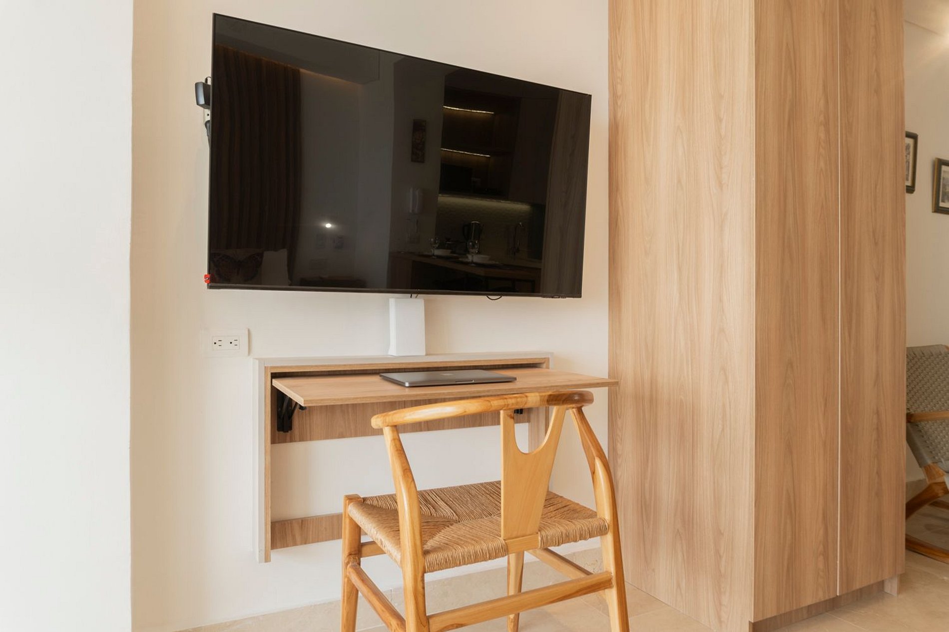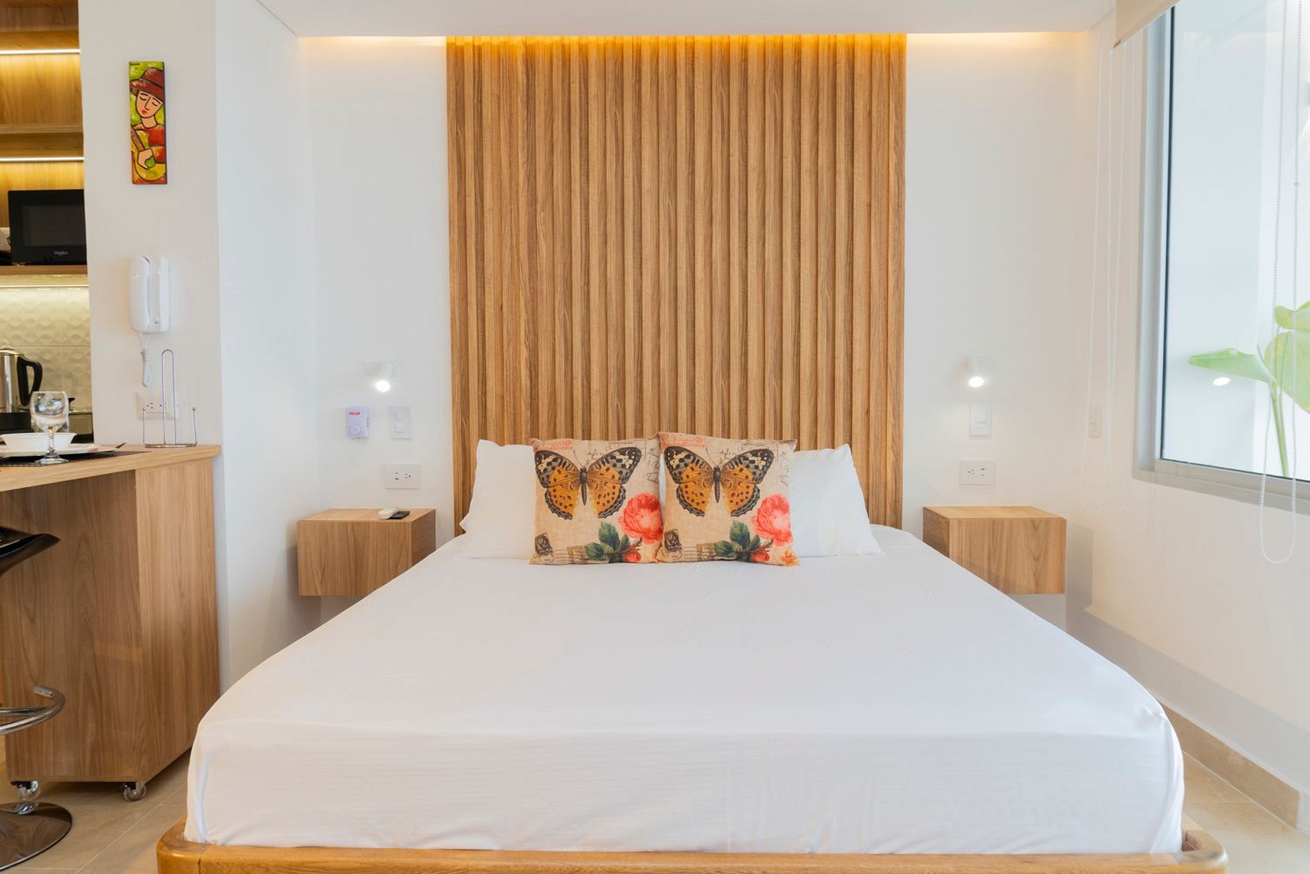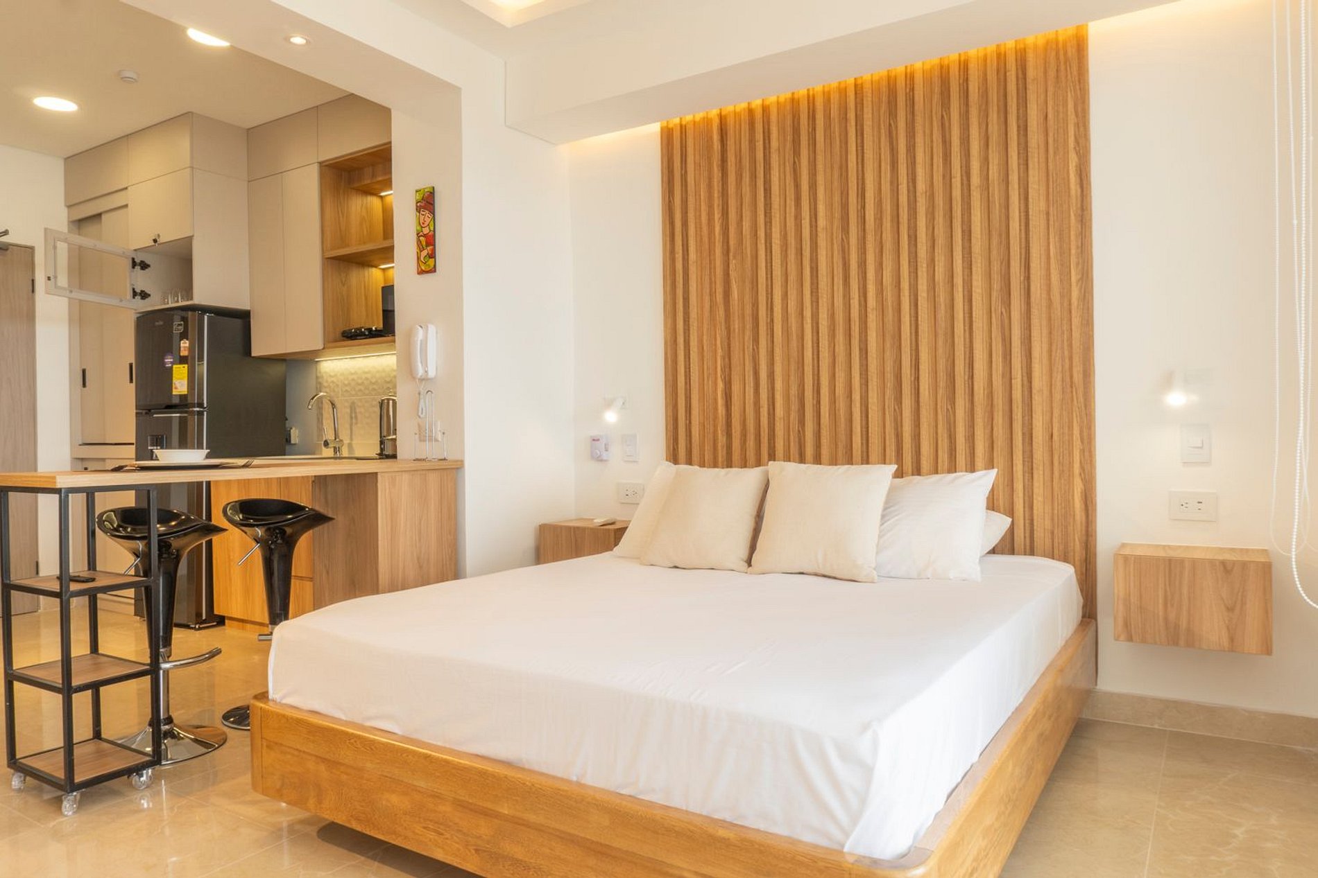 En el piso 9, esta suite boho moderna ofrece un espacio lleno de luz natural, con acabados cálidos en madera y un estilo acogedor. Disfruta de cama Queen con ropa de alta calidad, Smart TV, aire acondicionado y blackout. Cocina equipada con nevera, microondas, cafetera, licuadora, hervidor y menaje completo. Balcón amoblado con mesa y sillas para contemplar el mar. Baño moderno con ducha amplia y amenities. El edificio cuenta con piscina, jacuzzi, sauna, turco y recepción 24/7, frente a la playa
