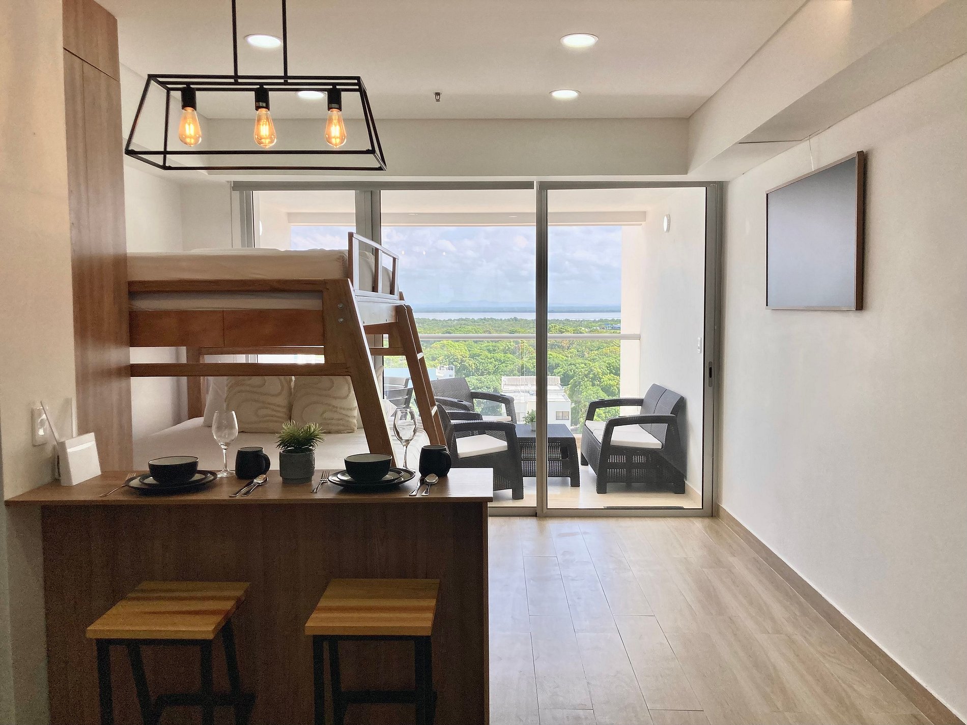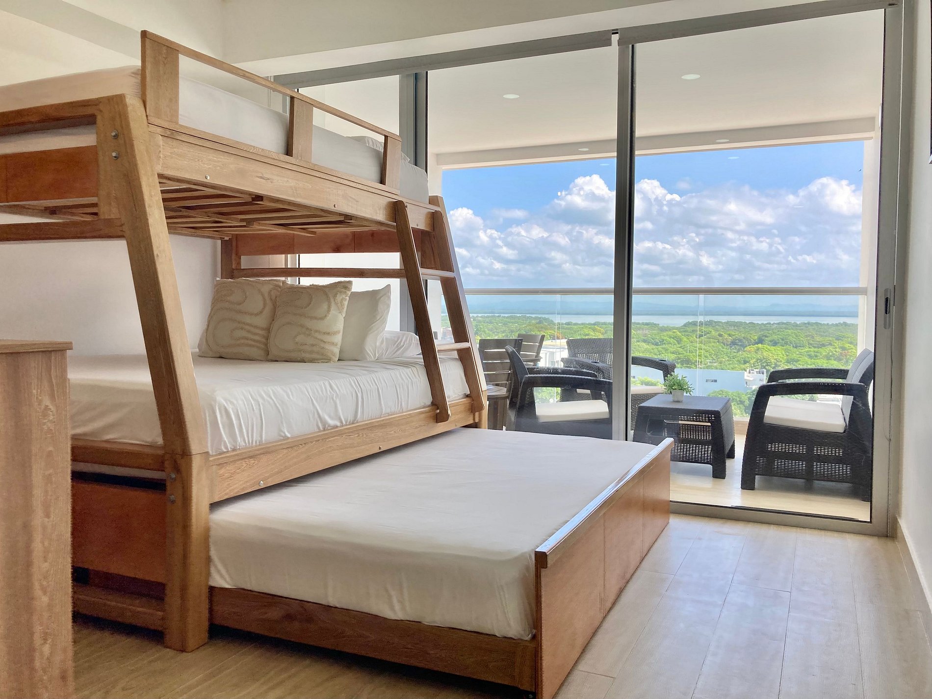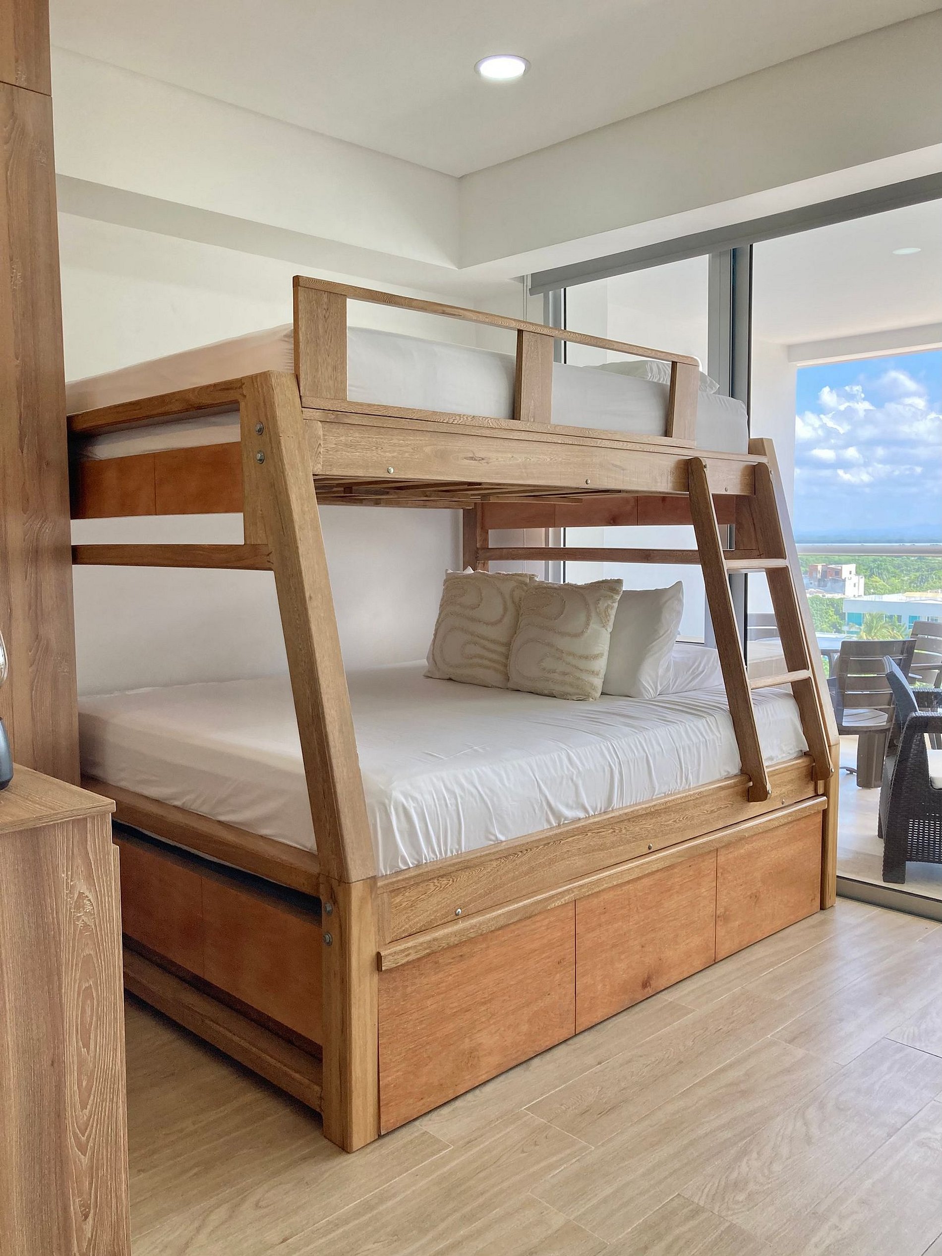 Loft familiar, piso 8 para hasta 4 huéspedes. Litera de madera: cama Queen abajo, cama nido Queen y cama doble arriba. Balcón amoblado con vistas a la Ciénaga, ciudad, aeropuerto y parcial al mar. Cocina equipada con barra-comedor, cafetera, licuadora y menaje. Smart TV, aire acondicionado e internet ultra rápido. En Cartagena Beach accede a piscina, piscina niños, vigilancia 24/7 y parking gratis. A pasos del aeropuerto, playa de Crespo, Parque Lineal con zonas infantiles y espacios deportivos.