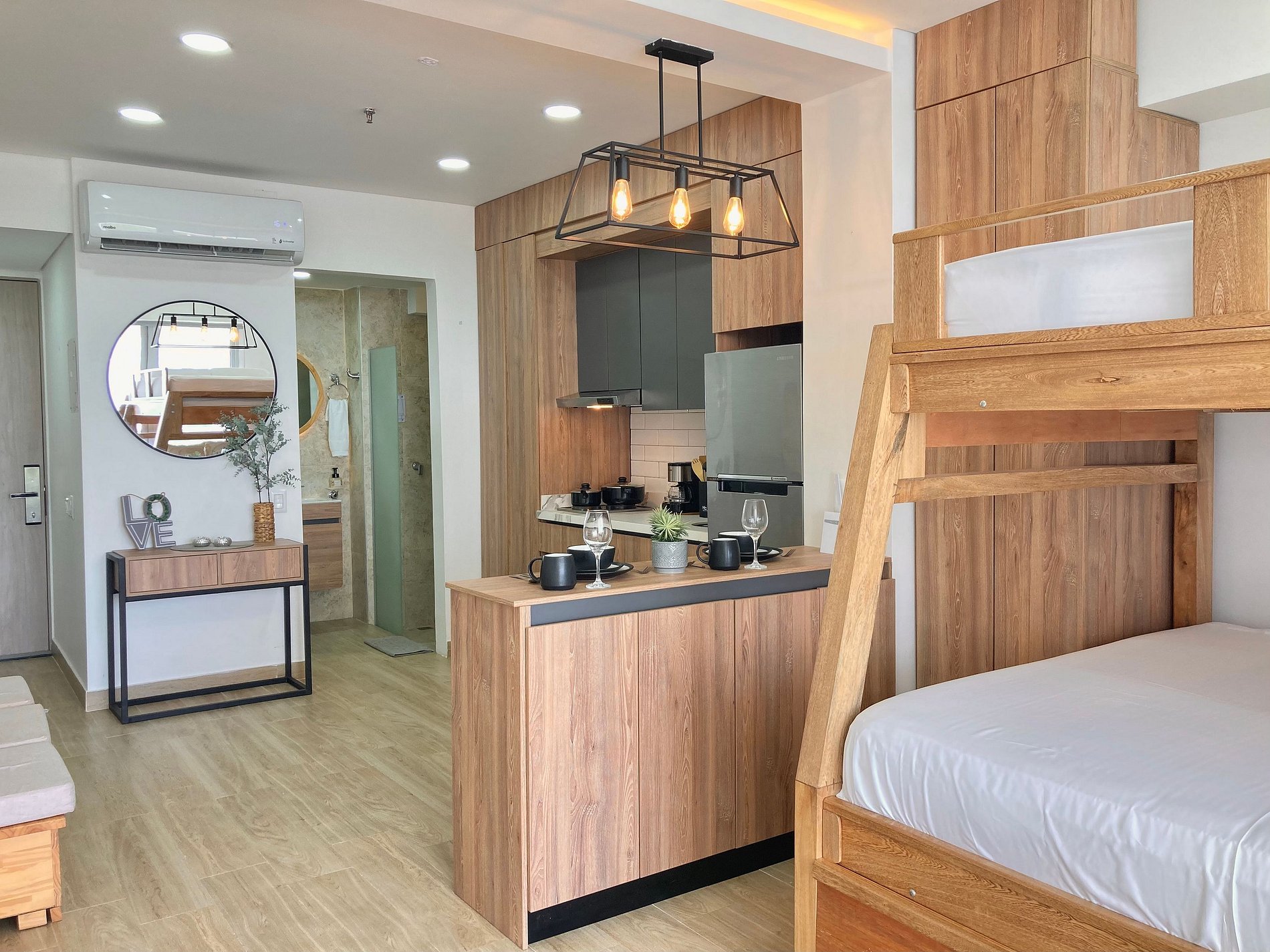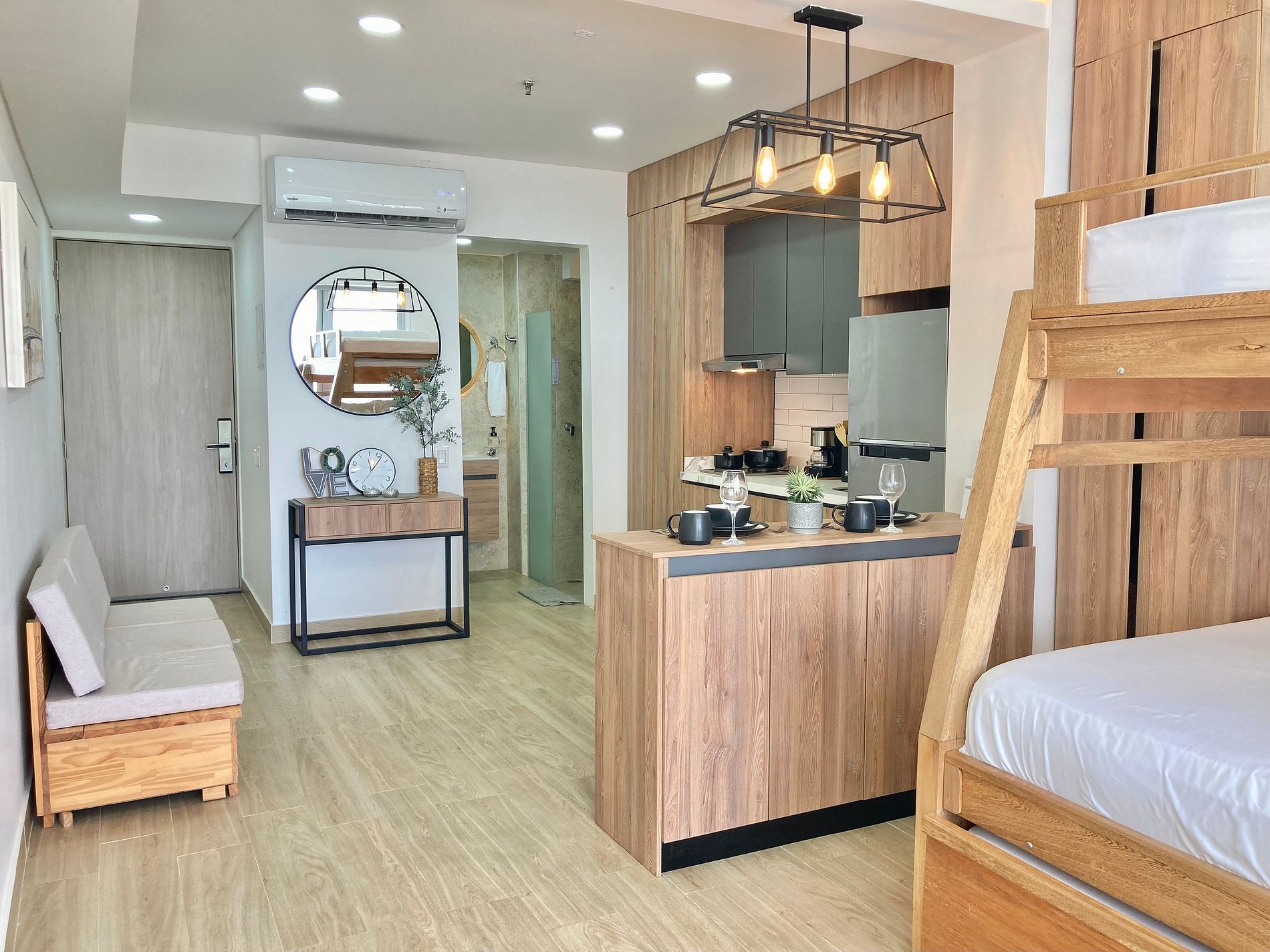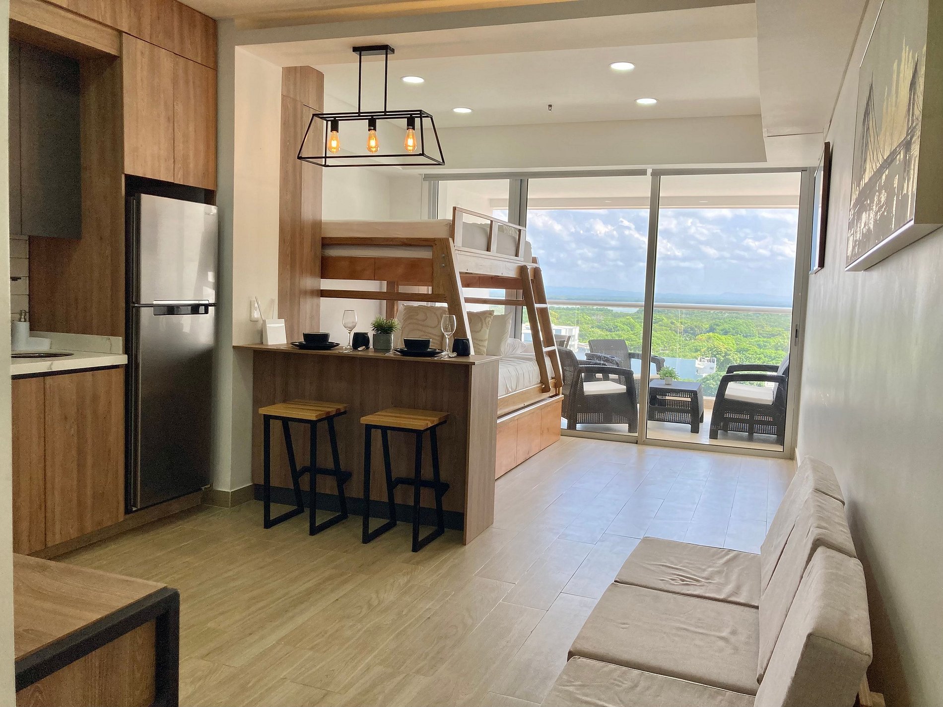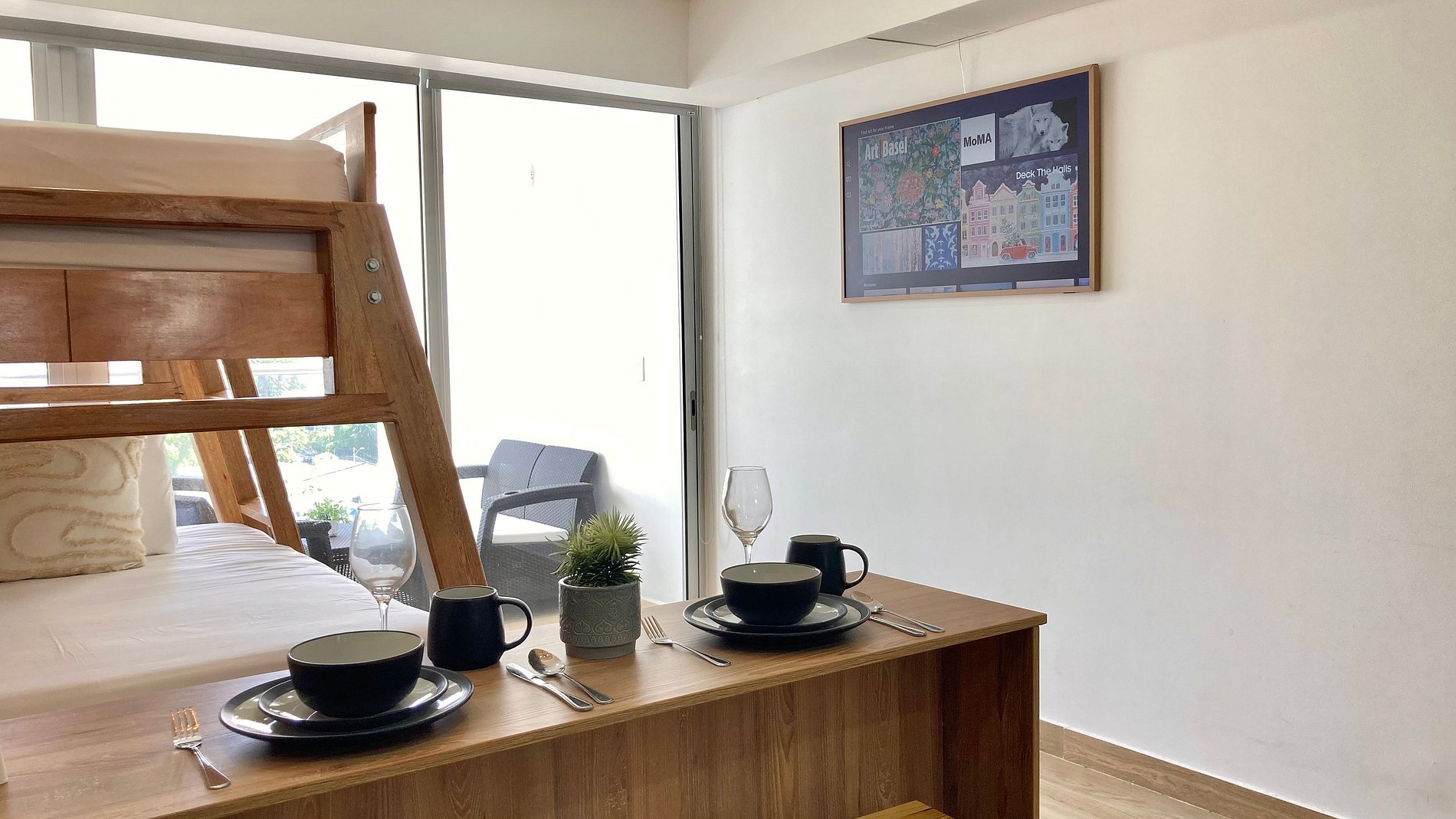 Loft familiar, piso 8 para hasta 4 huéspedes. Litera de madera: cama Queen abajo, cama nido Queen y cama doble arriba. Balcón amoblado con vistas a la Ciénaga, ciudad, aeropuerto y parcial al mar. Cocina equipada con barra-comedor, cafetera, licuadora y menaje. Smart TV, aire acondicionado e internet ultra rápido. En Cartagena Beach accede a piscina, piscina niños, vigilancia 24/7 y parking gratis. A pasos del aeropuerto, playa de Crespo, Parque Lineal con zonas infantiles y espacios deportivos.