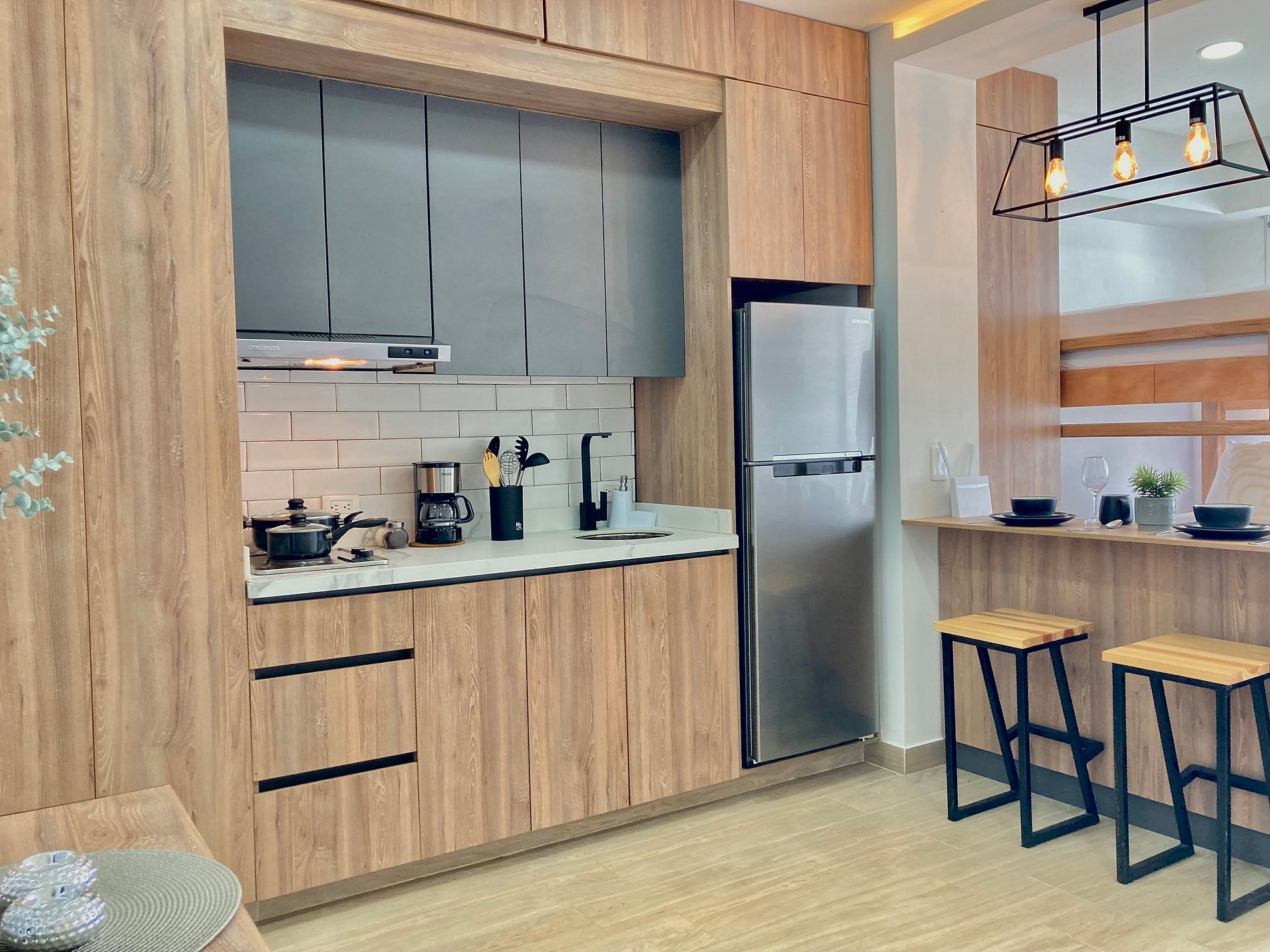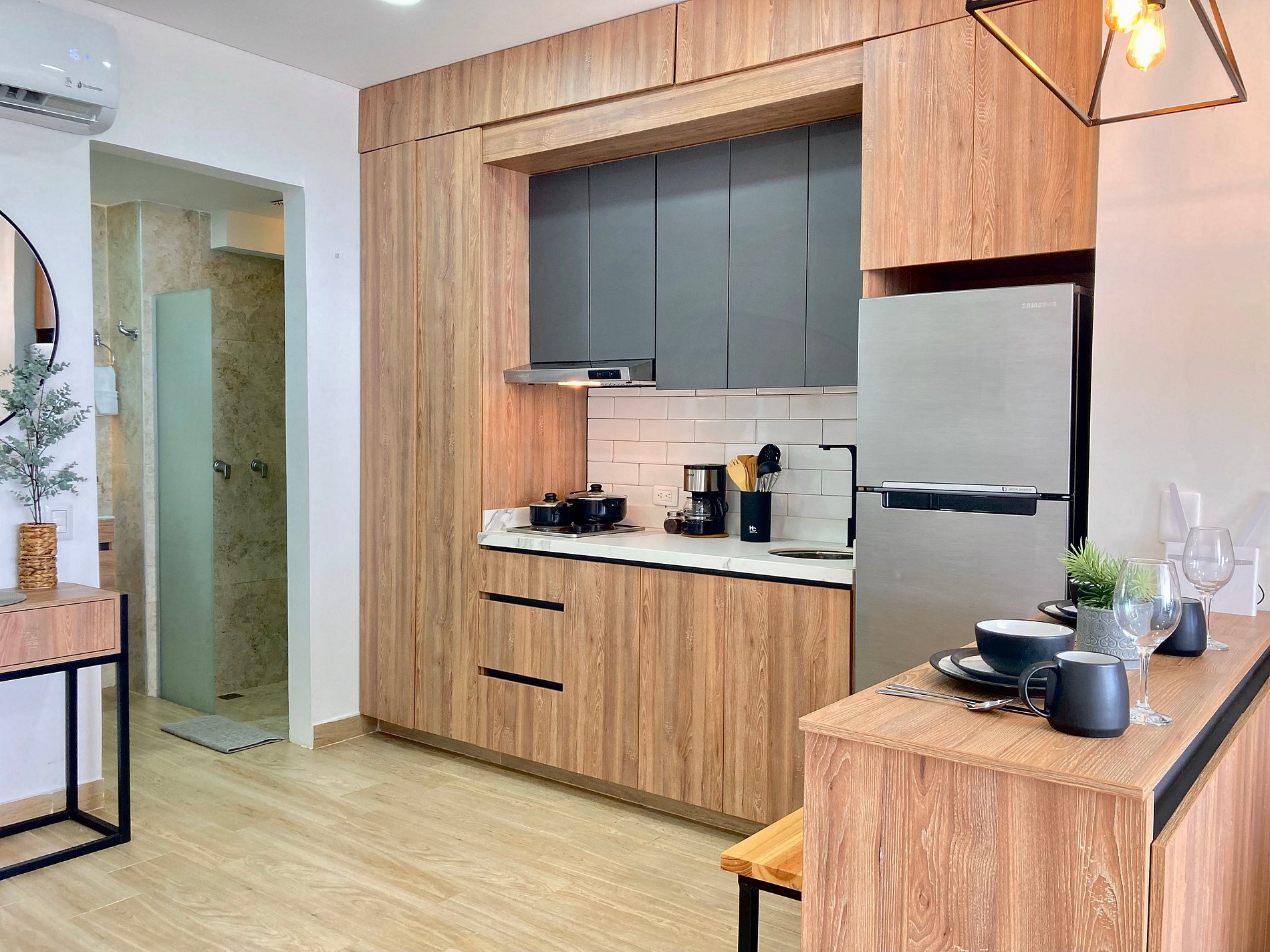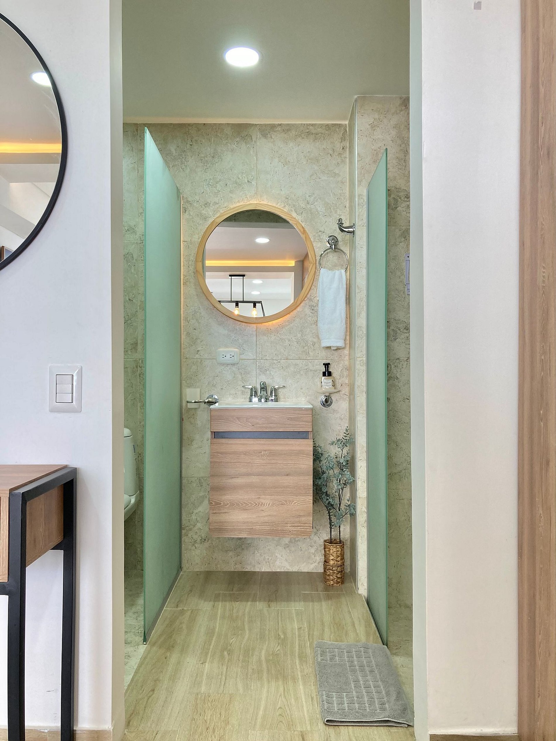 • Ambiente luminoso y moderno, con acabados en madera y tonos neutros que generan calidez.