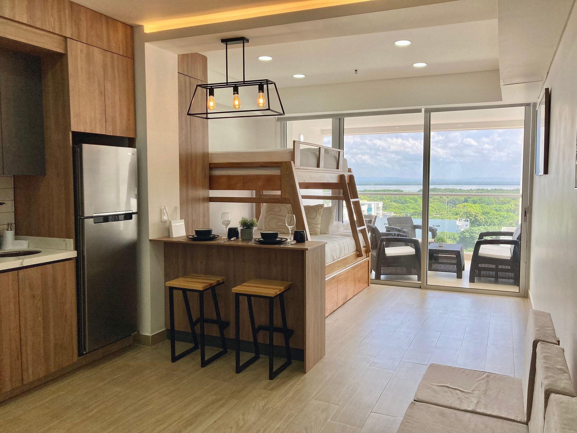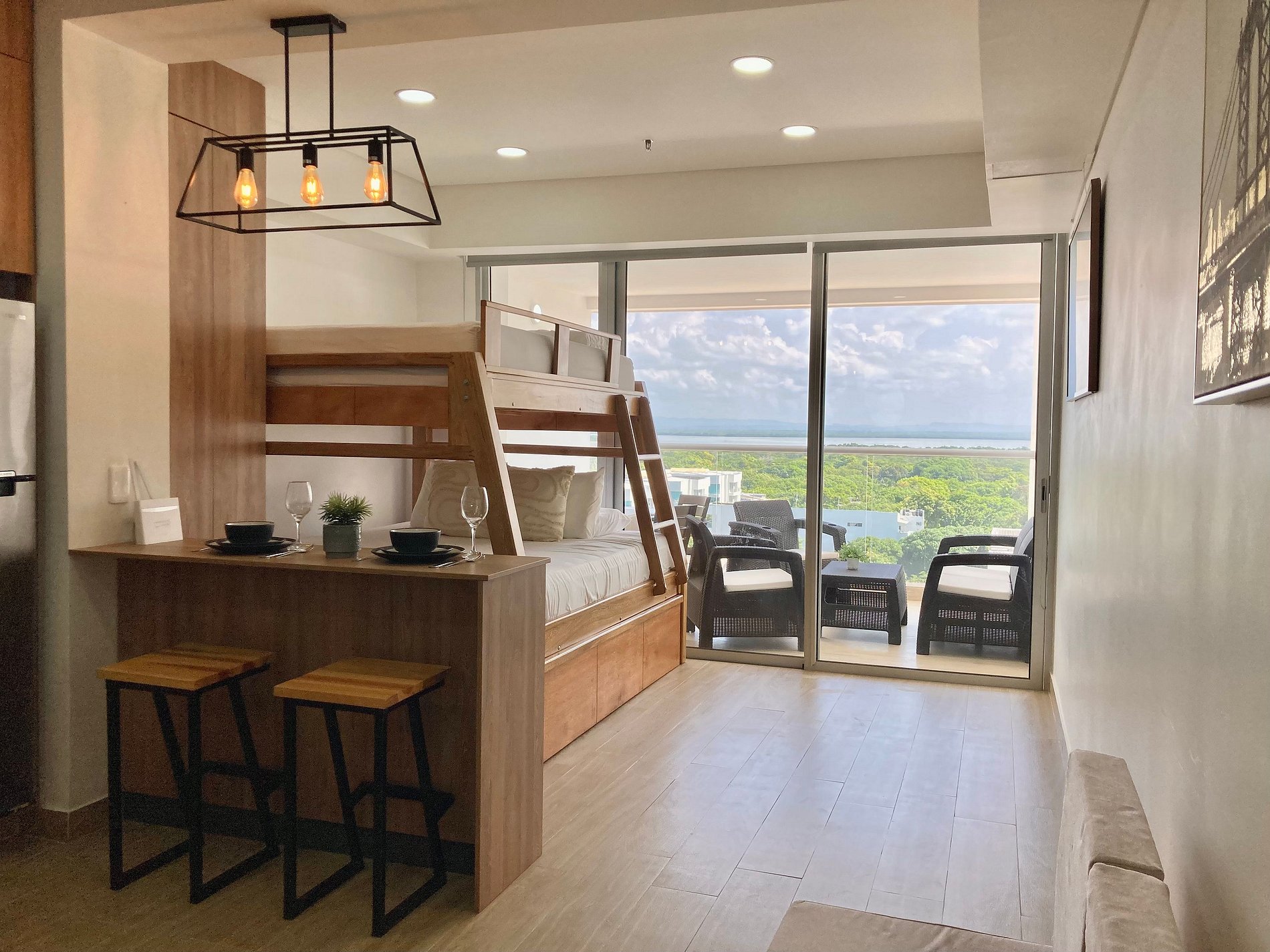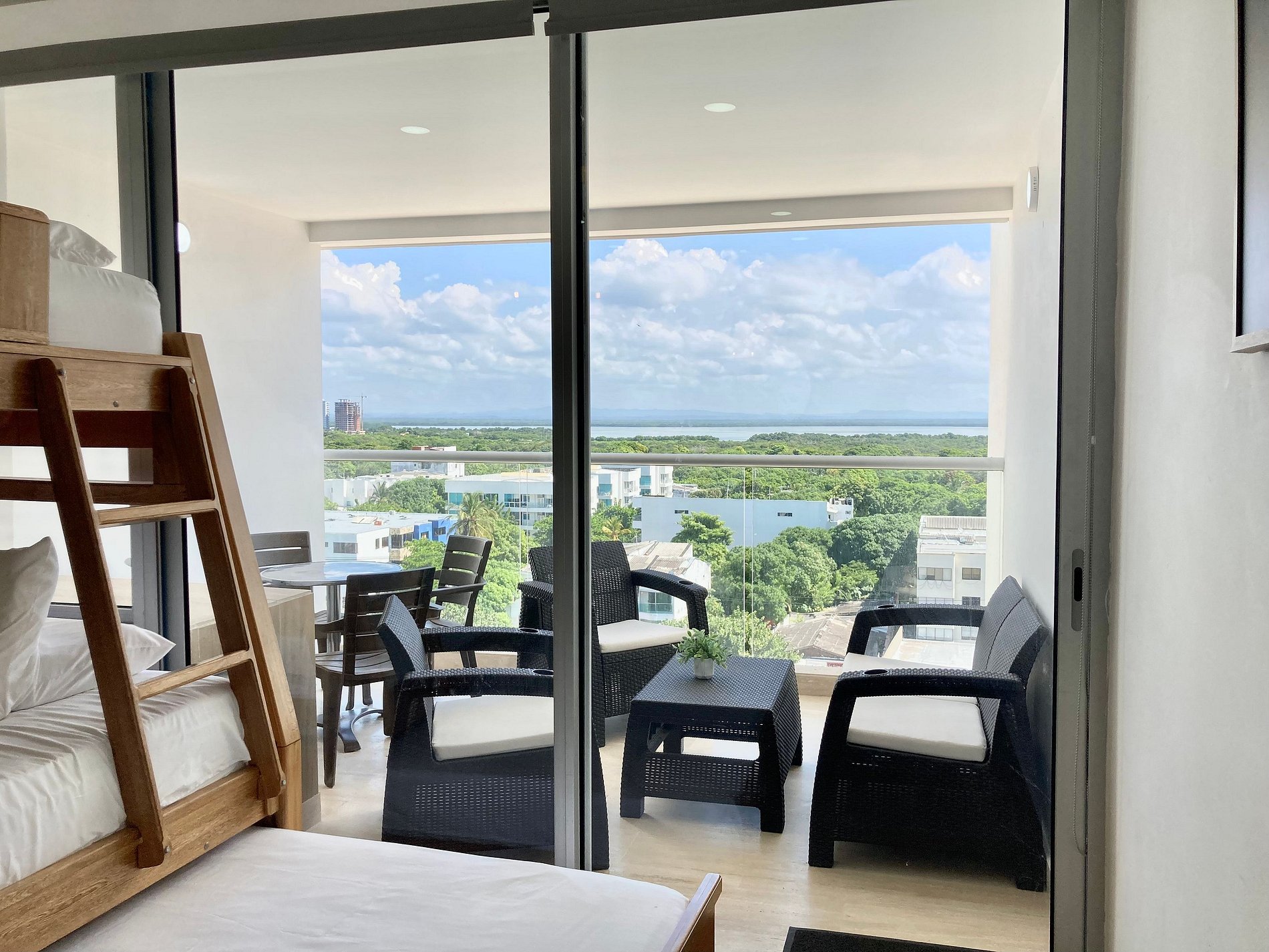 Loft familiar en piso 8 con capacidad para 4 huéspedes. Ofrece litera de madera con cama Queen abajo, cama nido Queen y cama doble arriba. Balcón amoblado con vistas a la Ciénaga, ciudad, aeropuerto y parcial al mar. Cocina equipada, Smart TV, aire acondicionado e internet ultra rápido, perfecto para vacaciones y trabajo remoto.