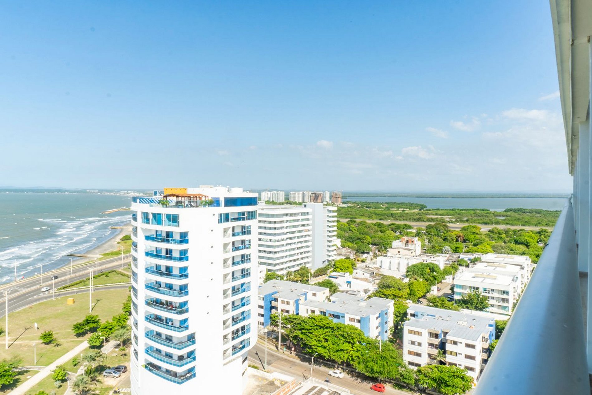 Apartamento en piso 16 con balcón amoblado y espectacular vista al mar. Cama Queen y cama nido, sala luminosa con Smart TV, aire acondicionado y cocina totalmente equipada. Ideal para hasta 4 huéspedes.