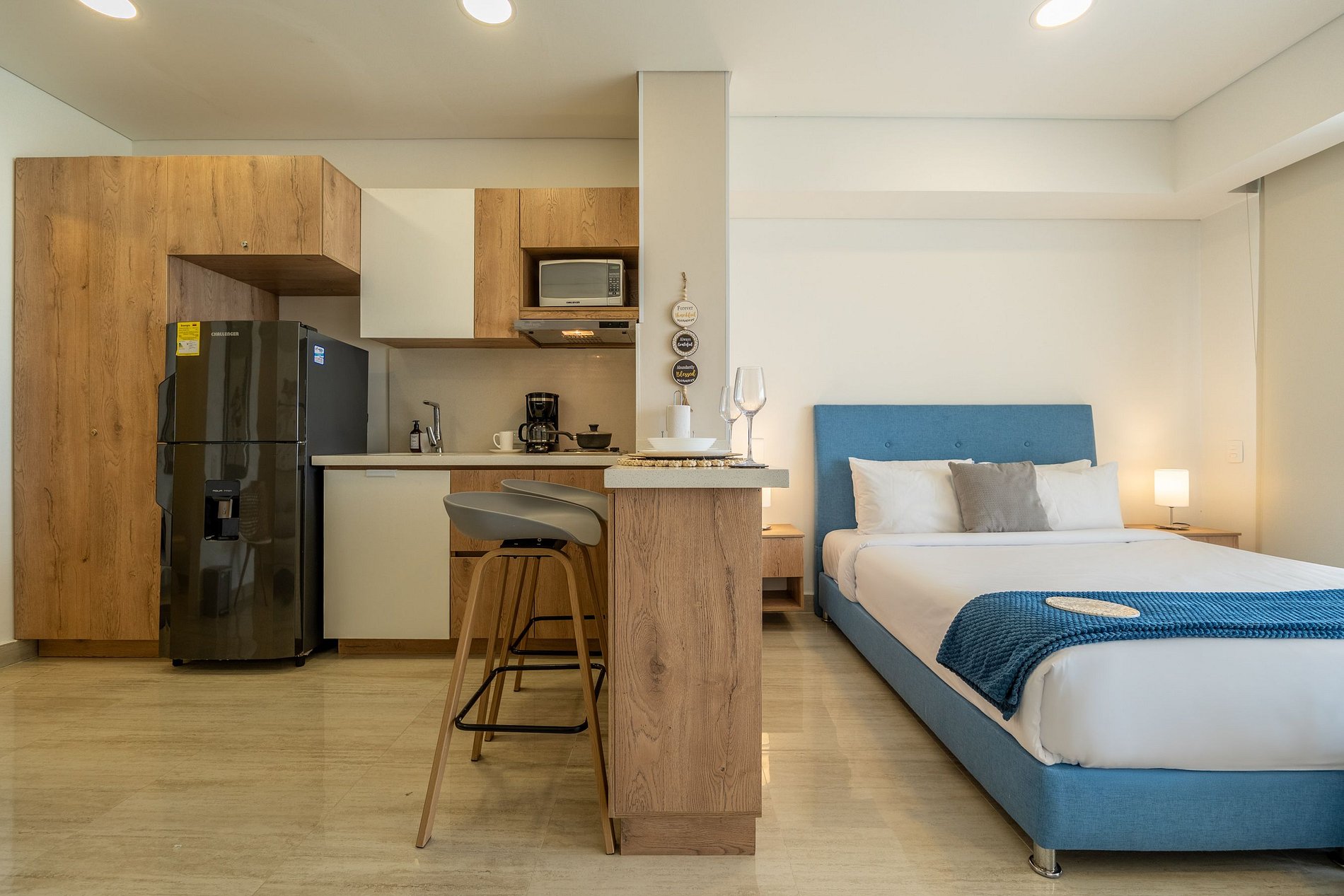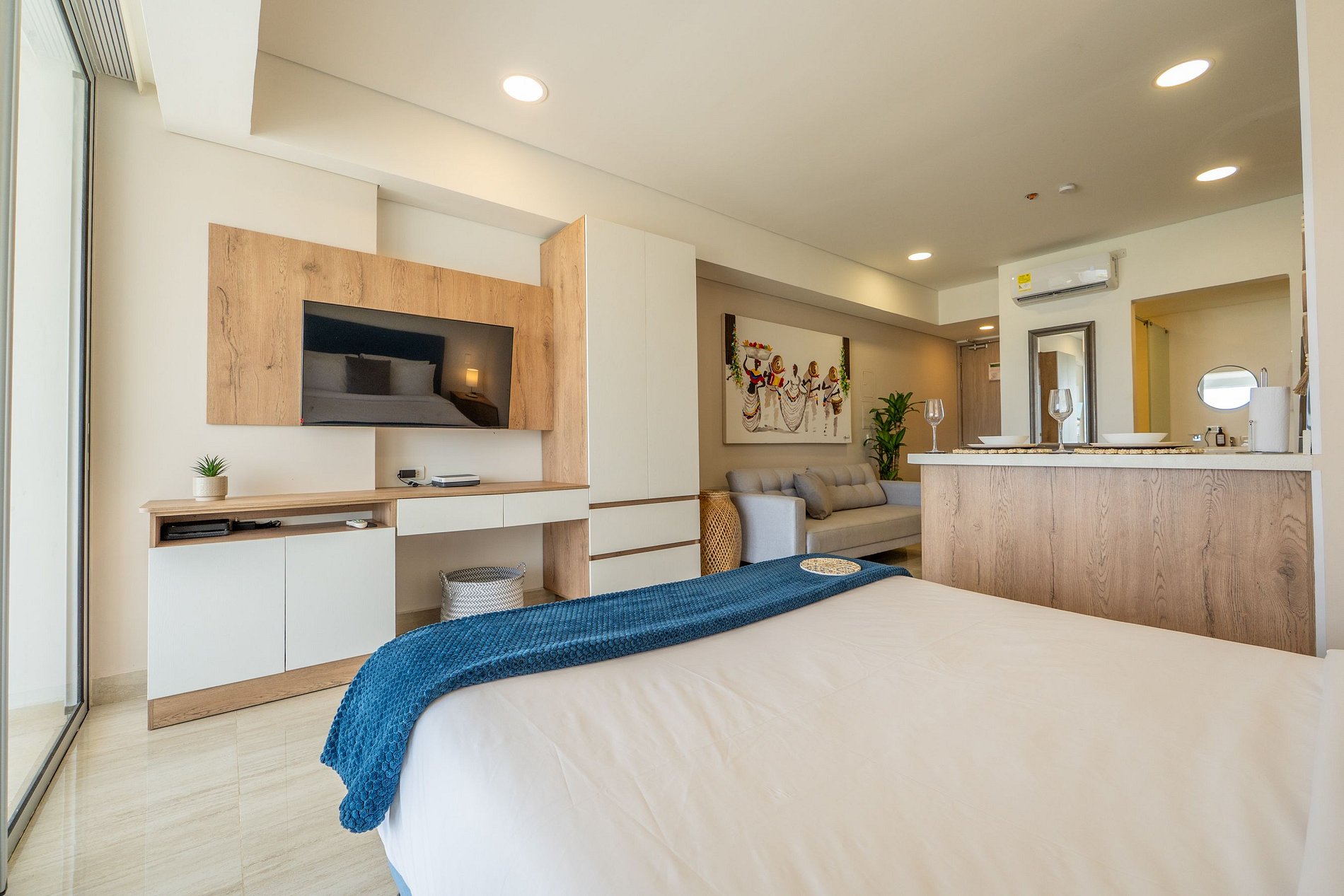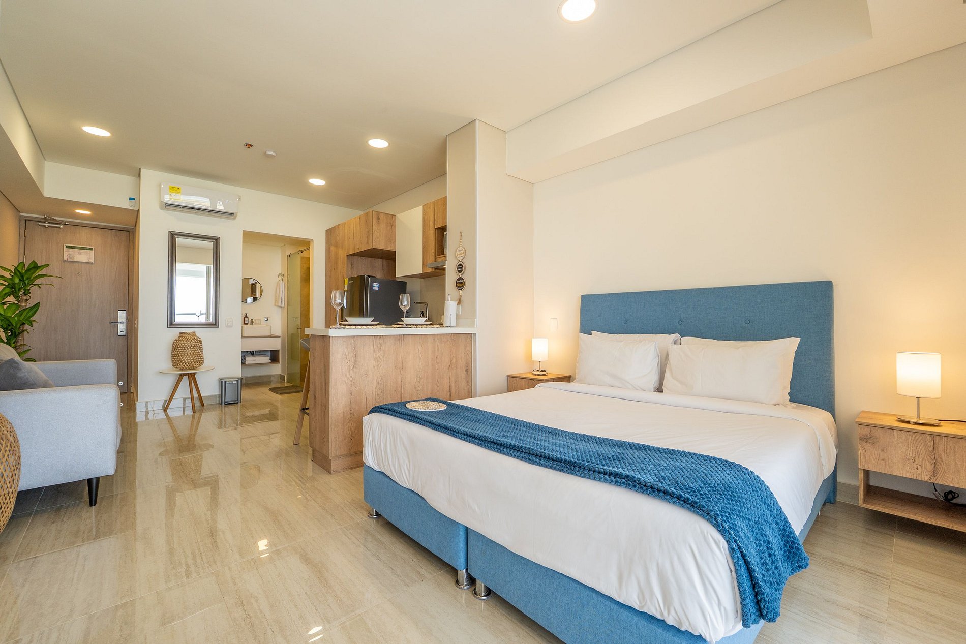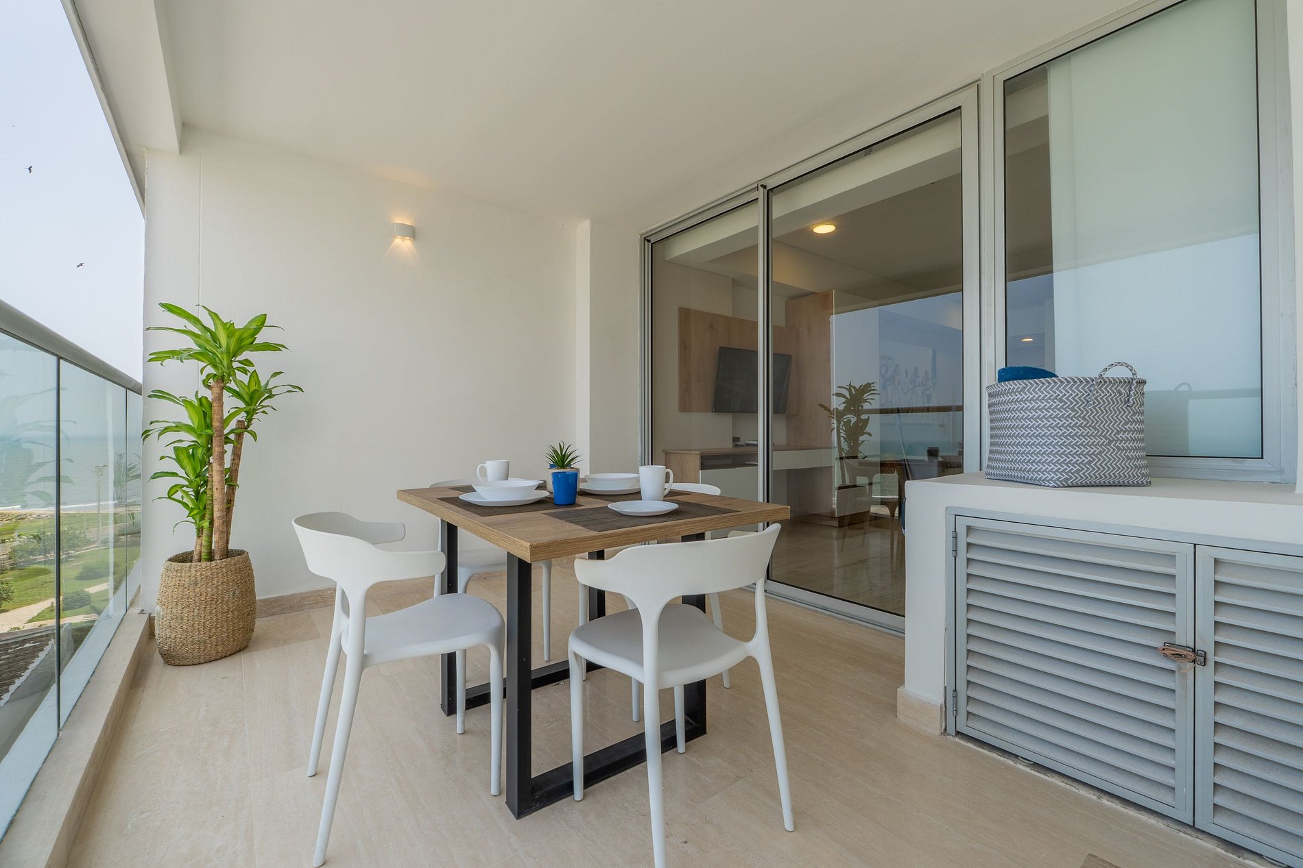 Apartamento moderno y luminoso con vista directa al mar desde la cama, la sala y el balcón. Equipado con cama Queen, sofá, cocina funcional con barra y un balcón amoblado ideal para disfrutar la brisa caribeña.