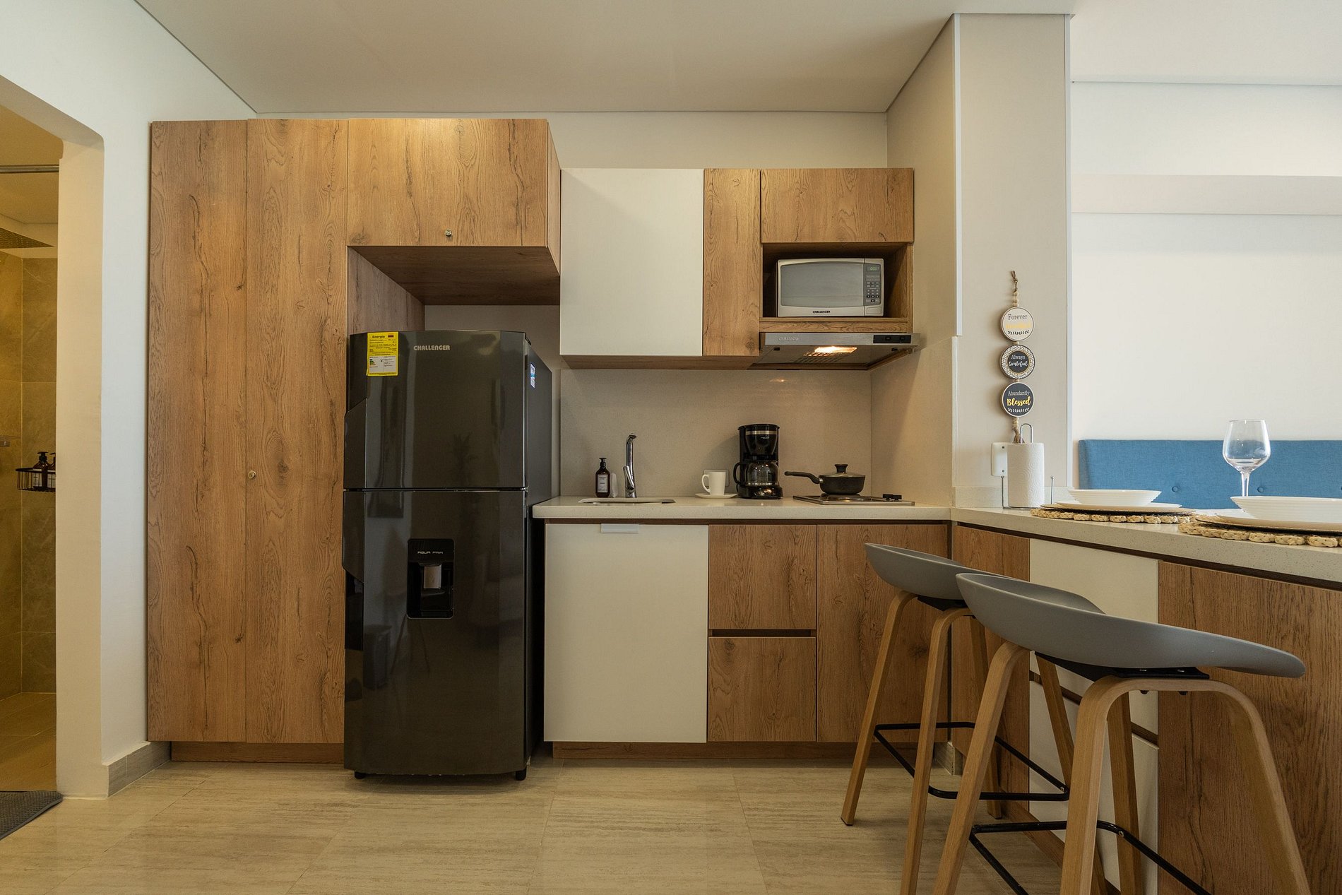 • Cocina equipada con nevera grande, estufa, microondas, cafetera, licuadora, sandwichera y menaje completo