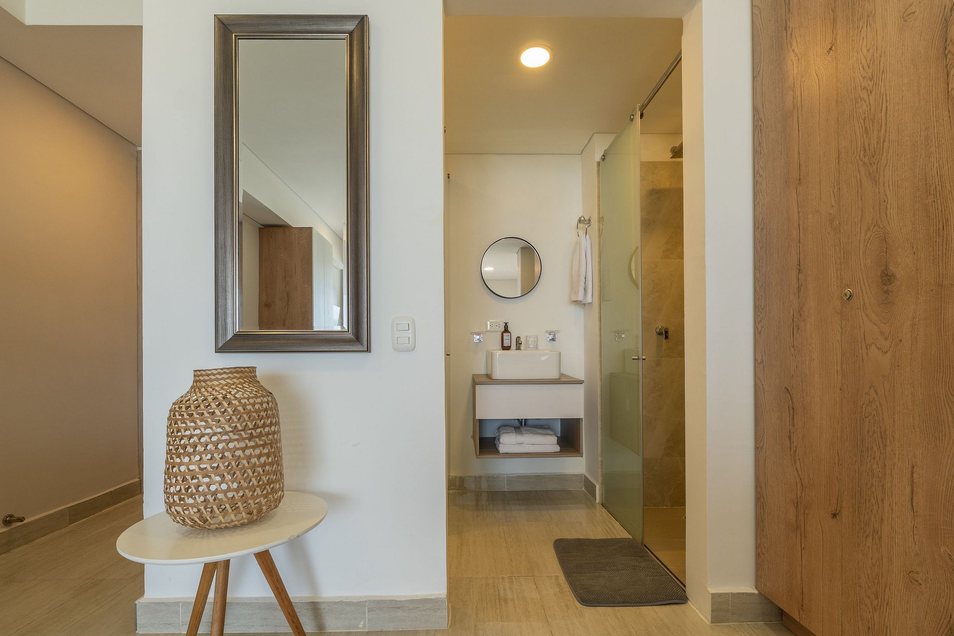 Escápate a este moderno apartamento frente al mar y despierta con una vista de postal desde la cama, la sala y el balcón. Relájate en el amplio balcón amoblado con la brisa caribeña o disfruta de la playa a solo un paso, cruzando el parque lineal. Cuenta con cama Queen, sofá y cocina equipada con barra para comer o trabajar. Ubicado en Cartagena Beach, con piscina semiolímpica, piscina para niños, sauna y turco. A solo 2 minutos del aeropuerto y cerca de restaurantes y comercios.