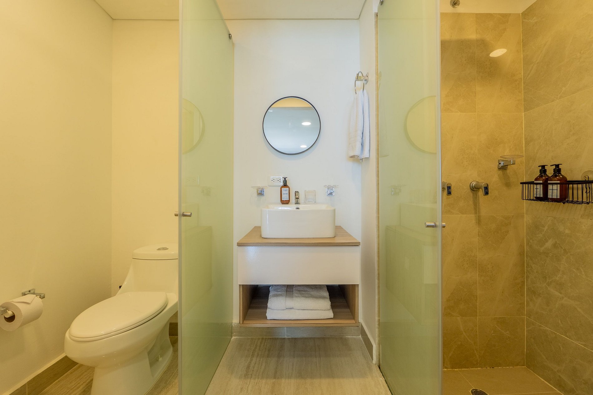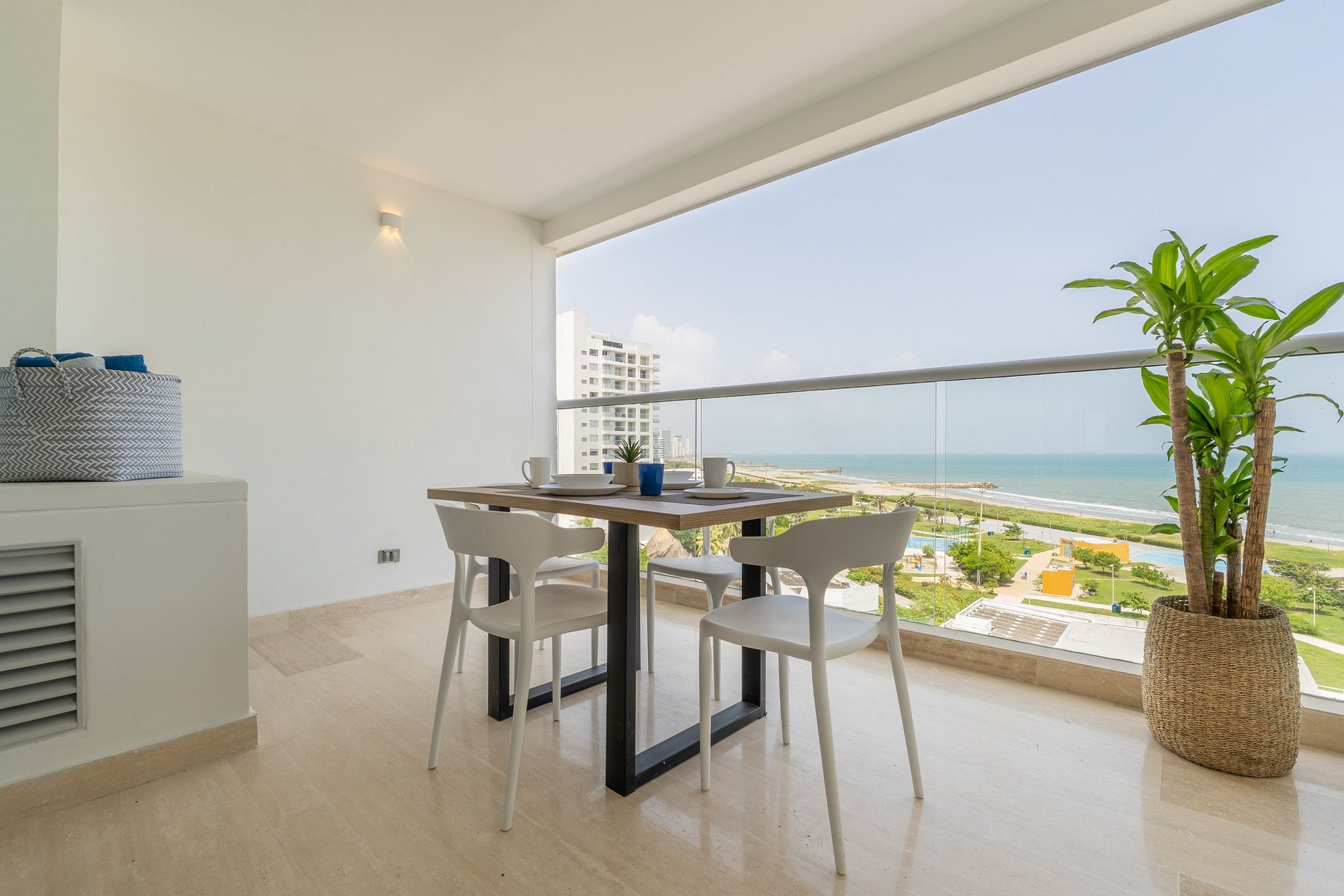 Escápate a este moderno apartamento frente al mar y despierta con una vista de postal desde la cama, la sala y el balcón. Relájate en el amplio balcón amoblado con la brisa caribeña o disfruta de la playa a solo un paso, cruzando el parque lineal. Cuenta con cama Queen, sofá y cocina equipada con barra para comer o trabajar. Ubicado en Cartagena Beach, con piscina semiolímpica, piscina para niños, sauna y turco. A solo 2 minutos del aeropuerto y cerca de restaurantes y comercios.