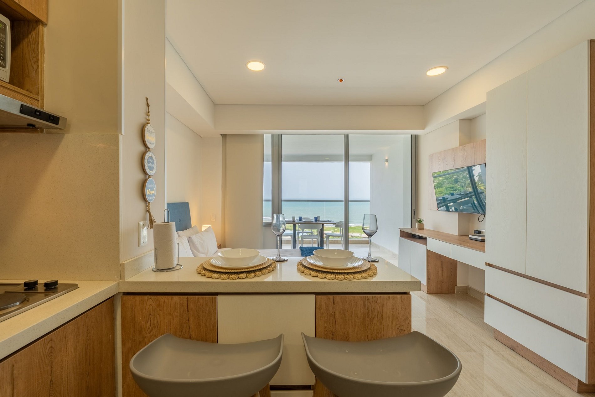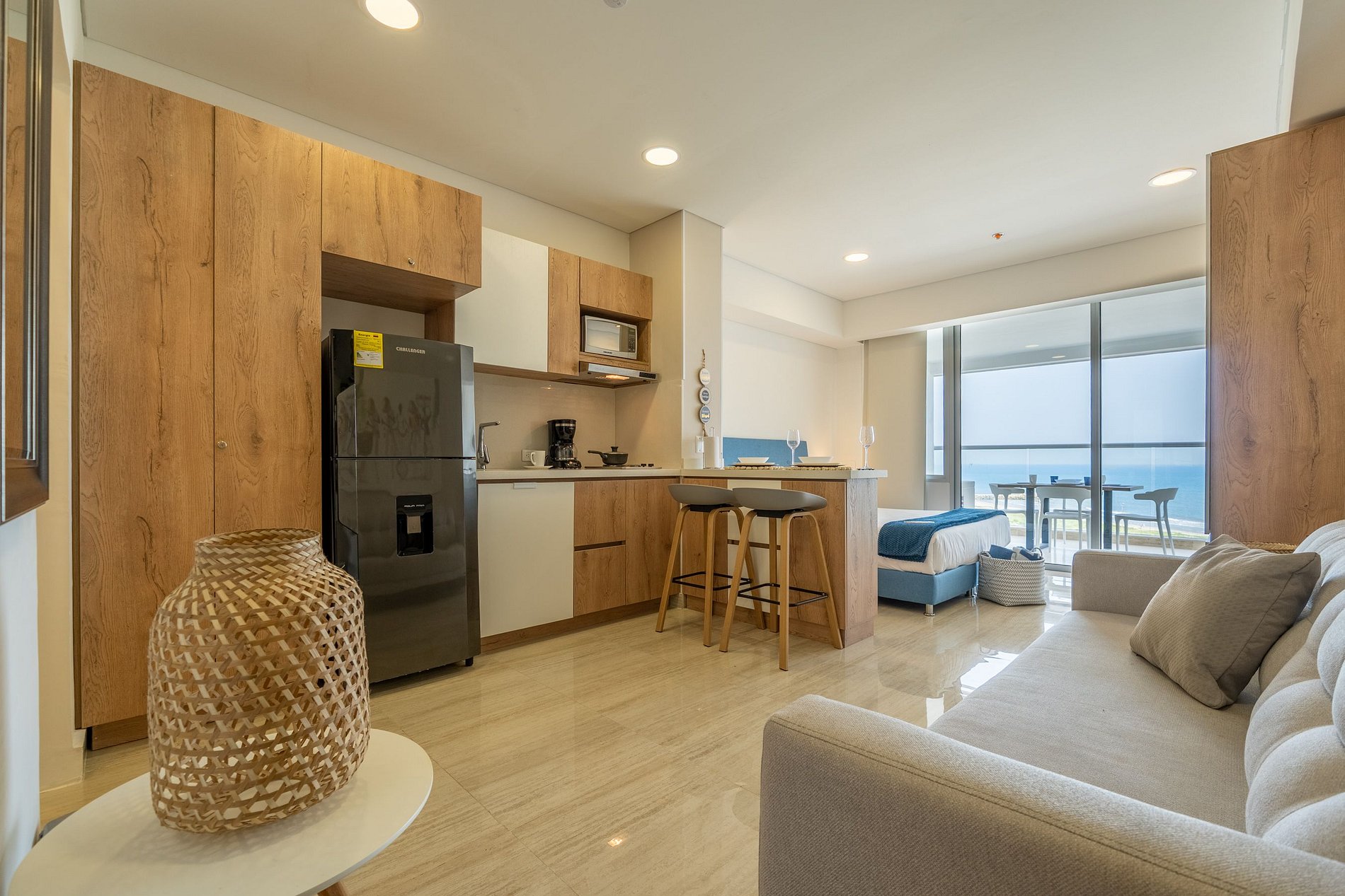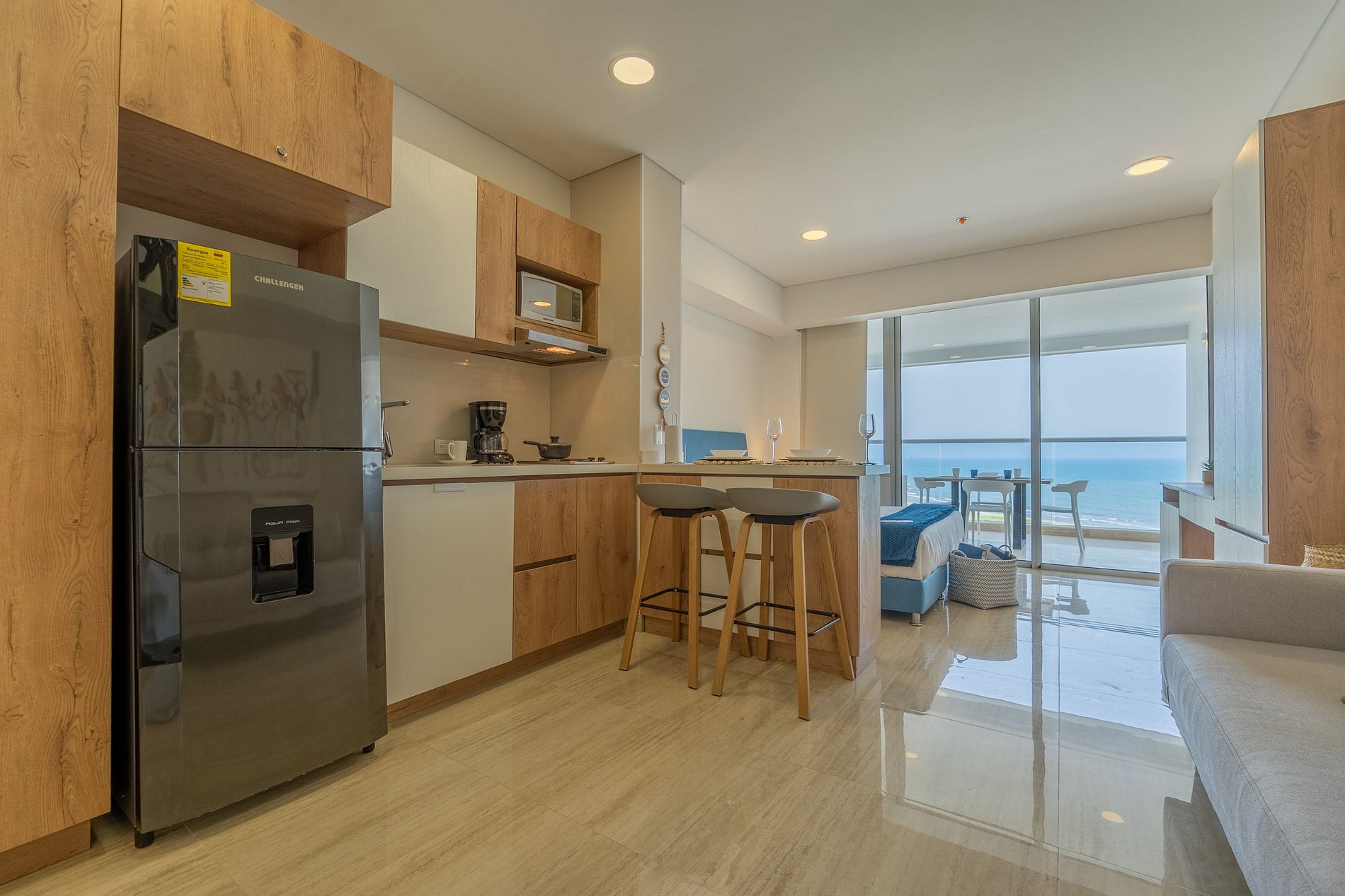 Apartamento moderno y luminoso con vista directa al mar desde la cama, la sala y el balcón. Equipado con cama Queen, sofá, cocina funcional con barra y un balcón amoblado ideal para disfrutar la brisa caribeña.