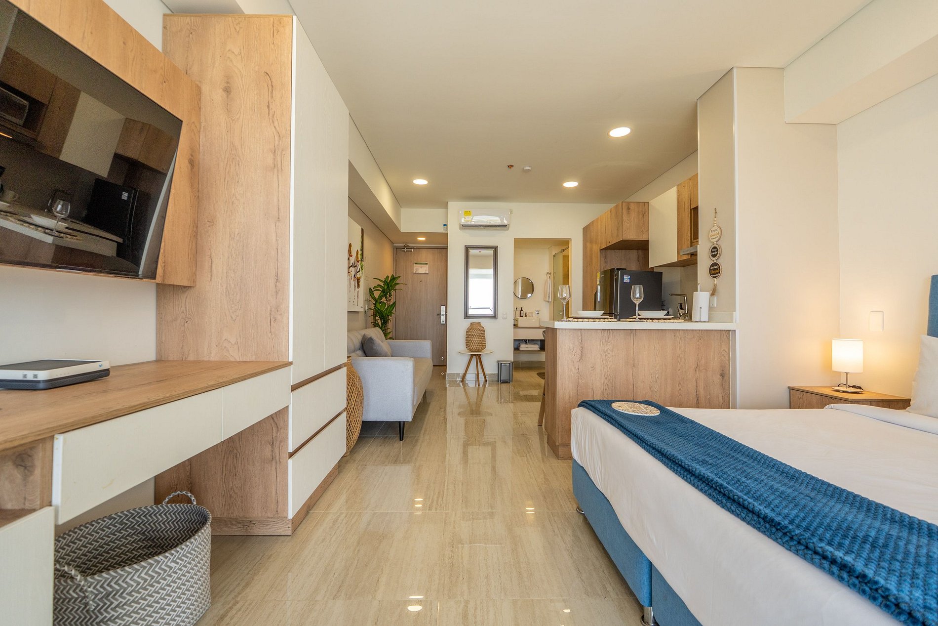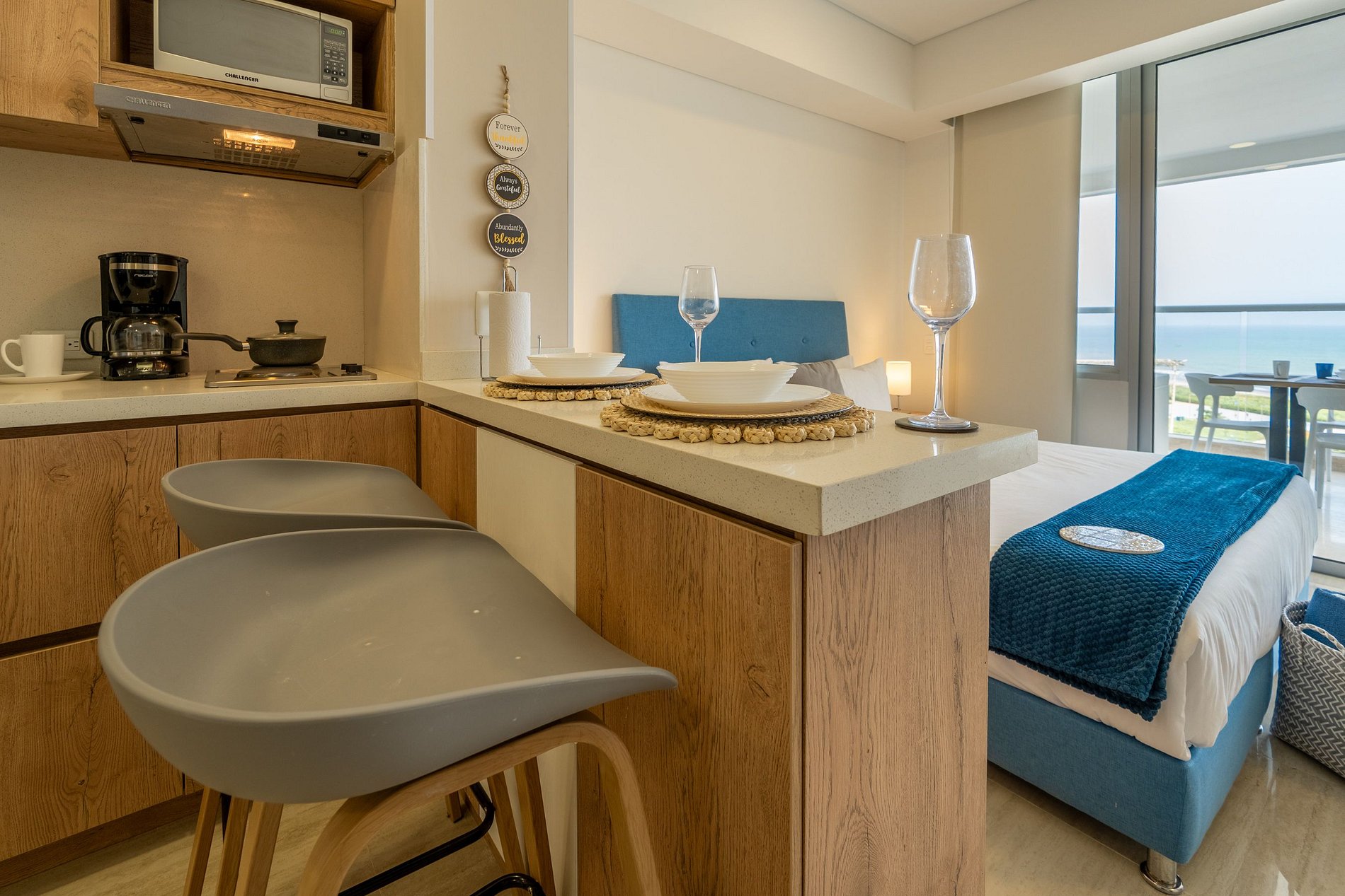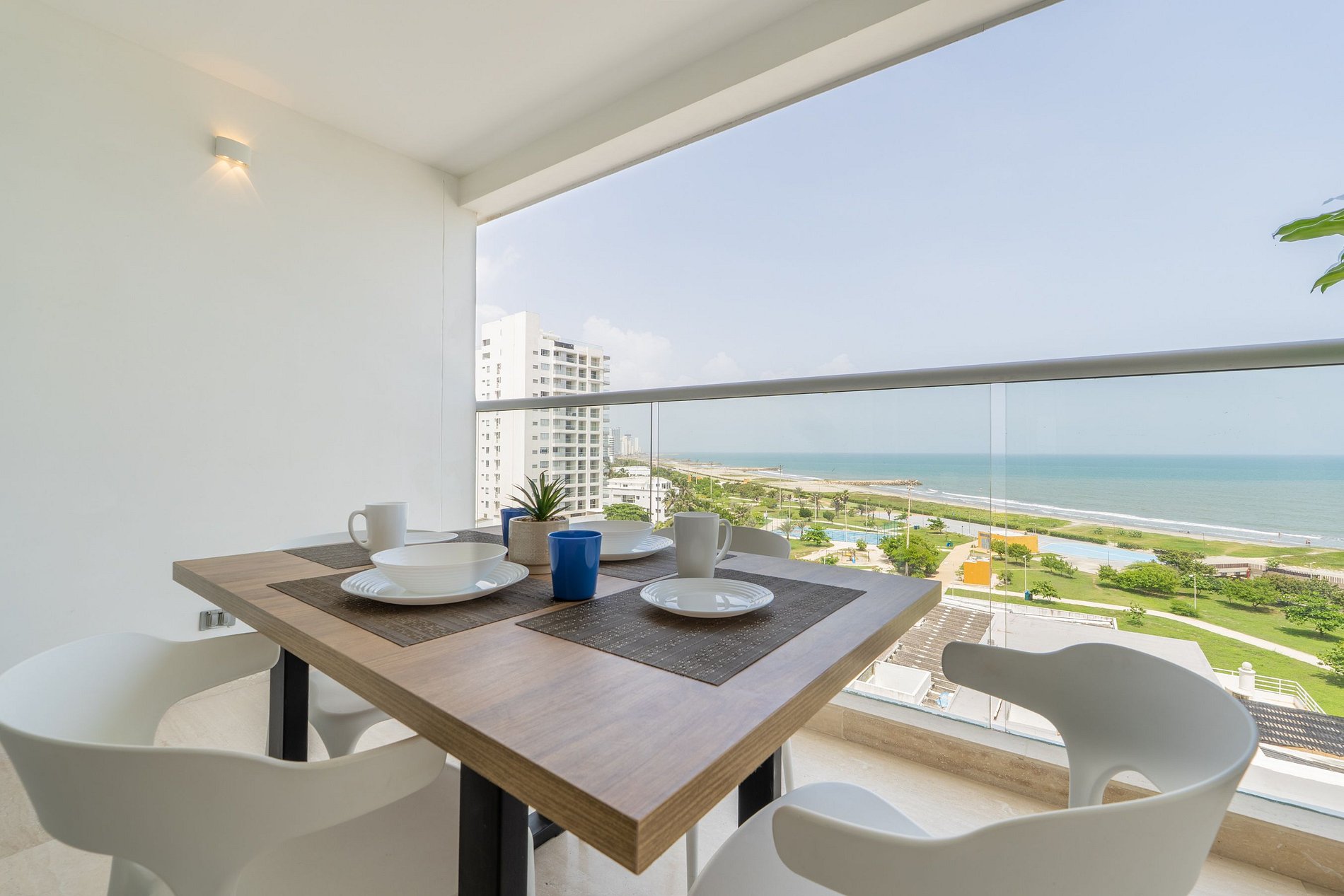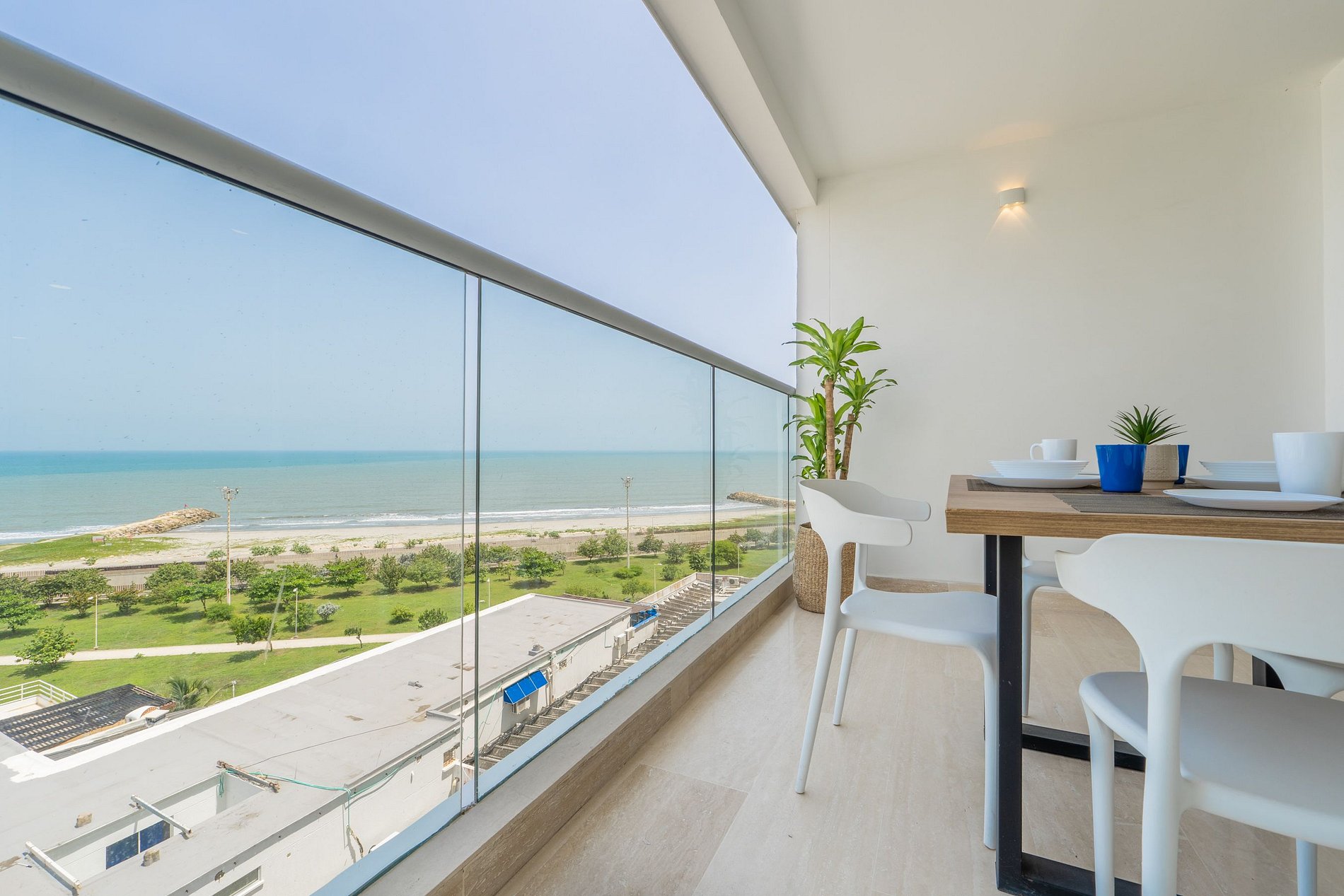 Apartamento moderno y luminoso con vista directa al mar desde la cama, la sala y el balcón. Equipado con cama Queen, sofá, cocina funcional con barra y un balcón amoblado ideal para disfrutar la brisa caribeña.