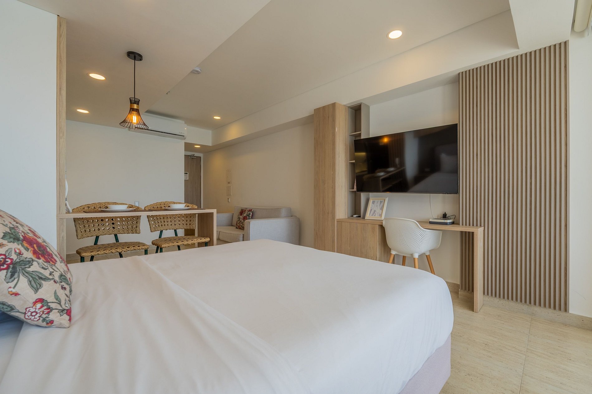 En el piso 15, esta suite luminosa combina madera cálida y diseño moderno con un gran balcón amoblado y vista al mar. Descansa en cama queen con blackout, aire acondicionado y Smart TV; trabaja cómodo en el escritorio. Cocina equipada (nevera grande, placa, microondas, cafetera, licuadora, hervidor y freidora de aire). Baño con ducha y amenities; lavadora/secadora. Wi‑Fi veloz y cerradura digital. El edificio cuenta con piscina, jacuzzi, sauna y turco recepción 24/7 junto a la playa.