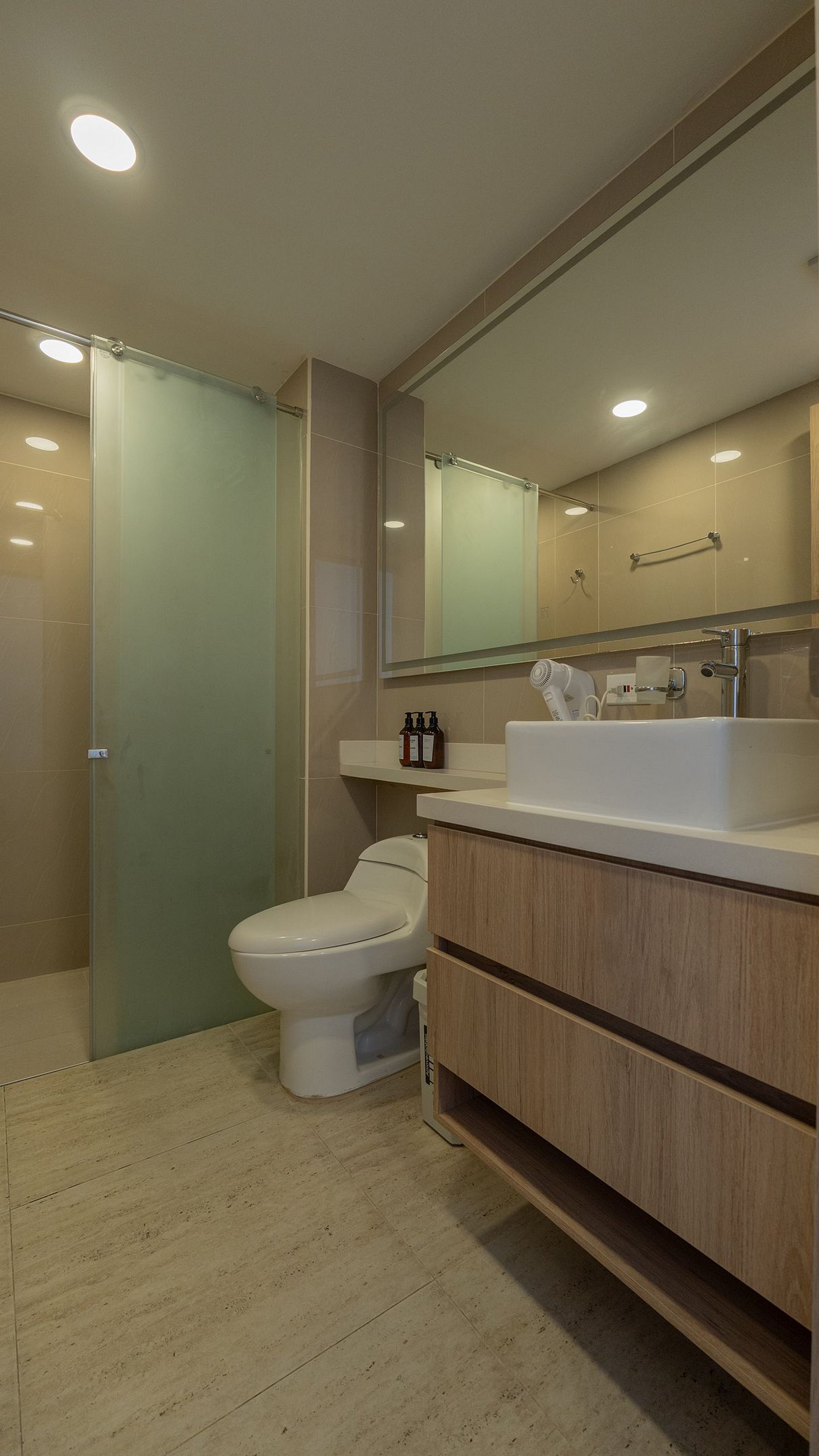 • Baño moderno con ducha amplia, agua caliente y amenities de cortesía