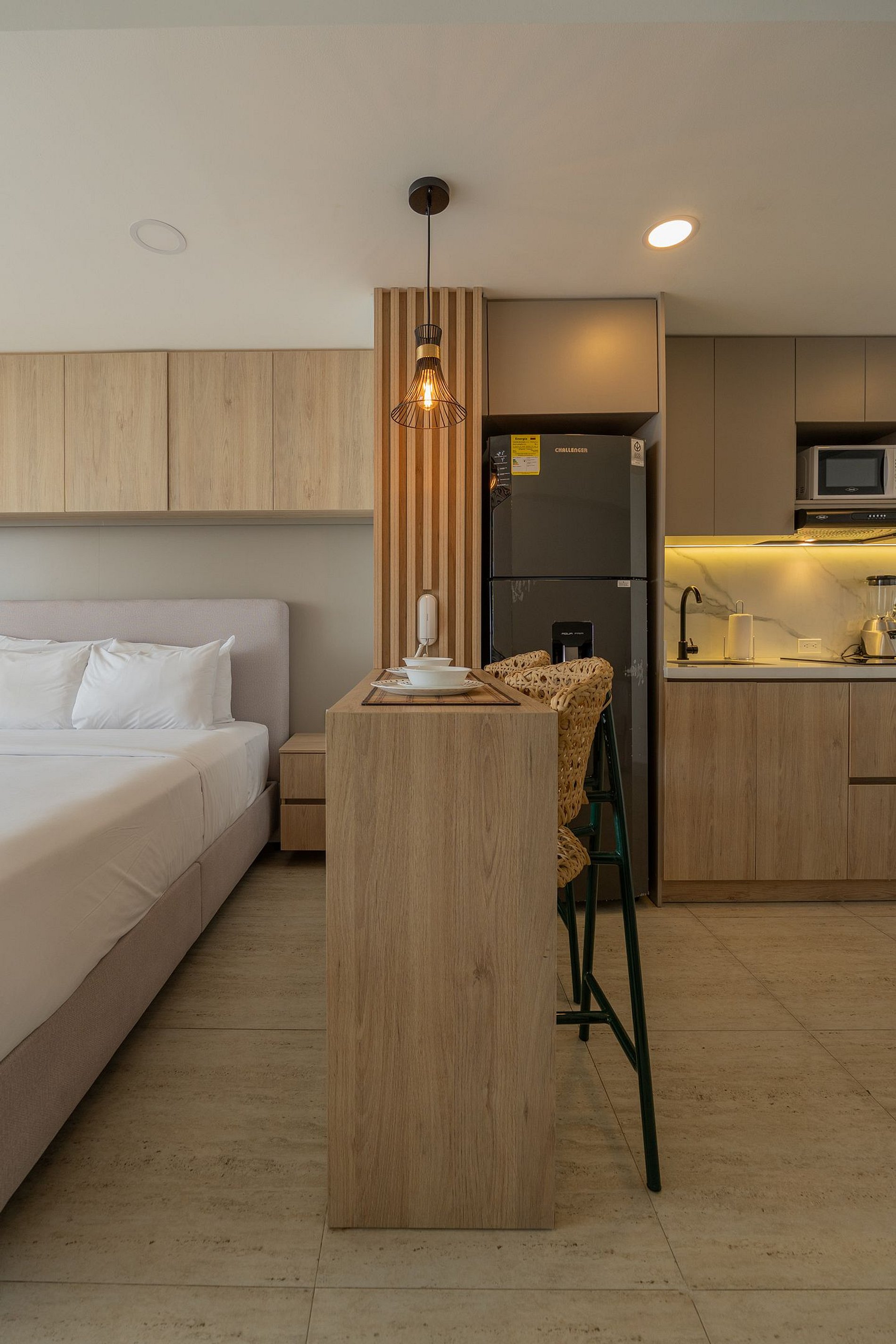Suite moderna en piso 15 con espectacular vista al mar y la ciudad. Cuenta con cama queen, sofá cama, cocina totalmente equipada, lavadora, Smart TV y balcón amoblado para disfrutar atardeceres únicos en Cartagena.