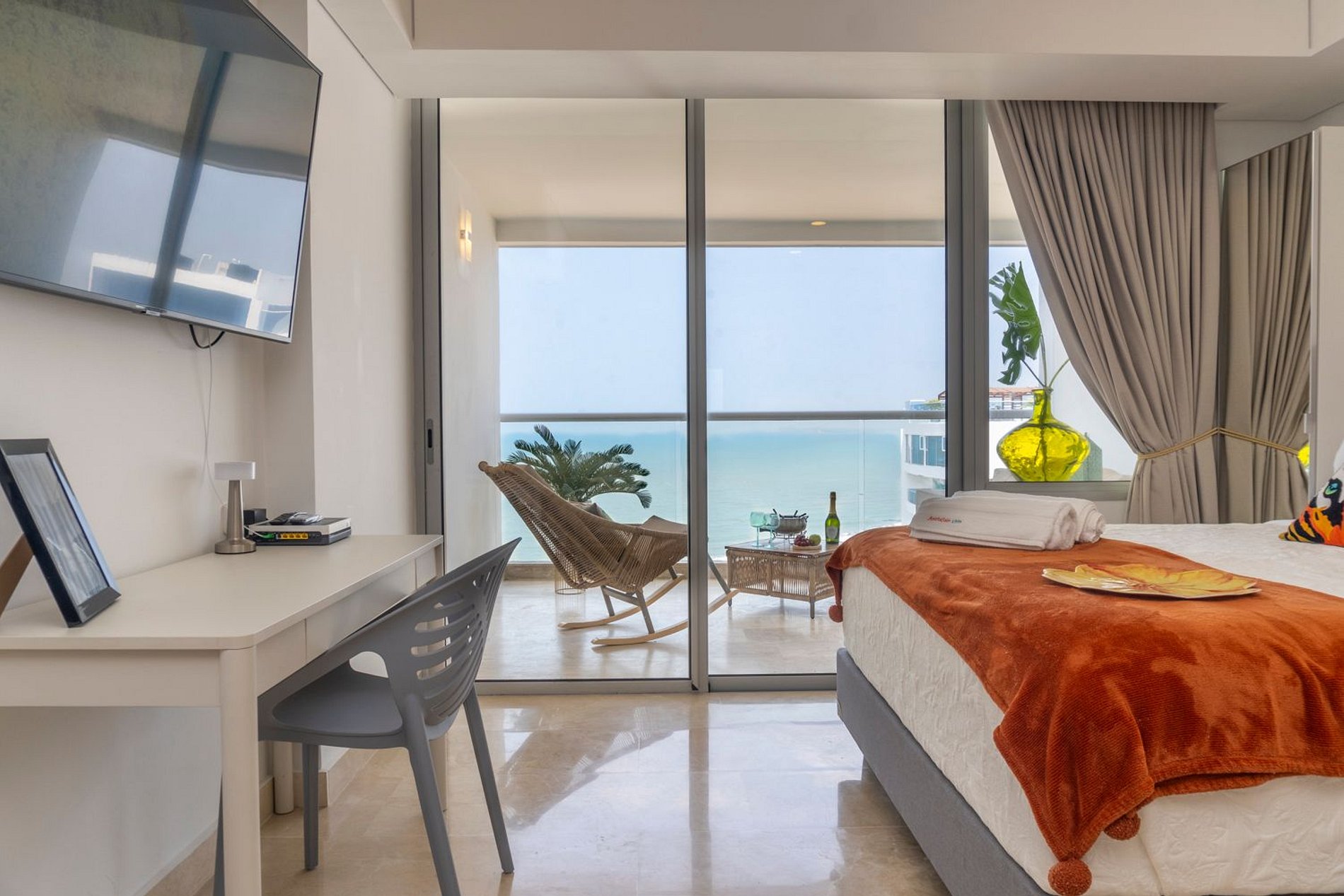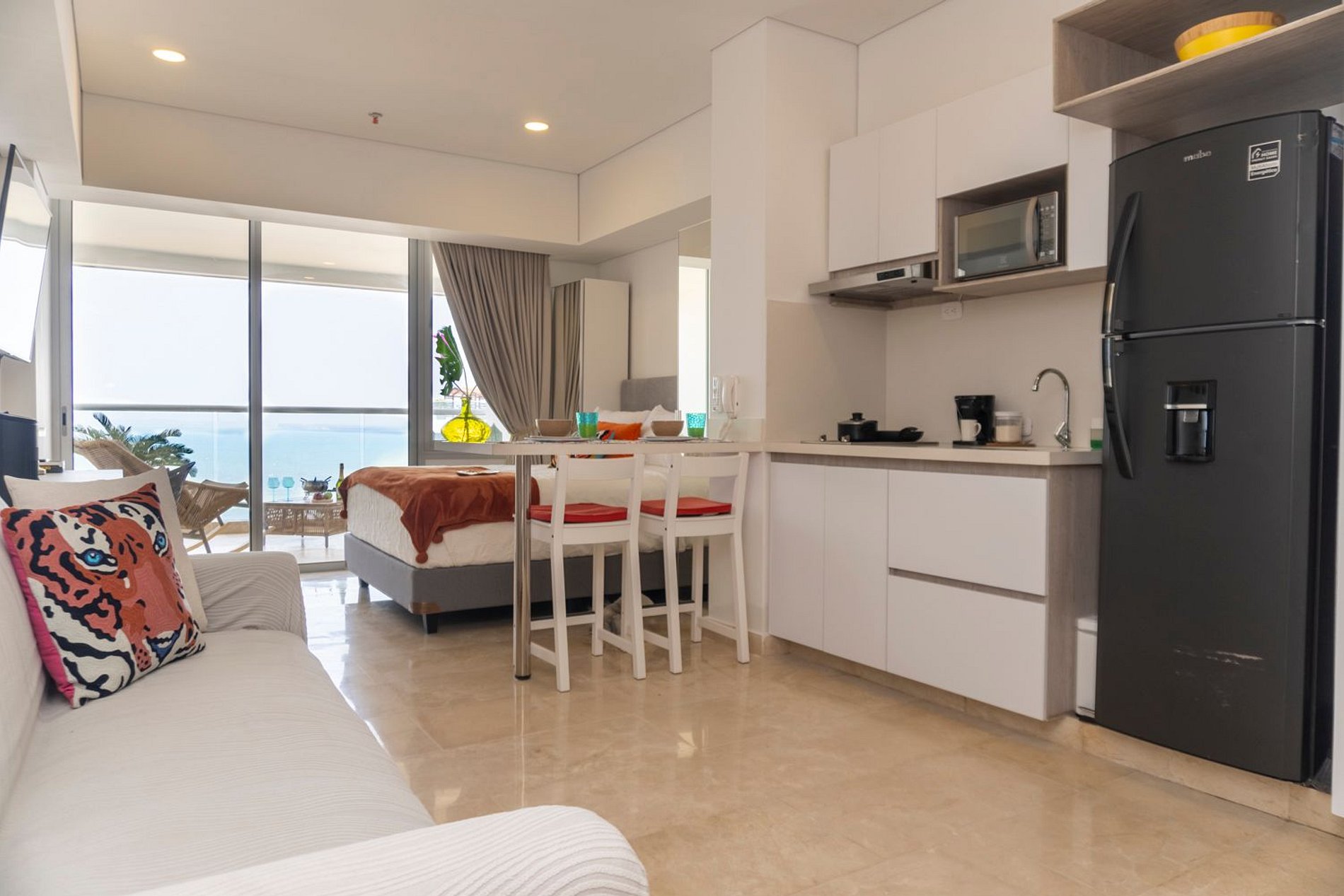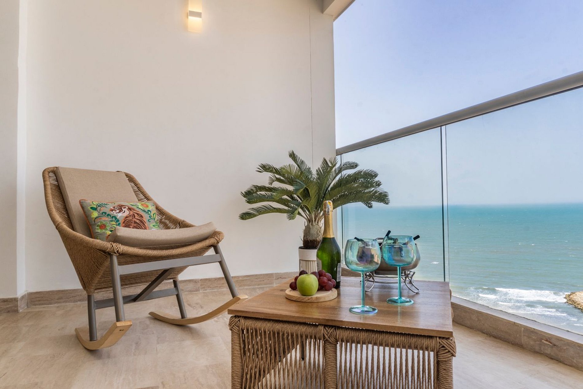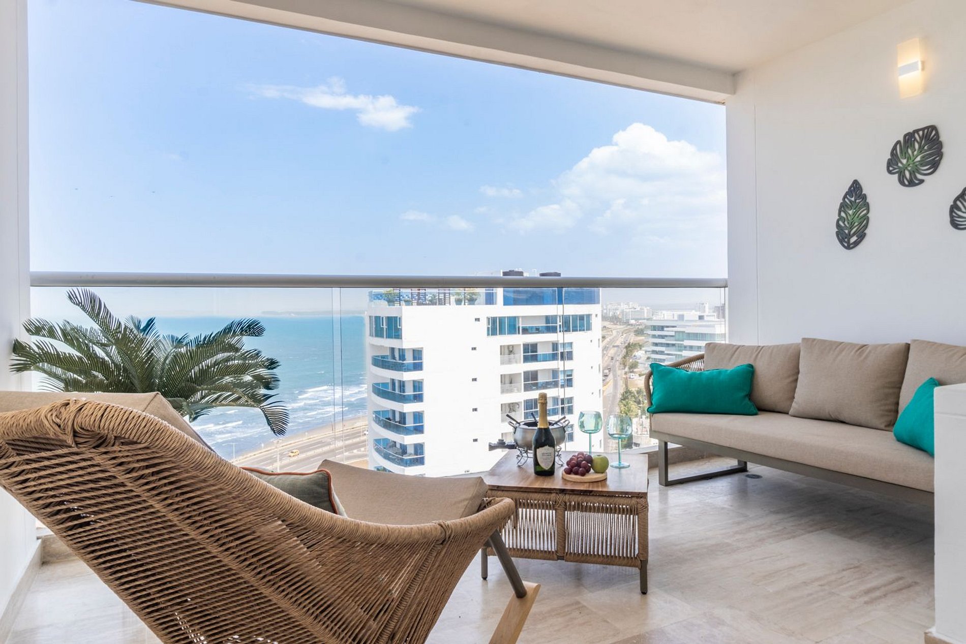 Suite moderna en piso 15 con balcón lounge amoblado y vista directa al mar. Cama Queen, sofá cama, cocina equipada, lavadora, Smart TV y aire acondicionado. Ideal para 4 huéspedes que buscan confort, estilo y atardeceres caribeños.