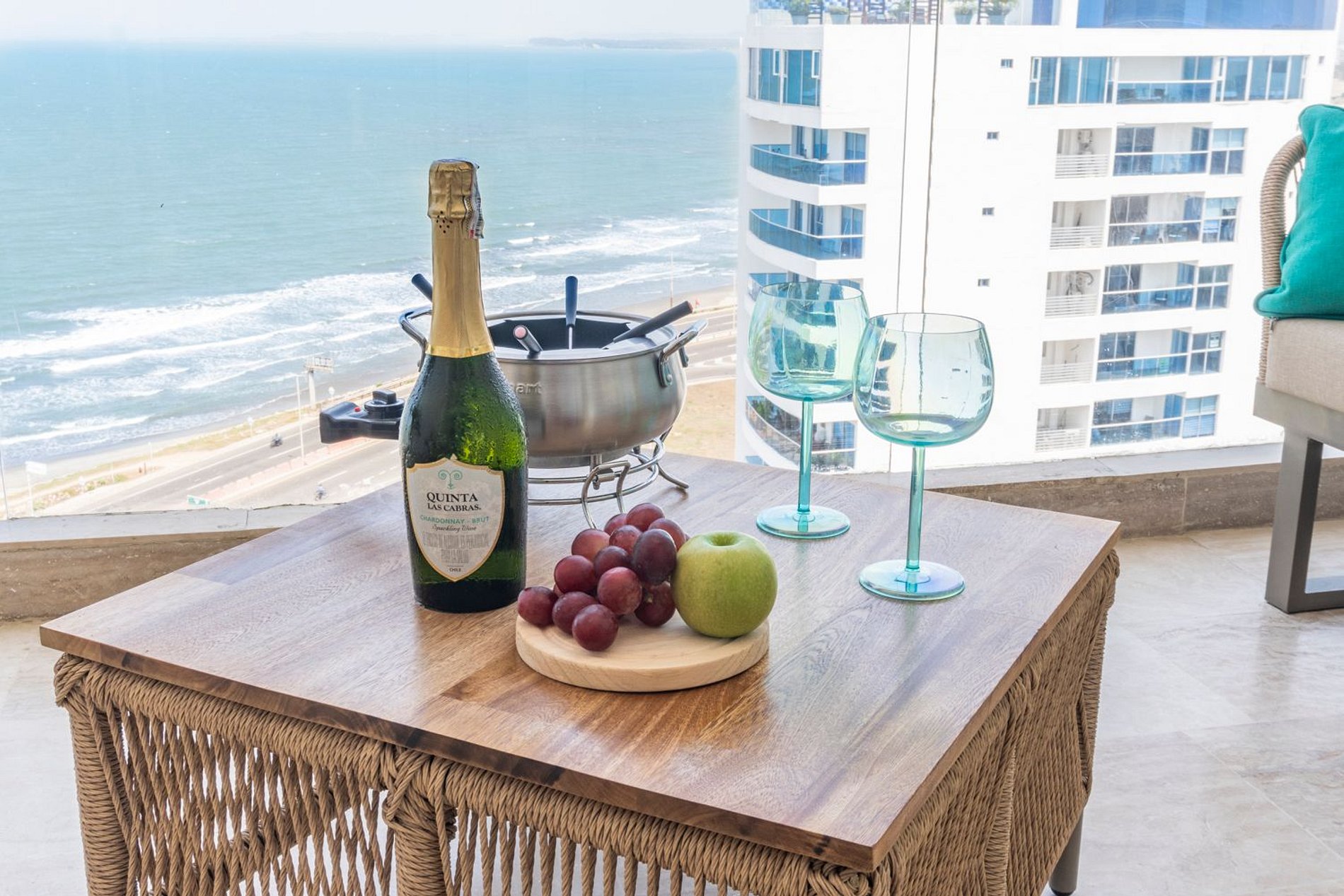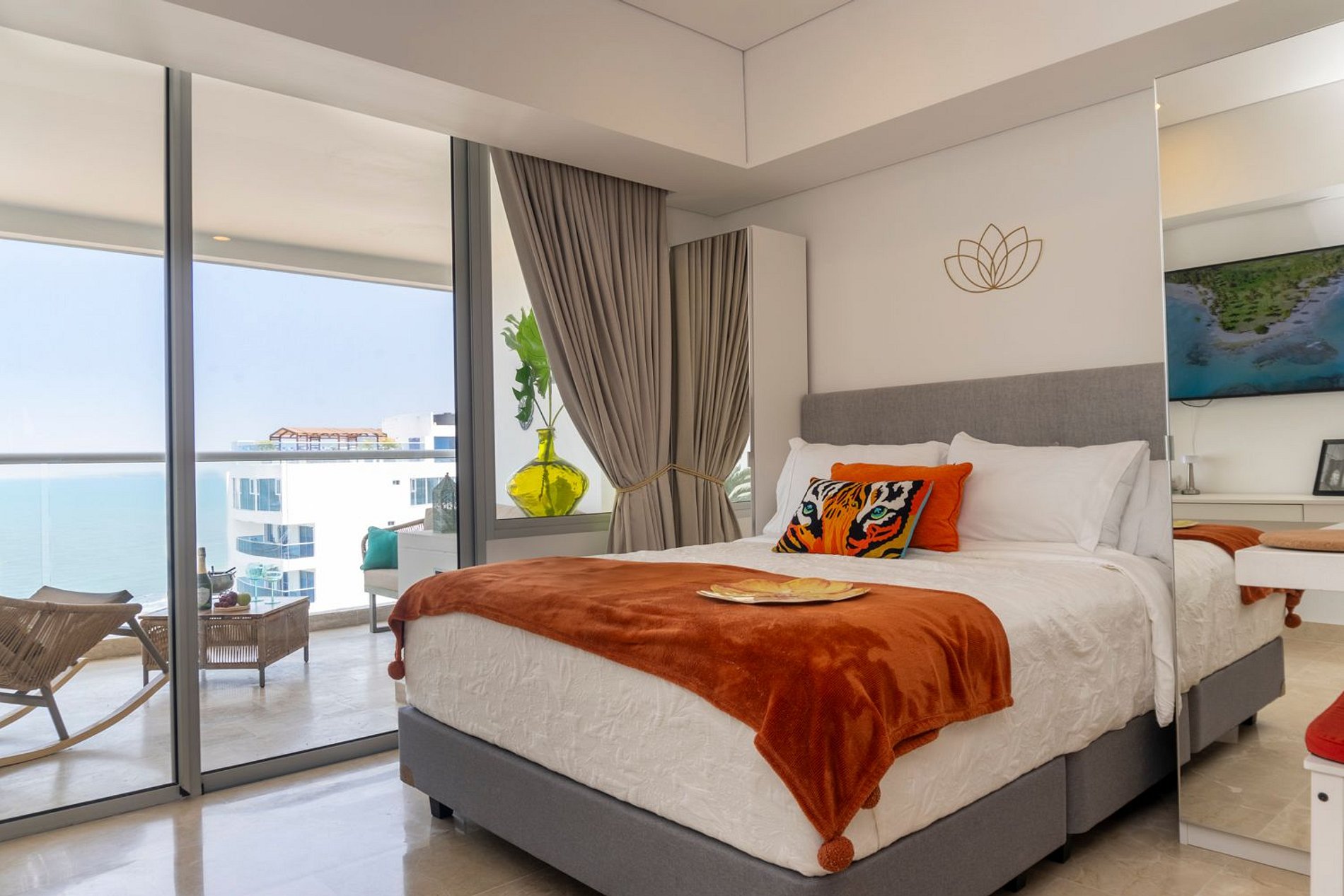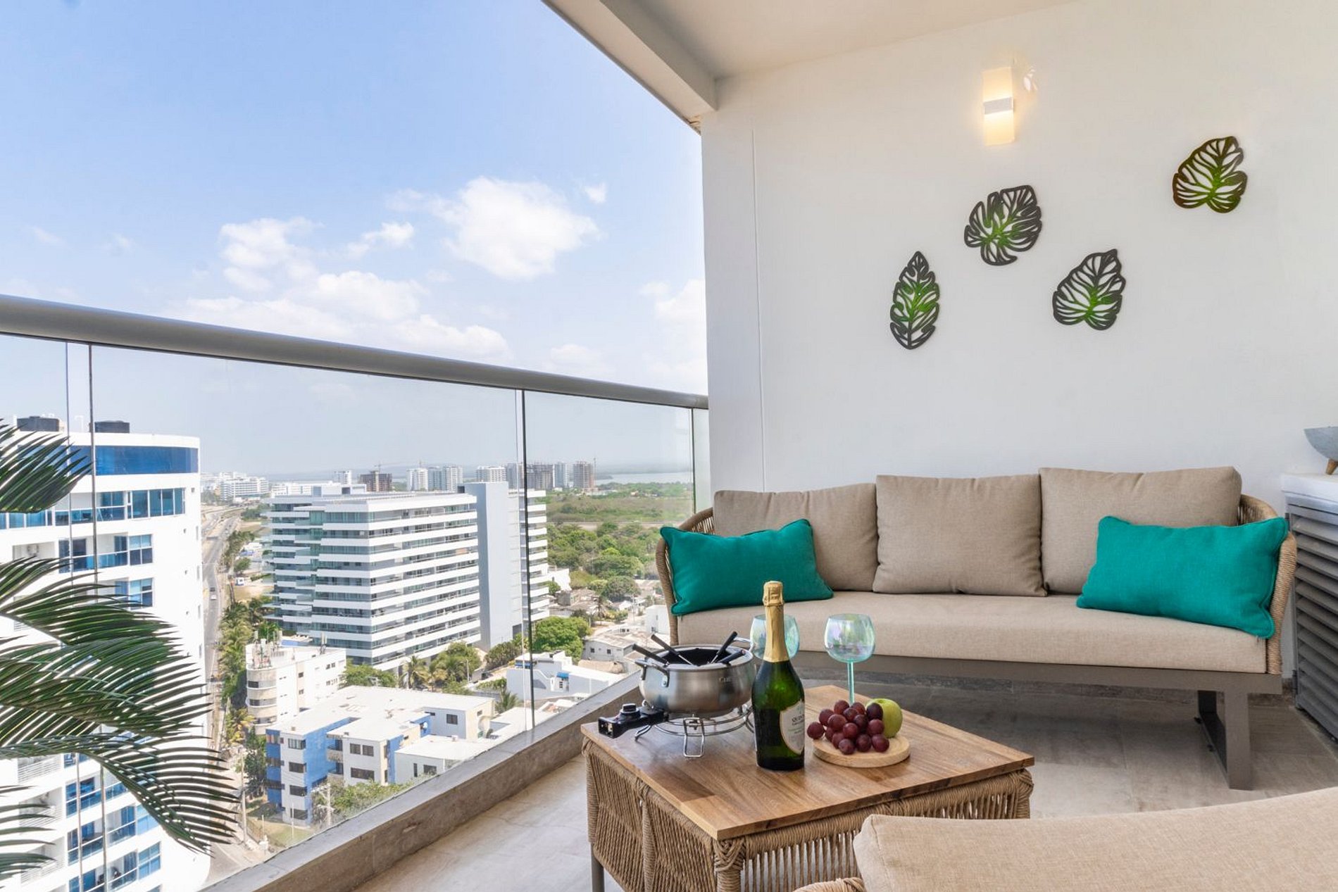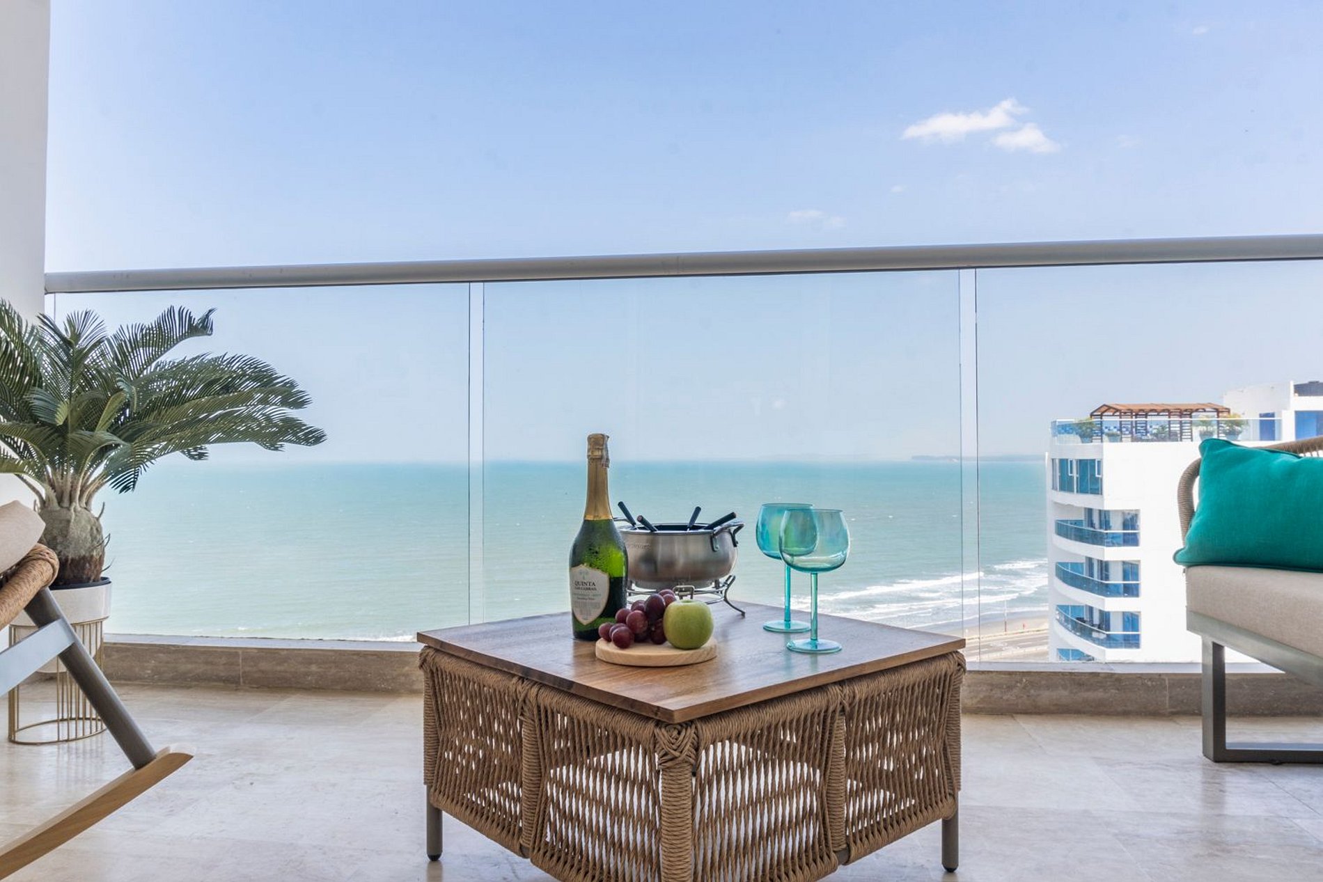 Suite moderna en piso 15 con balcón lounge amoblado y vista directa al mar. Cama Queen, sofá cama, cocina equipada, lavadora, Smart TV y aire acondicionado. Ideal para 4 huéspedes que buscan confort, estilo y atardeceres caribeños.