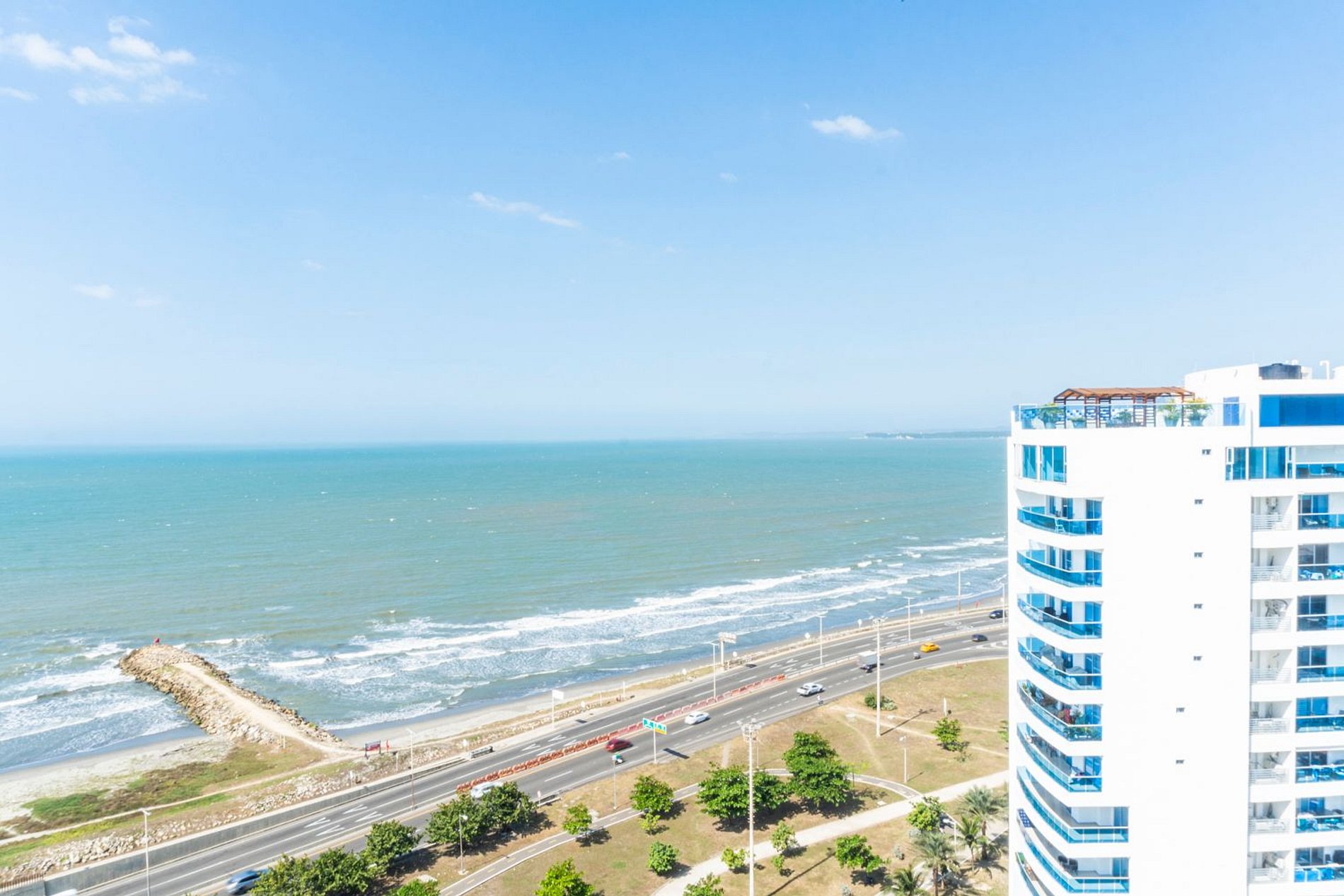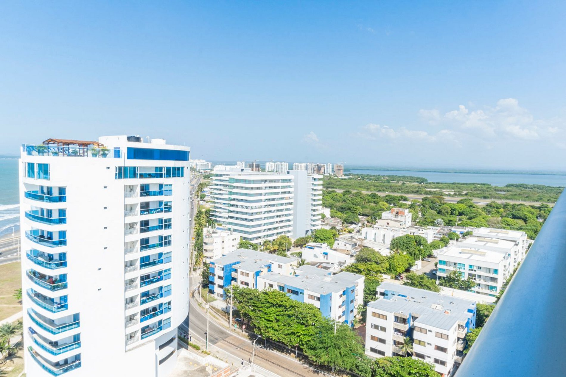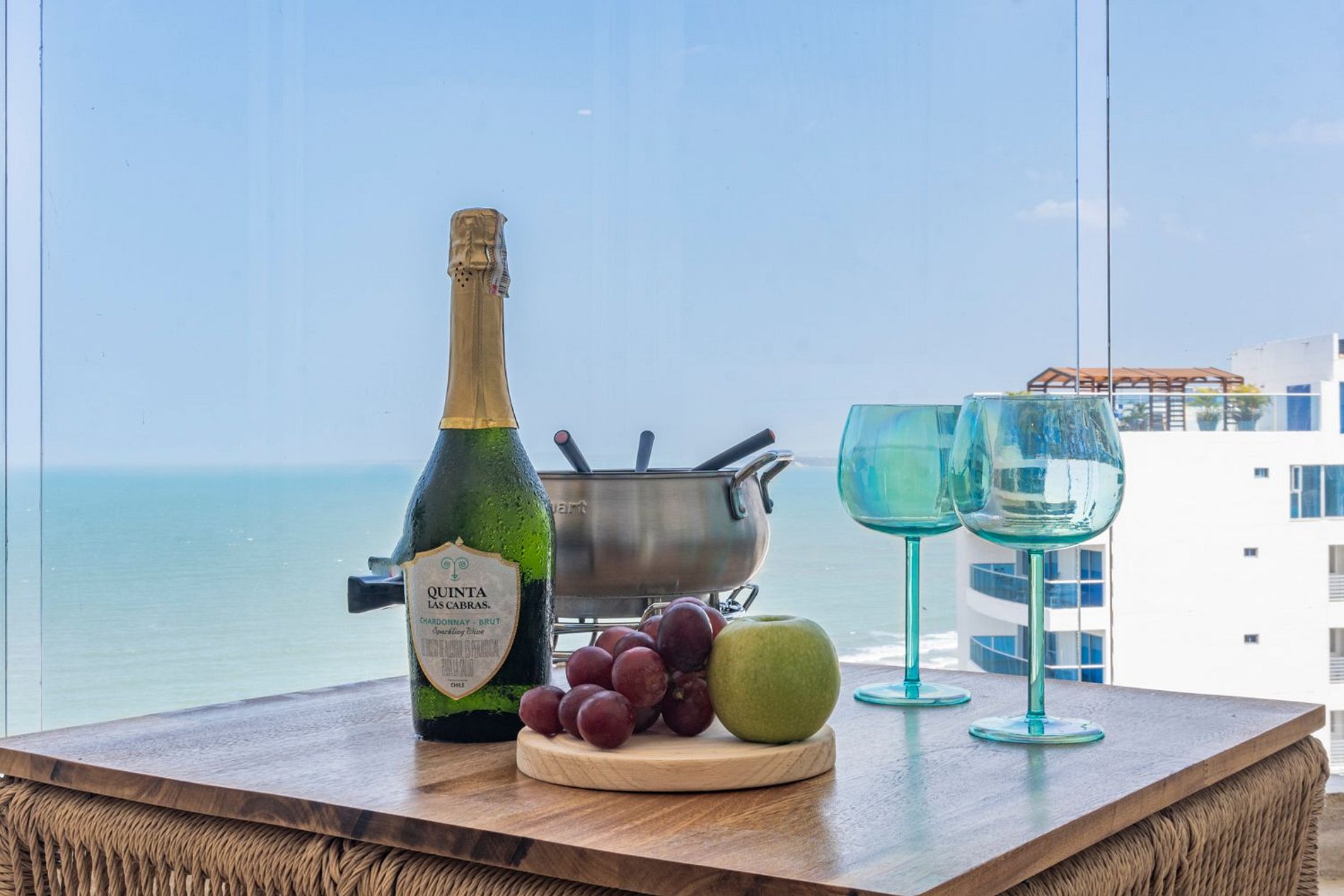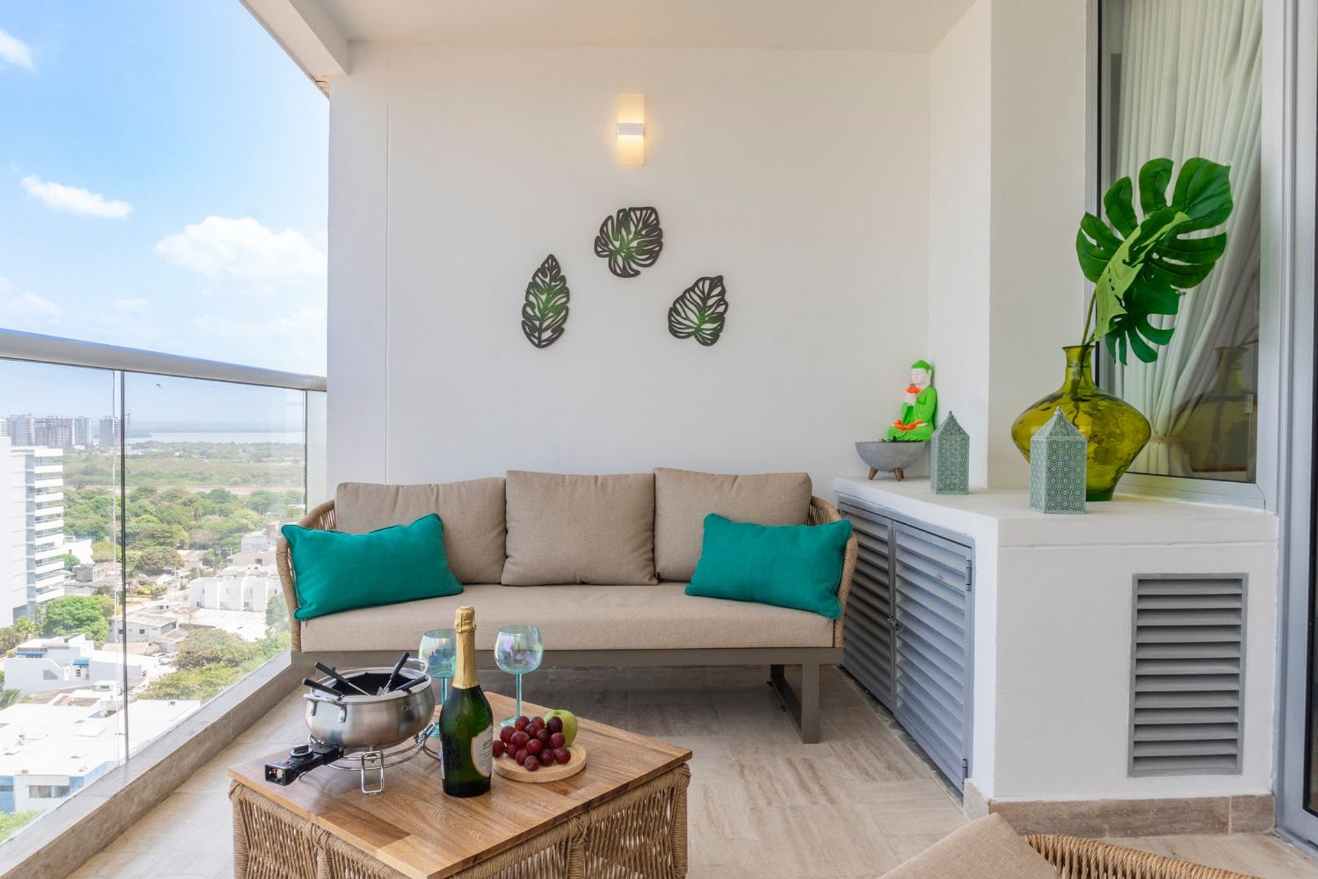 Suite moderna en piso 15 con balcón lounge amoblado y vista directa al mar. Cama Queen, sofá cama, cocina equipada, lavadora, Smart TV y aire acondicionado. Ideal para 4 huéspedes que buscan confort, estilo y atardeceres caribeños.