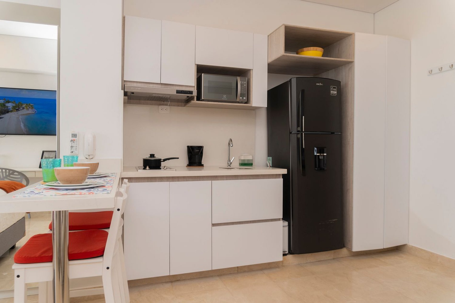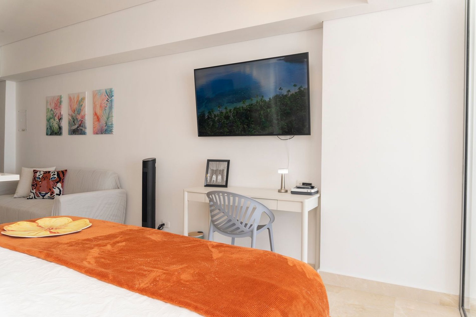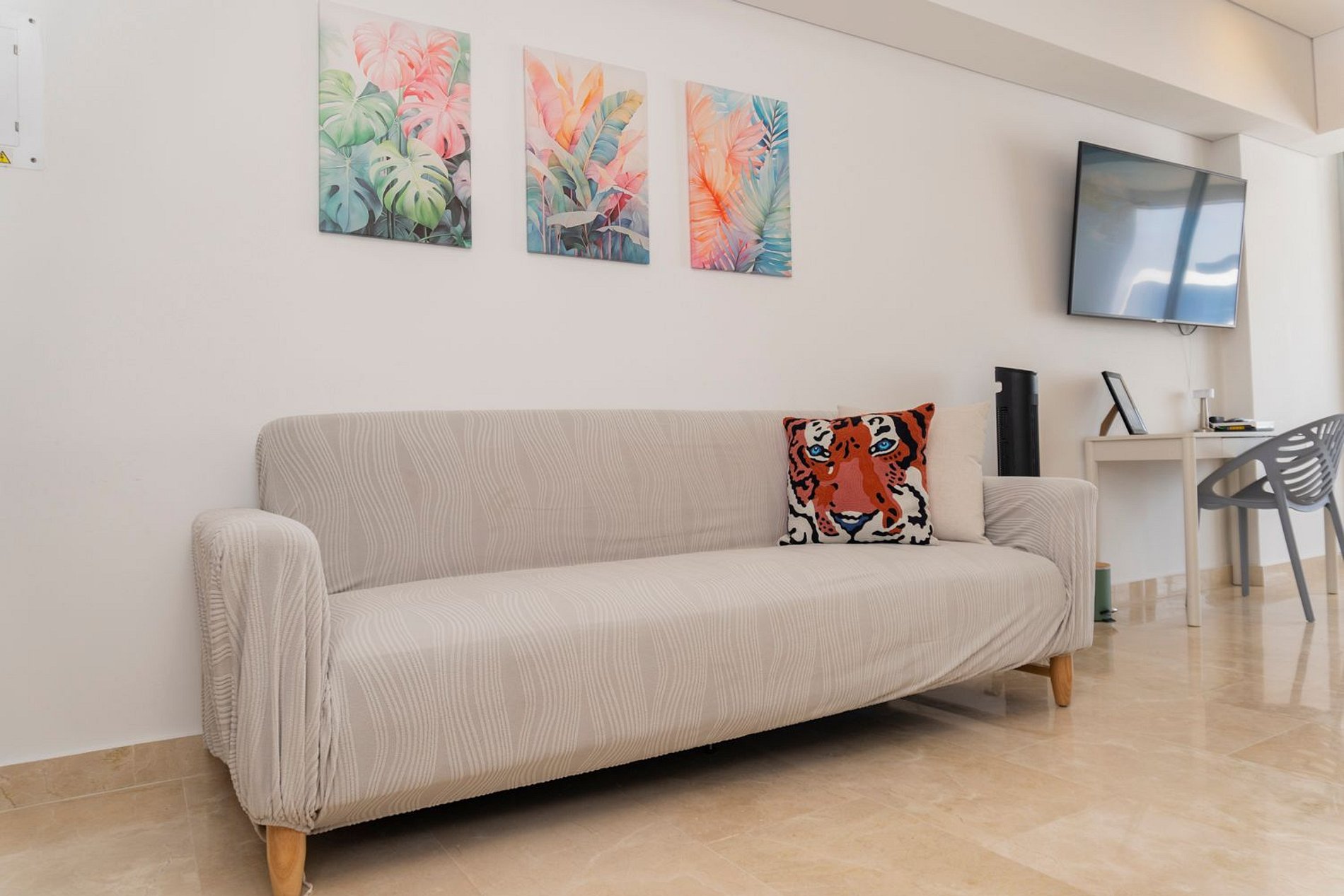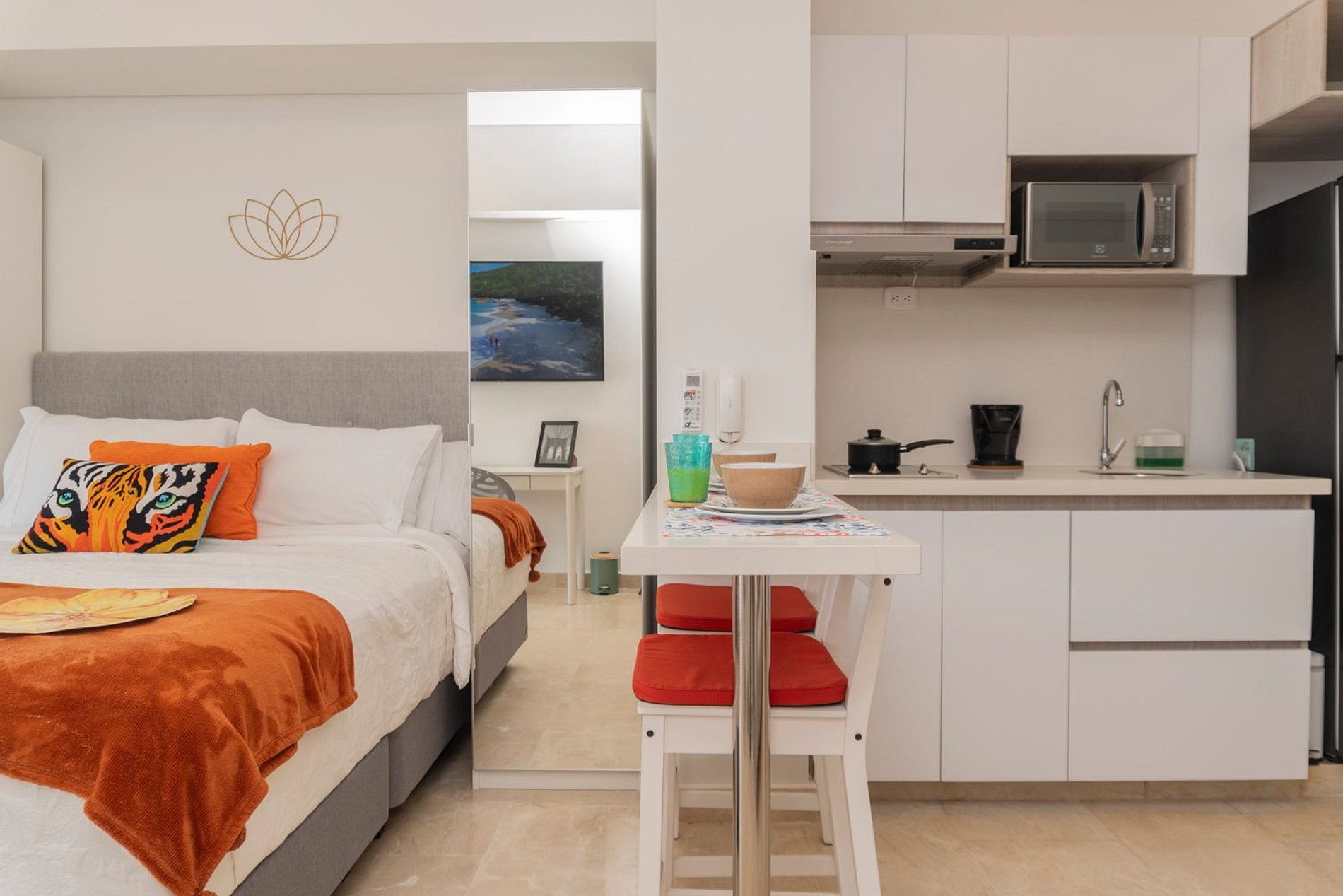 Disfruta esta suite en piso 15 con espectacular vista al mar desde su balcón lounge amoblado con sofá y mesa. Capacidad hasta 3 huéspedes con cama Queen y sofá cama. Interior moderno con detalles tropicales, Smart TV, escritorio de trabajo y cocina equipada con nevera, microondas, cafetera y menaje completo. Incluye lavadora, aire acondicionado y cerradura digital. Vive el Caribe con confort y estilo, en edificio con piscina, jacuzzi y zonas sociales. A 2 min del aeropuerto y 10 min del centro