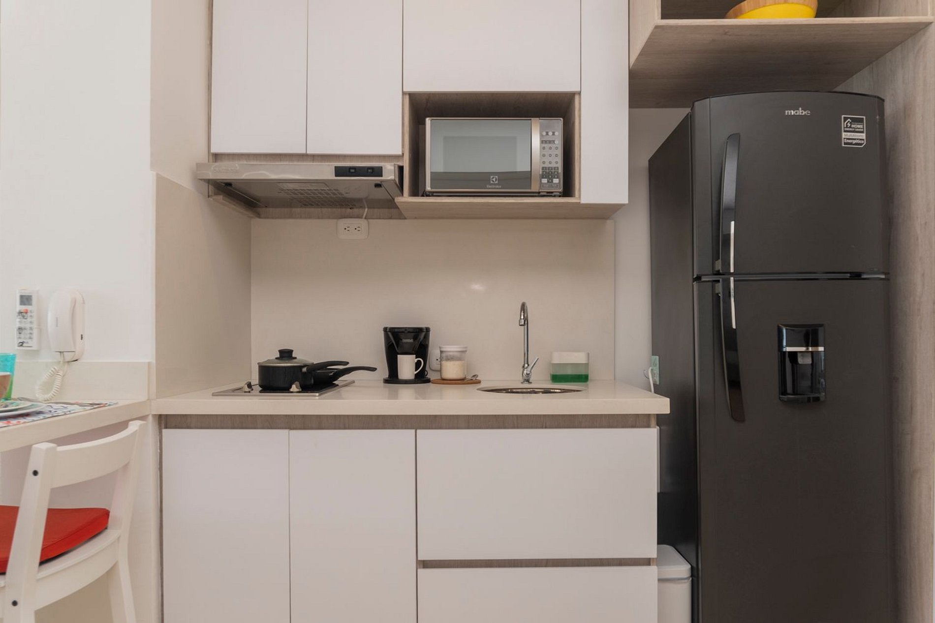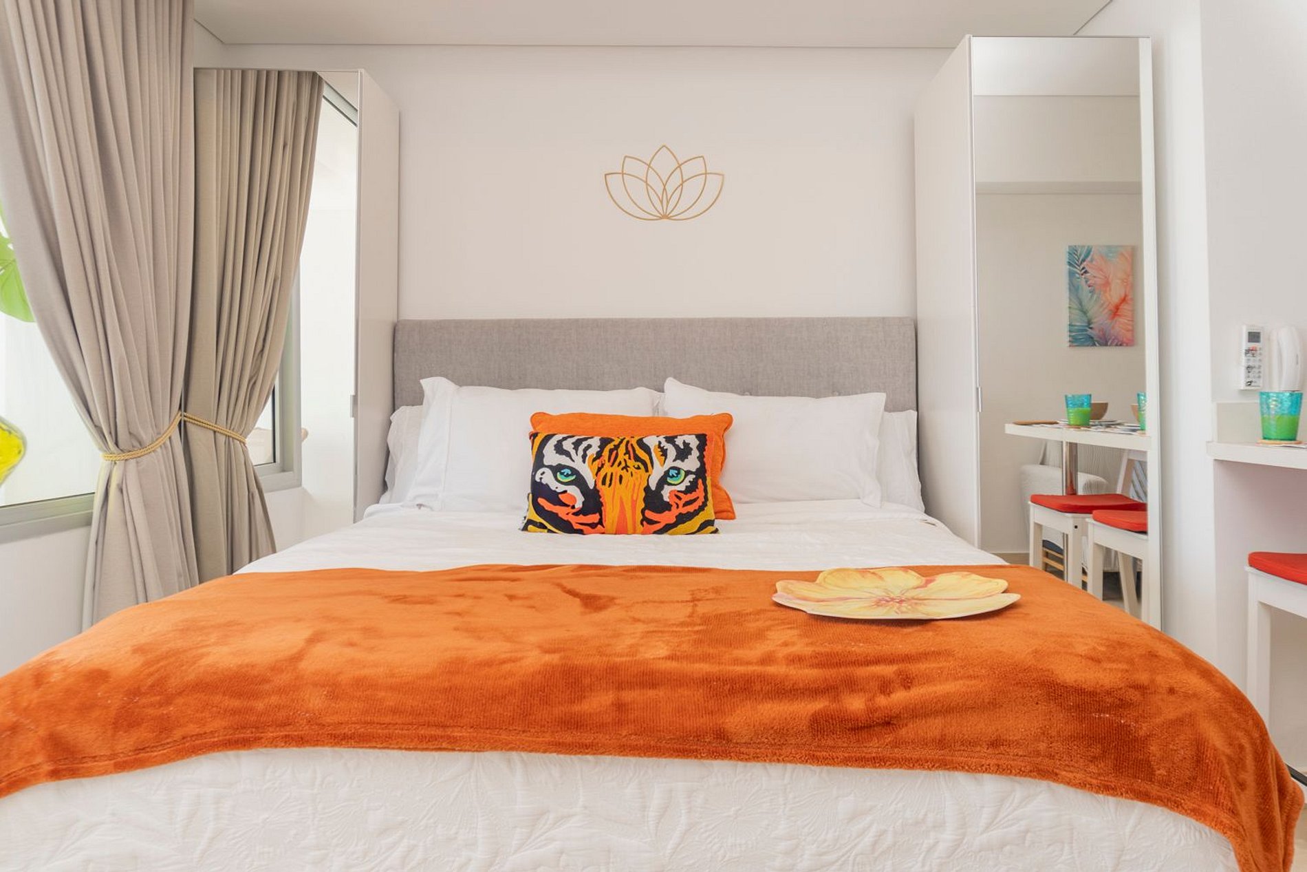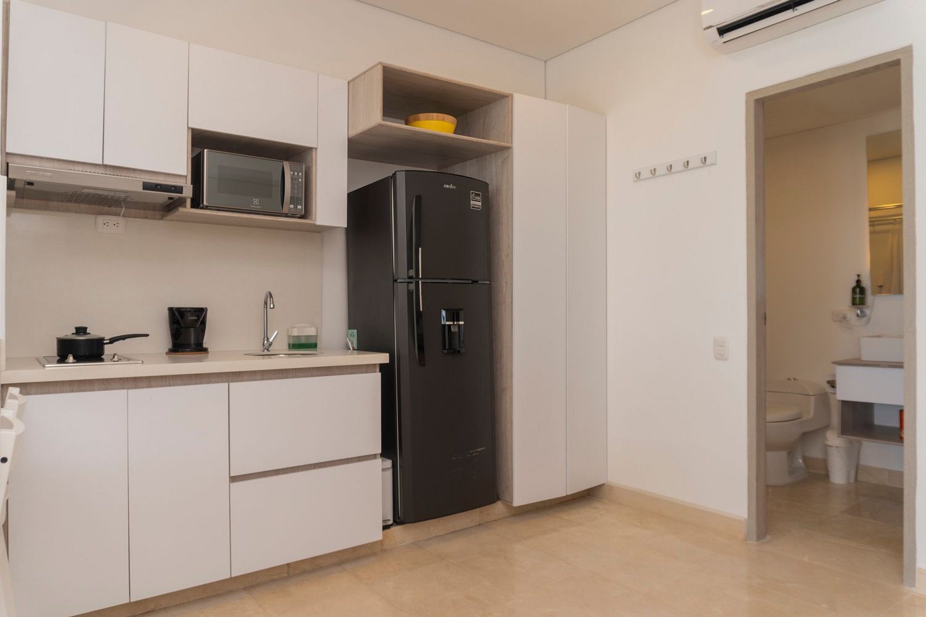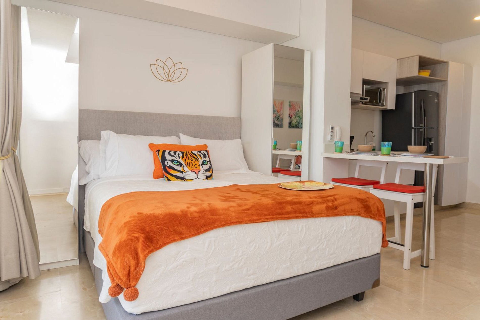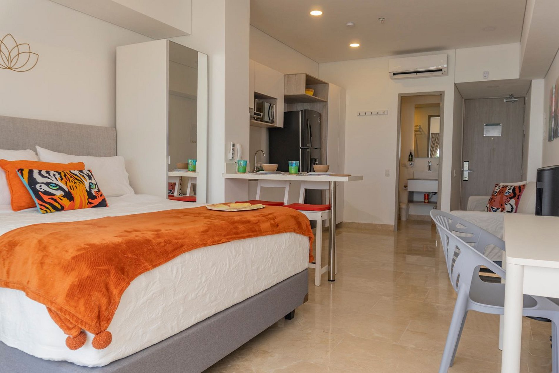 Disfruta esta suite en piso 15 con espectacular vista al mar desde su balcón lounge amoblado con sofá y mesa. Capacidad hasta 3 huéspedes con cama Queen y sofá cama. Interior moderno con detalles tropicales, Smart TV, escritorio de trabajo y cocina equipada con nevera, microondas, cafetera y menaje completo. Incluye lavadora, aire acondicionado y cerradura digital. Vive el Caribe con confort y estilo, en edificio con piscina, jacuzzi y zonas sociales. A 2 min del aeropuerto y 10 min del centro