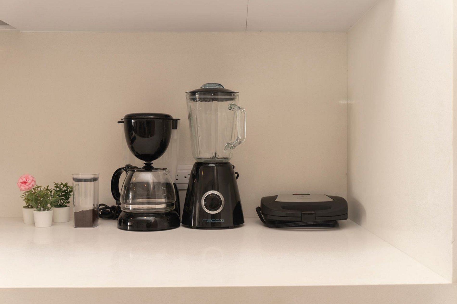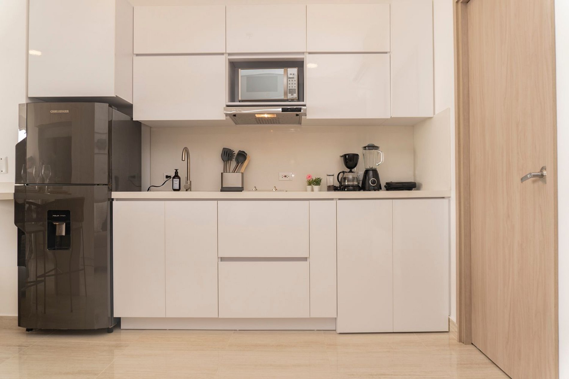 • Cocina equipada: nevera, estufa, microondas, cafetera, licuadora y menaje completo