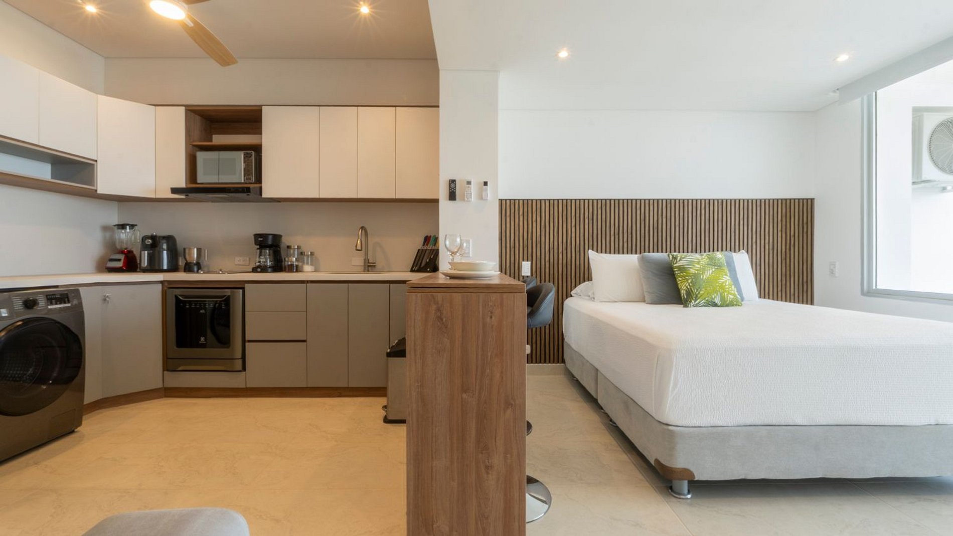 Vive una experiencia única en este ApartaSuite del piso 16 con balcón XL y un espectacular daybed para relajarte. Disfruta de la vista panorámica al mar y la ciudad desde un espacio moderno y luminoso con cama Queen, sofá cama, cocina equipada con horno, microondas, licuadora y air fryer, lavadora, Smart TV y wifi. Perfecto para 3 huéspedes, con aire acondicionado, ventilador de techo y cerradura digital. El edificio cuenta con piscina y zonas sociales, a pasos de la playa y cerca del aeropuerto