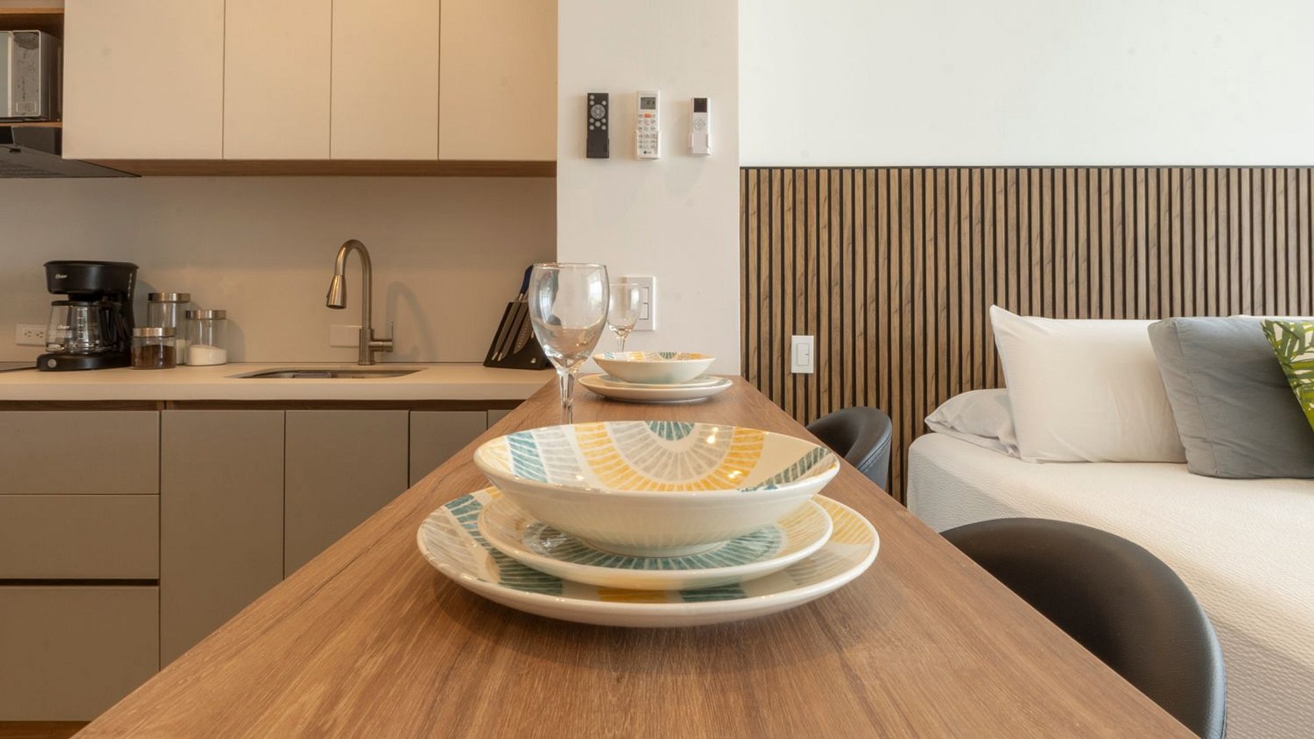Suite moderna en piso alto con balcón XL y un espectacular daybed lounge para relajarte con vista al mar y la ciudad. Ideal para 3 huéspedes, con cocina completa, lavadora, Smart TV y wifi rápido.