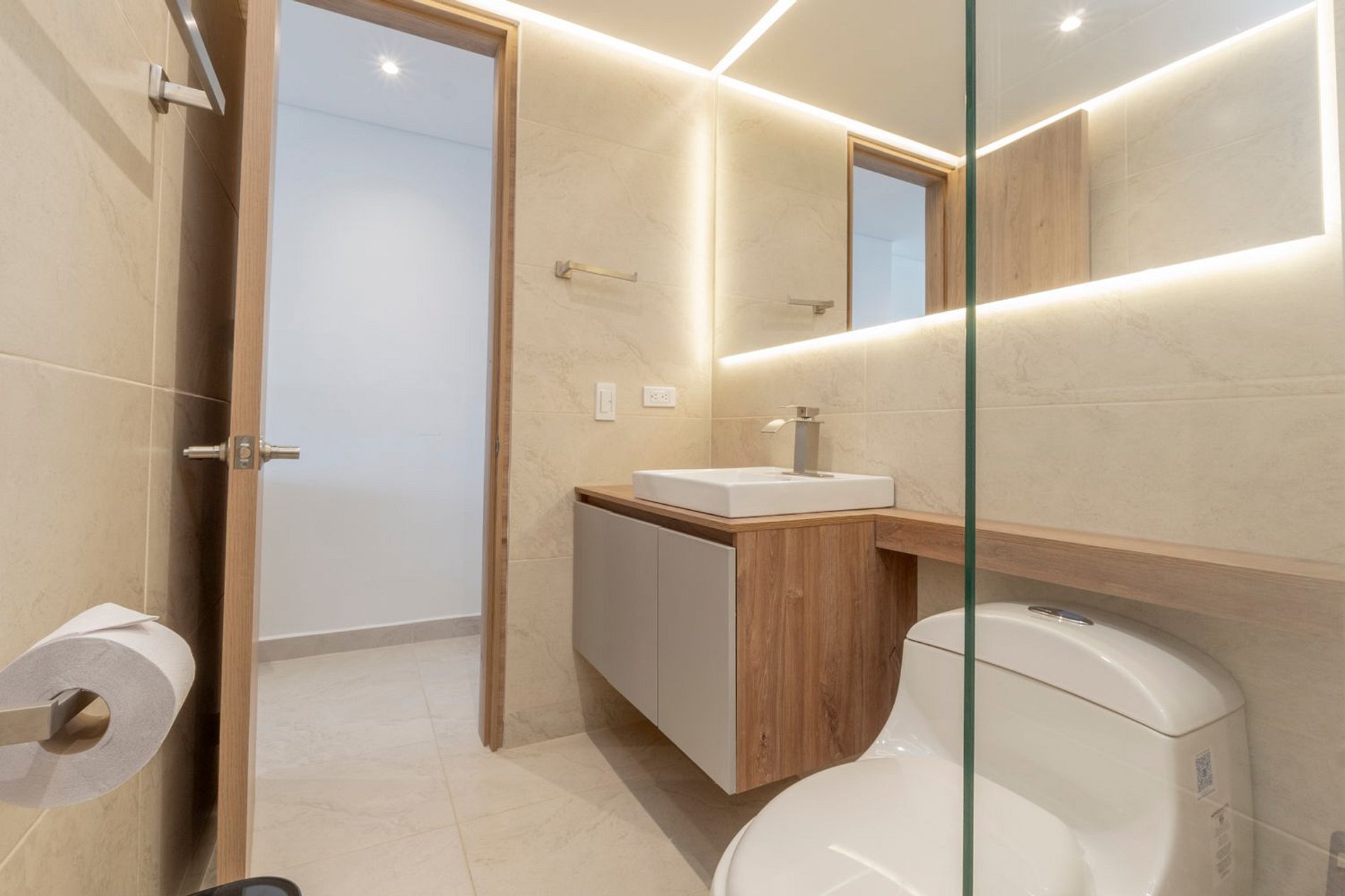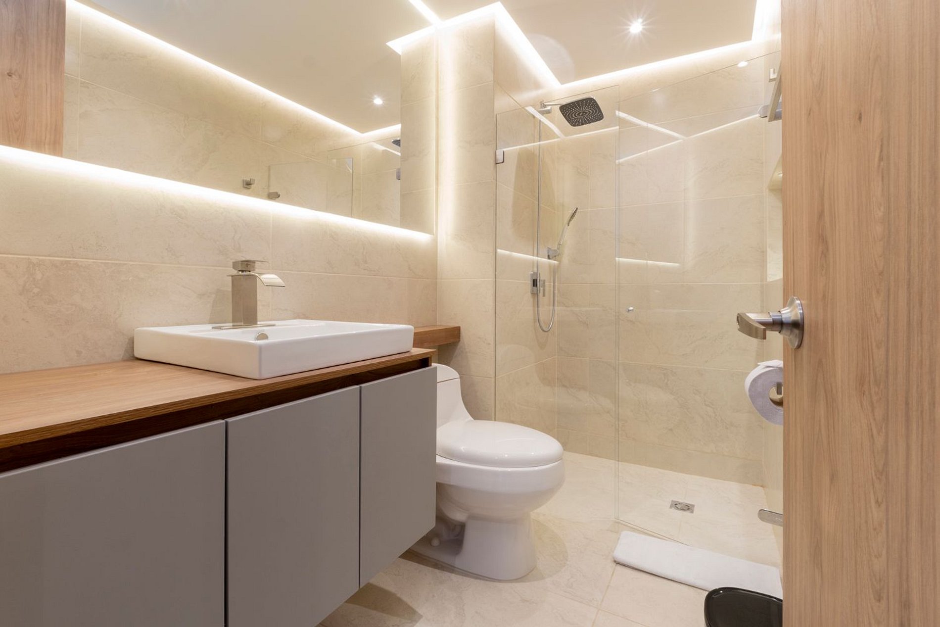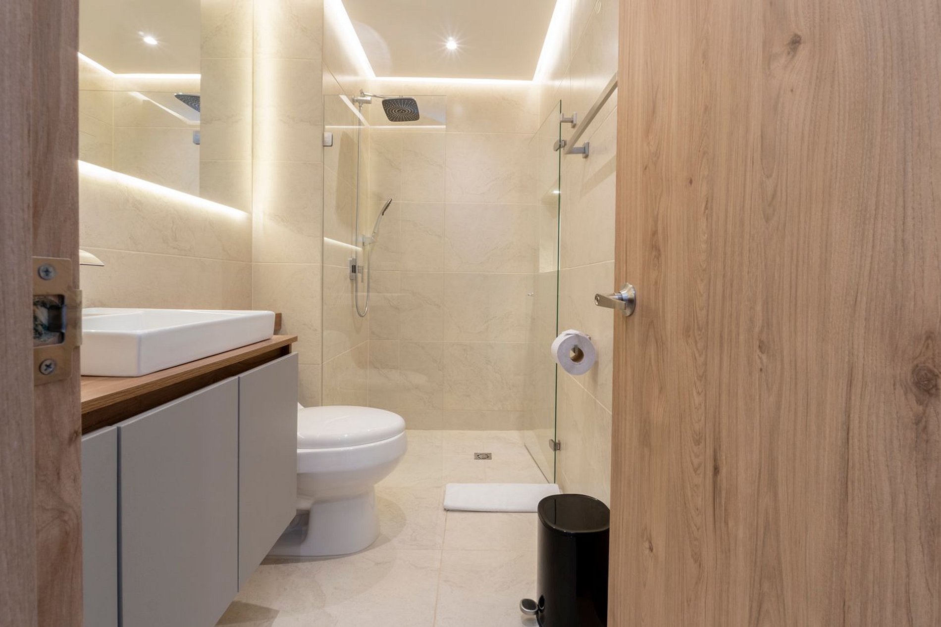 • Baño contemporáneo con ducha en vidrio y acabados modernos